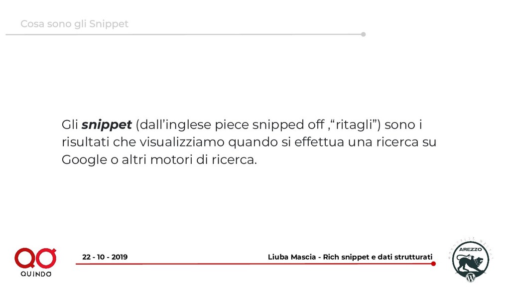 10 - 2019 Gli snippet (dall’inglese piece snipped off ,“ritagli”) sono i risultati che visualizziamo quando si effettua una ricerca su Google o altri motori di ricerca.