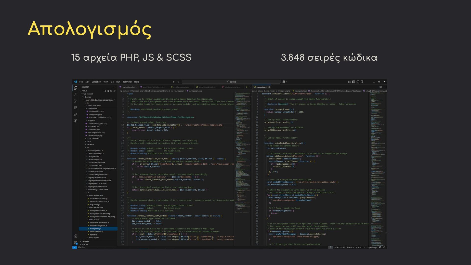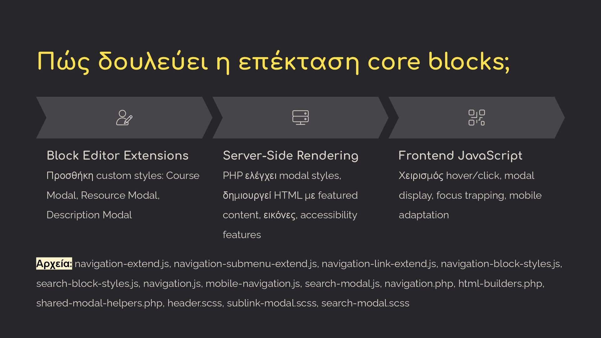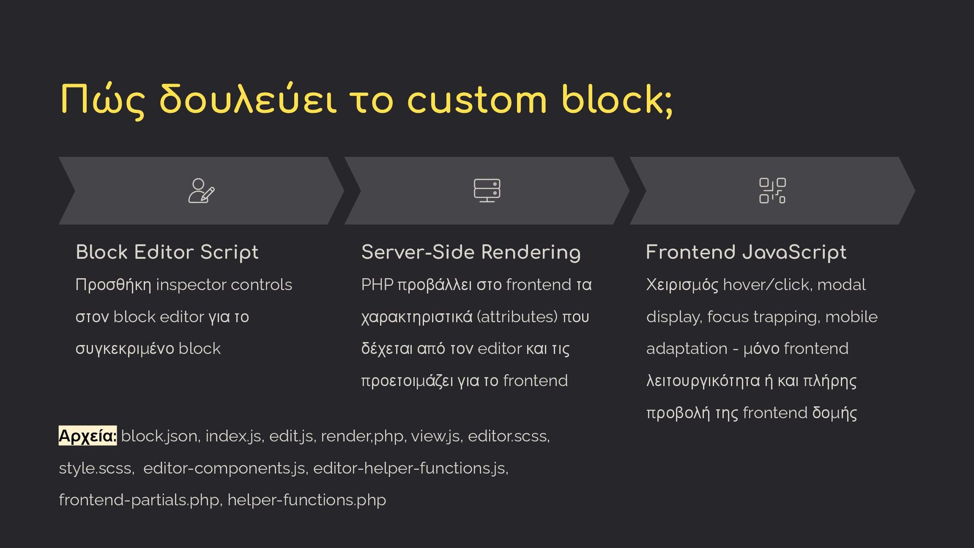 controls στον block editor για το συγκεκριμένο block Server-Side Rendering PHP προβάλλει στο frontend τα χαρακτηριστικά (attributes) που δέχεται από τον editor και τις προετοιμάζει για το frontend Frontend JavaScript Χειρισμός hover/click, modal display, focus trapping, mobile adaptation - μόνο frontend λειτουργικότητα ή και πλήρης προβολή της frontend δομής Αρχεία: block.json, index.js, edit.js, render,php, view.js, editor.scss, style.scss, editor-components.js, editor-helper-functions.js, frontend-partials.php, helper-functions.php