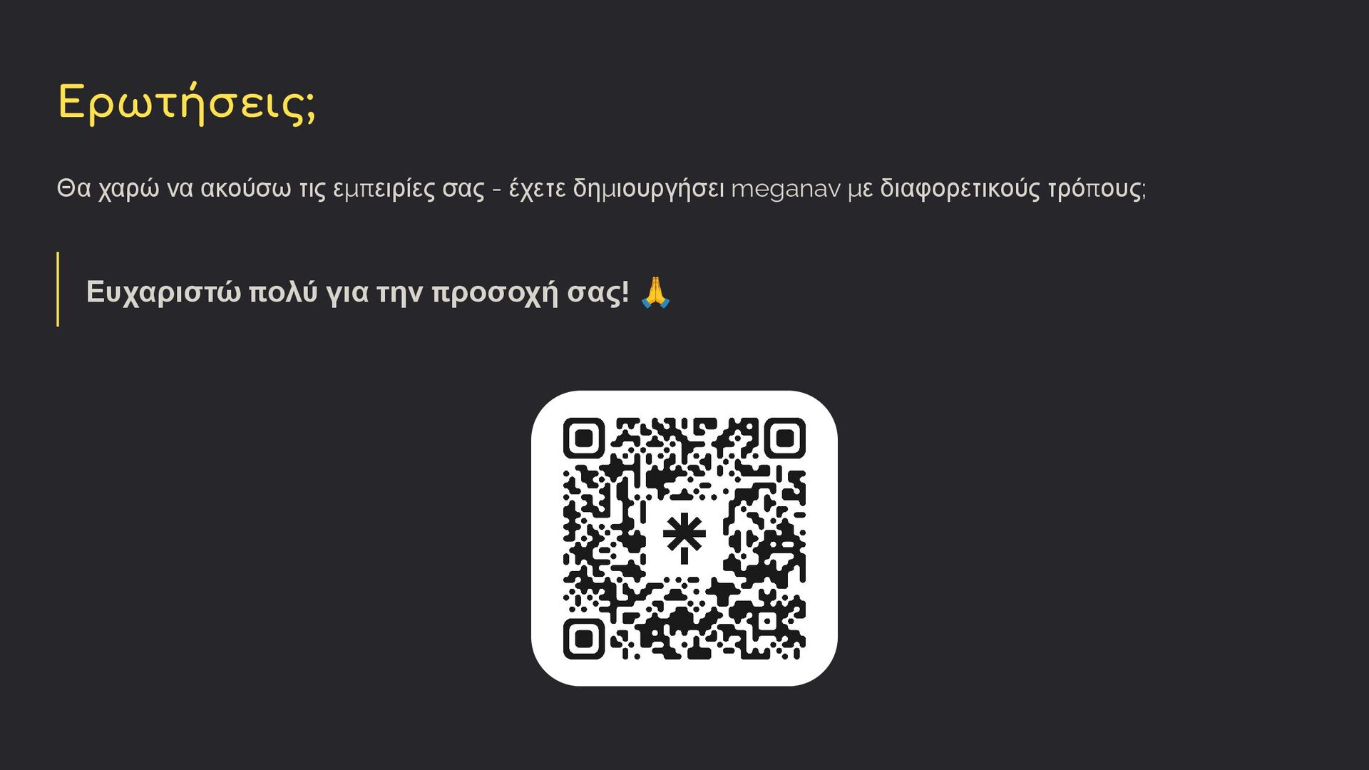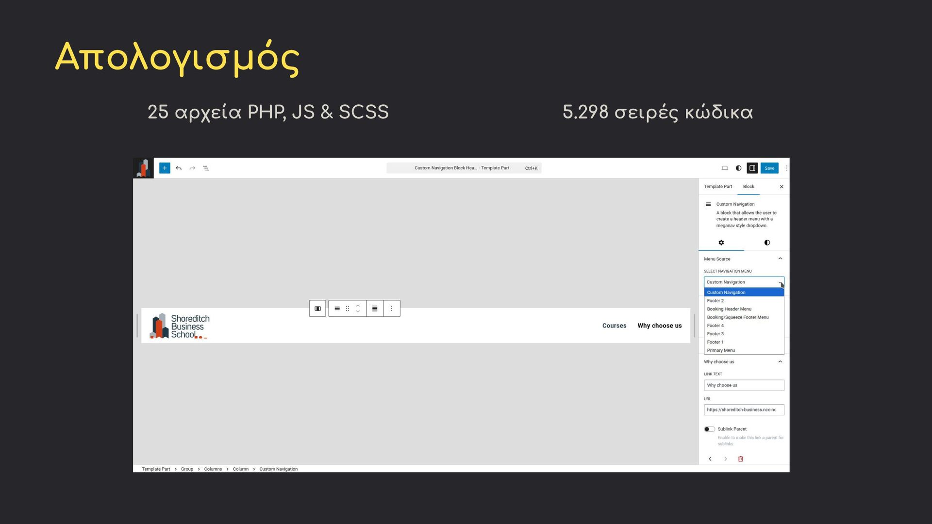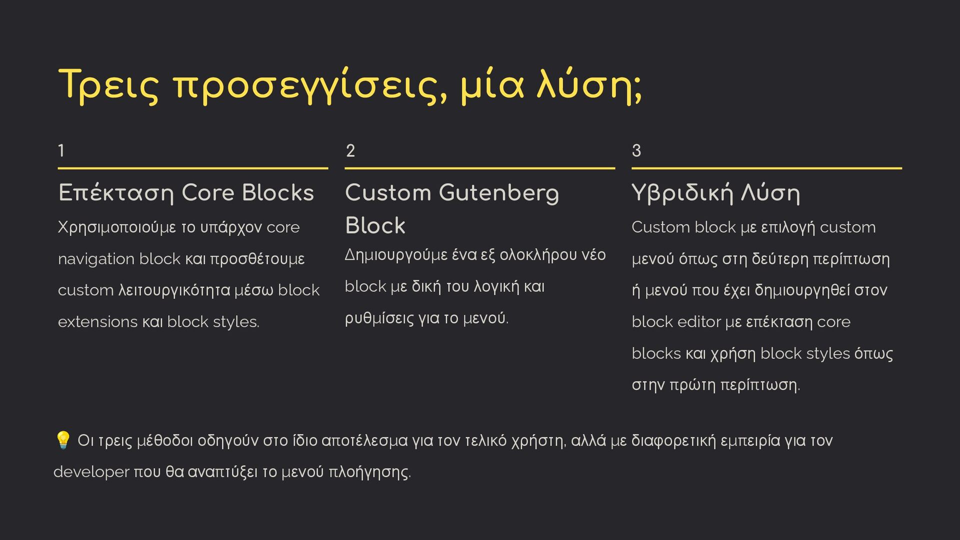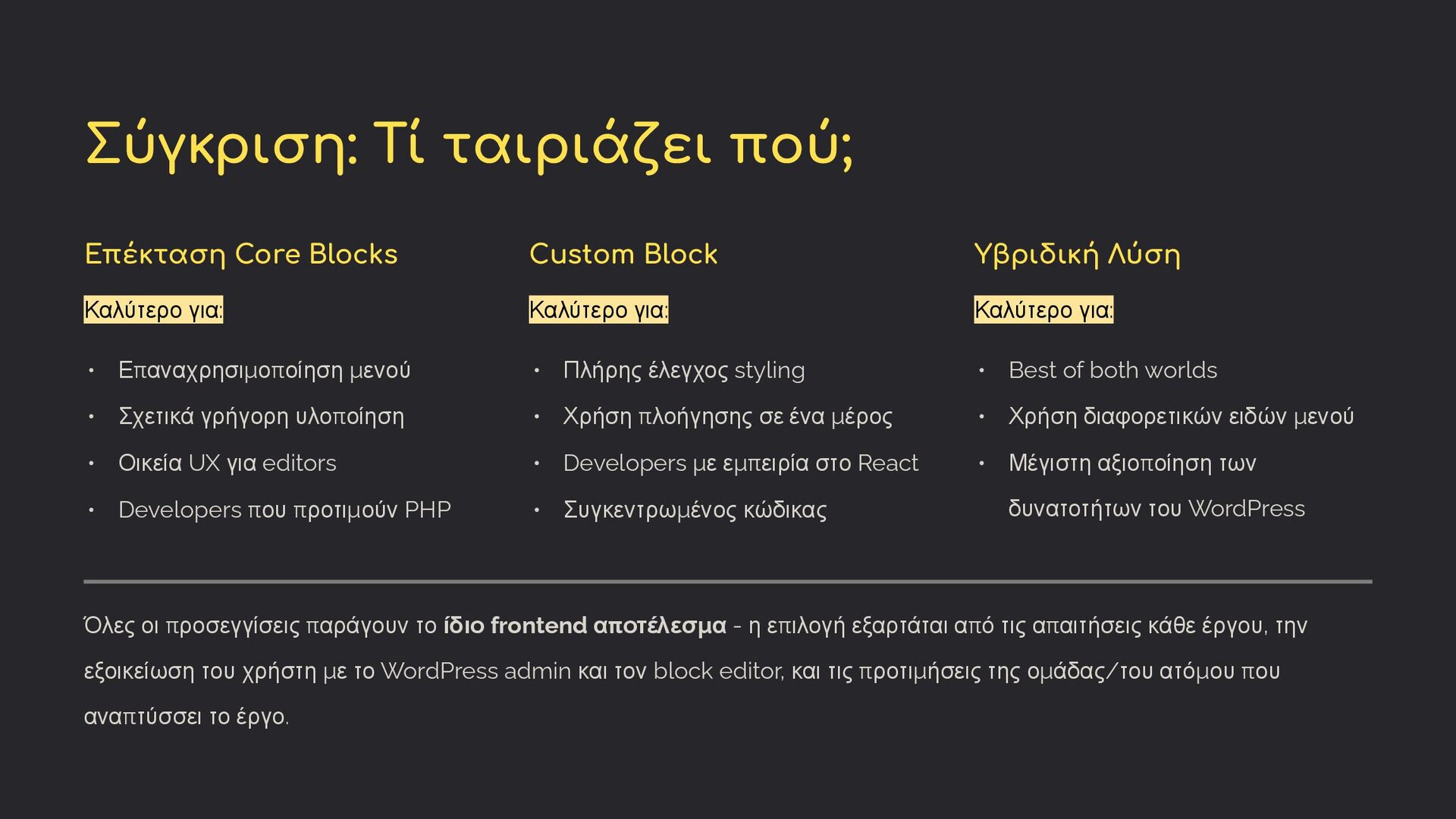 Επαναχρησιμοποίηση μενού • Σχετικά γρήγορη υλοποίηση • Οικεία UX για editors • Developers που προτιμούν PHP Custom Block Καλύτερο για: • Πλήρης έλεγχος styling • Χρήση πλοήγησης σε ένα μέρος • Developers με εμπειρία στο React • Συγκεντρωμένος κώδικας Υβριδική Λύση Καλύτερο για: • Best of both worlds • Χρήση διαφορετικών ειδών μενού • Μέγιστη αξιοποίηση των δυνατοτήτων του WordPress Όλες οι προσεγγίσεις παράγουν το ίδιο frontend αποτέλεσμα - η επιλογή εξαρτάται από τις απαιτήσεις κάθε έργου, την εξοικείωση του χρήστη με το WordPress admin και τον block editor, και τις προτιμήσεις της ομάδας/του ατόμου που αναπτύσσει το έργο.