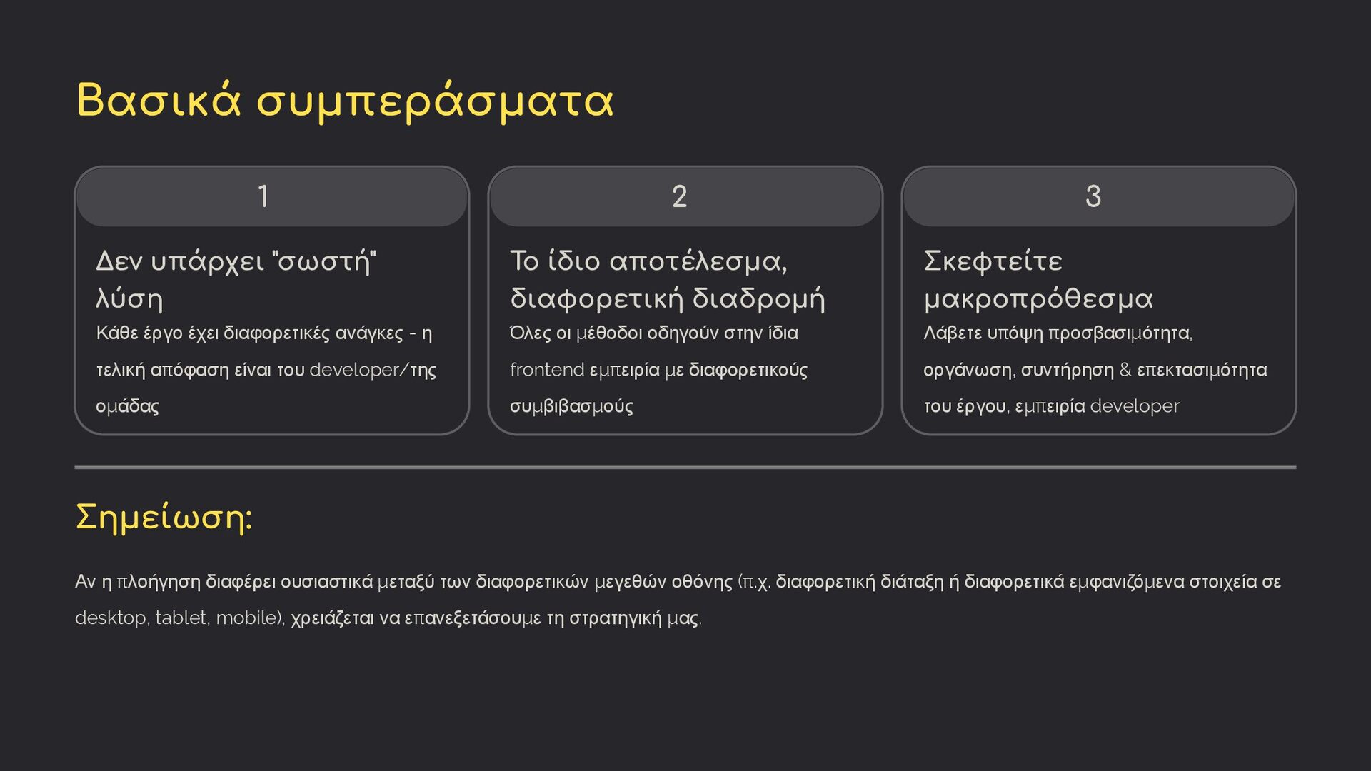 διαφορετικές ανάγκες - η τελική απόφαση είναι του developer/της ομάδας 2 Το ίδιο αποτέλεσμα, διαφορετική διαδρομή Όλες οι μέθοδοι οδηγούν στην ίδια frontend εμπειρία με διαφορετικούς συμβιβασμούς 3 Σκεφτείτε μακροπρόθεσμα Λάβετε υπόψη προσβασιμότητα, οργάνωση, συντήρηση & επεκτασιμότητα του έργου, εμπειρία developer Σημείωση: Αν η πλοήγηση διαφέρει ουσιαστικά μεταξύ των διαφορετικών μεγεθών οθόνης (π.χ. διαφορετική διάταξη ή διαφορετικά εμφανιζόμενα στοιχεία σε desktop, tablet, mobile), χρειάζεται να επανεξετάσουμε τη στρατηγική μας.