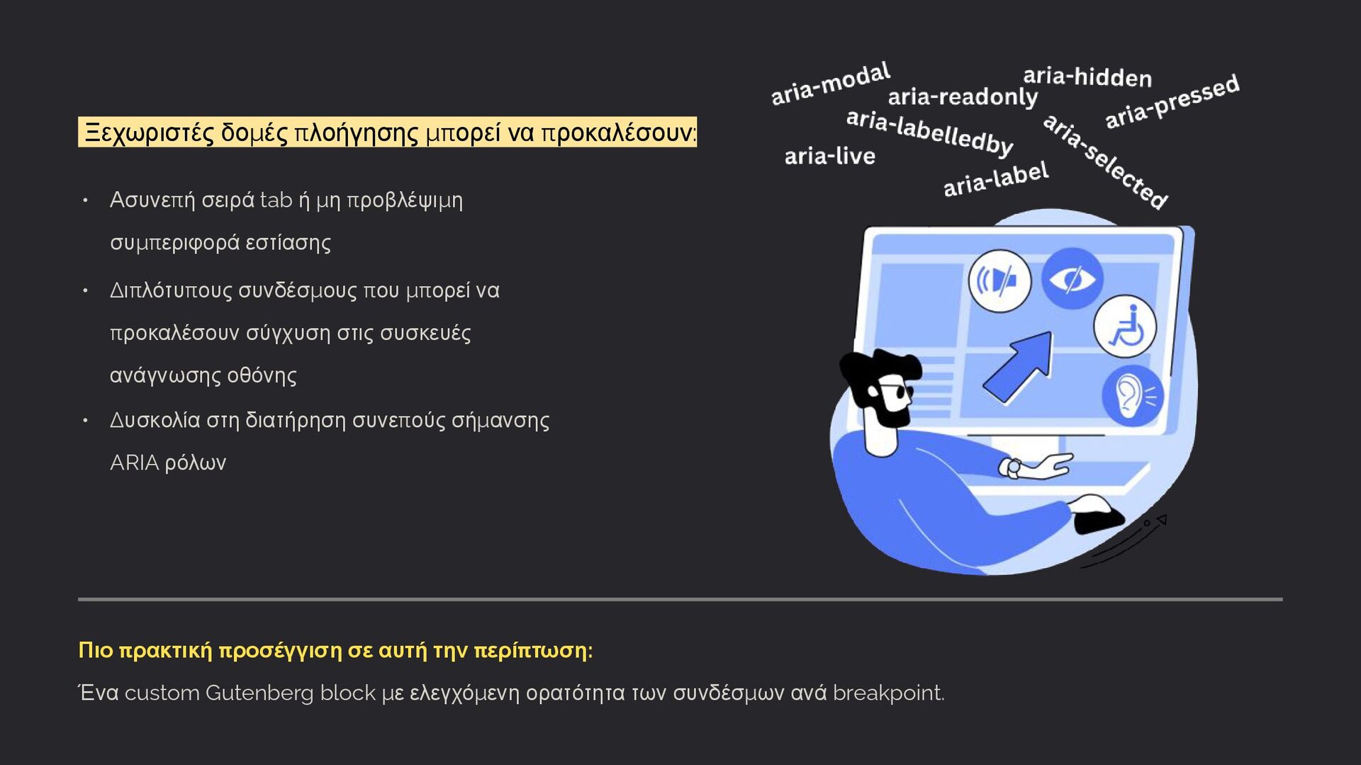 ή μη προβλέψιμη συμπεριφορά εστίασης • Διπλότυπους συνδέσμους που μπορεί να προκαλέσουν σύγχυση στις συσκευές ανάγνωσης οθόνης • Δυσκολία στη διατήρηση συνεπούς σήμανσης ARIA ρόλων Πιο πρακτική προσέγγιση σε αυτή την περίπτωση: Ένα custom Gutenberg block με ελεγχόμενη ορατότητα των συνδέσμων ανά breakpoint.