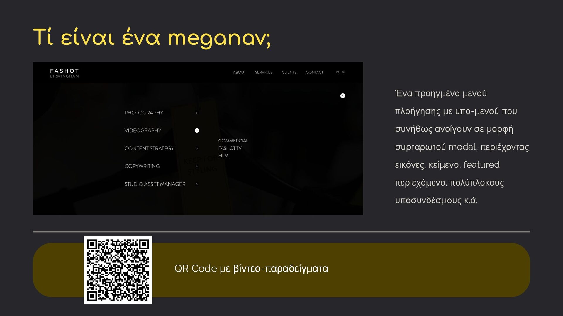 που συνήθως ανοίγουν σε μορφή συρταρωτού modal, περιέχοντας εικόνες, κείμενο, featured περιεχόμενο, πολύπλοκους υποσυνδέσμους κ.ά. QR Code με βίντεο-παραδείγματα