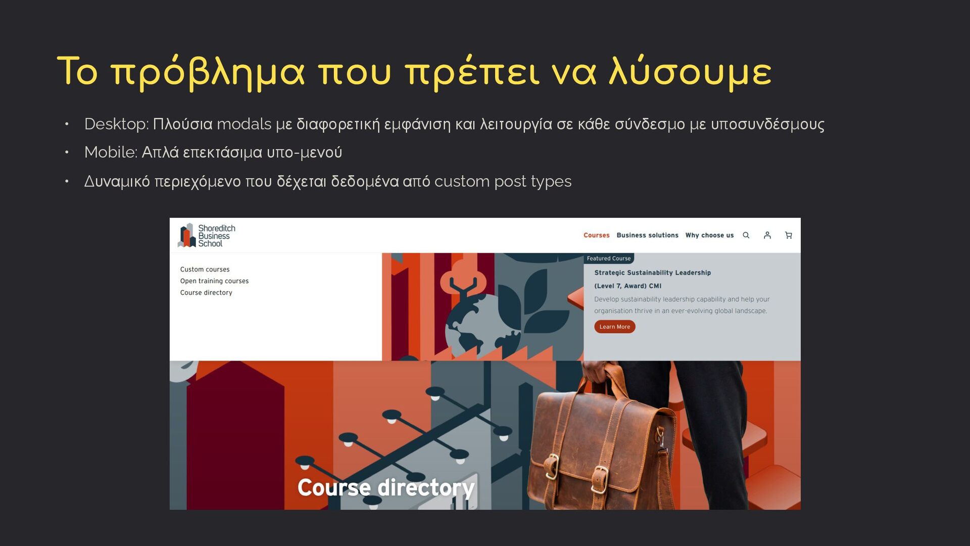 κάθε σύνδεσμο με υποσυνδέσμους • Mobile: Απλά επεκτάσιμα υπο-μενού • Δυναμικό περιεχόμενο που δέχεται δεδομένα από custom post types Το πρόβλημα που πρέπει να λύσουμε