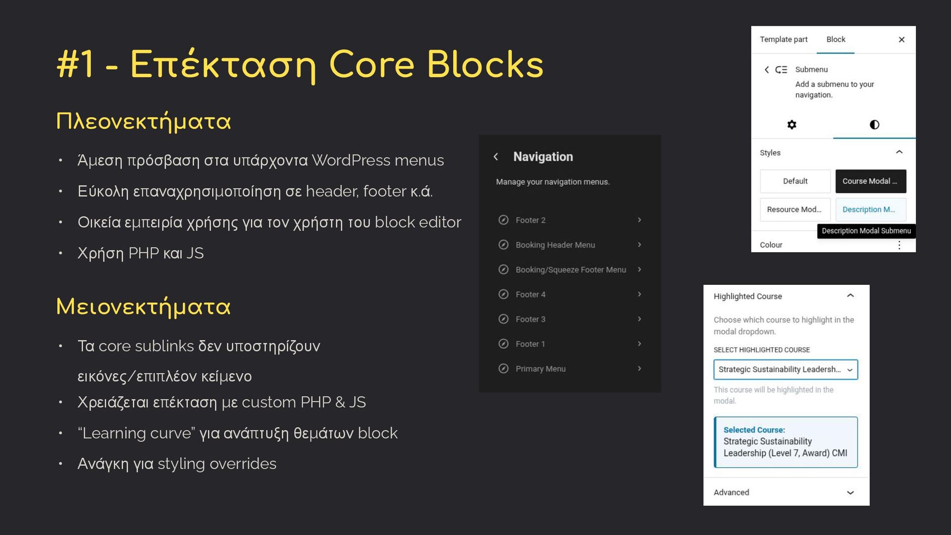 υπάρχοντα WordPress menus • Εύκολη επαναχρησιμοποίηση σε header, footer κ.ά. • Οικεία εμπειρία χρήσης για τον χρήστη του block editor • Χρήση PHP και JS Μειονεκτήματα • Τα core sublinks δεν υποστηρίζουν εικόνες/επιπλέον κείμενο • Χρειάζεται επέκταση με custom PHP & JS • “Learning curve” για ανάπτυξη θεμάτων block • Ανάγκη για styling overrides