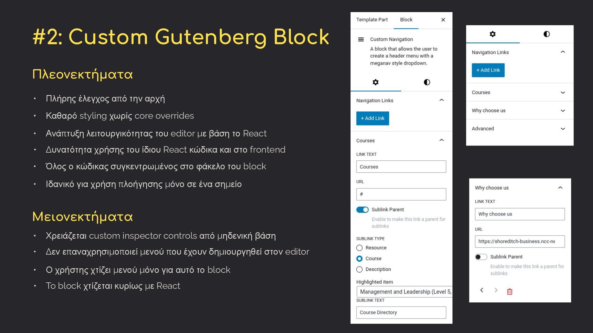 overrides • Ανάπτυξη λειτουργικότητας του editor με βάση το React • Όλος ο κώδικας συγκεντρωμένος στο φάκελο του block • Ιδανικό για χρήση πλοήγησης μόνο σε ένα σημείο Μειονεκτήματα • Χρειάζεται custom inspector controls από μηδενική βάση • Δεν επαναχρησιμοποιεί μενού που έχουν δημιουργηθεί στον editor • Ο χρήστης χτίζει μενού μόνο για αυτό το block • Πλήρης έλεγχος από την αρχή • • To block χτίζεται κυρίως με React • Δυνατότητα χρήσης του ίδιου React κώδικα και στο frontend