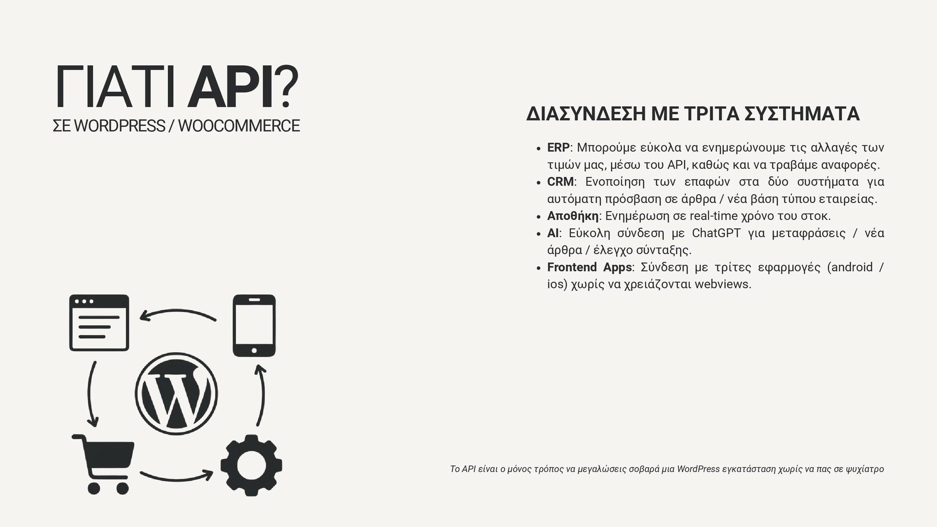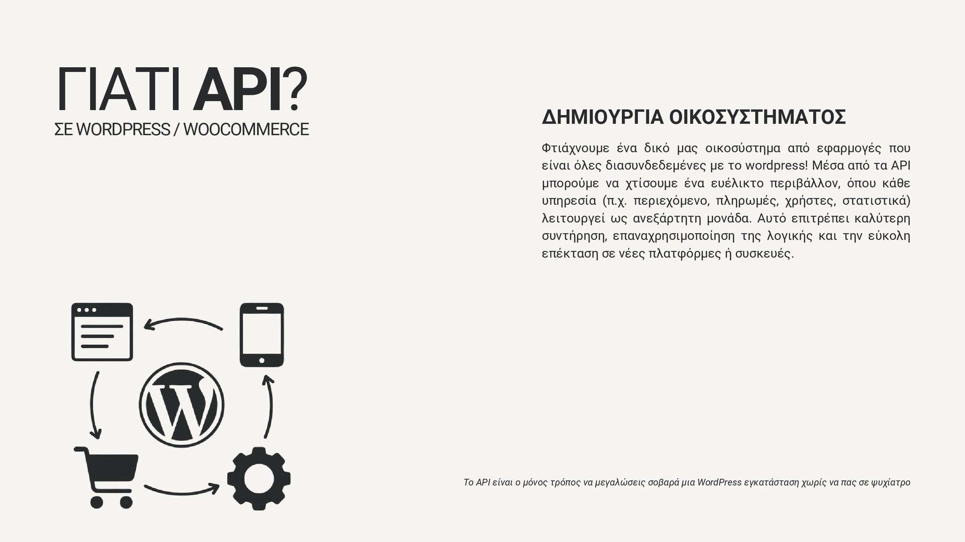 είναι όλες διασυνδεδεμένες με το wordpress! Μέσα από τα API μπορούμε να χτίσουμε ένα ευέλικτο περιβάλλον, όπου κάθε υπηρεσία (π.χ. περιεχόμενο, πληρωμές, χρήστες, στατιστικά) λειτουργεί ως ανεξάρτητη μονάδα. Αυτό επιτρέπει καλύτερη συντήρηση, επαναχρησιμοποίηση της λογικής και την εύκολη επέκταση σε νέες πλατφόρμες ή συσκευές. ΔΗΜΙΟΥΡΓΙΑ ΟΙΚΟΣΥΣΤΗΜΑΤΟΣ ΣΕ WORDPRESS / WOOCOMMERCE Το API είναι ο μόνος τρόπος να μεγαλώσεις σοβαρά μια WordPress εγκατάσταση χωρίς να πας σε ψυχίατρο