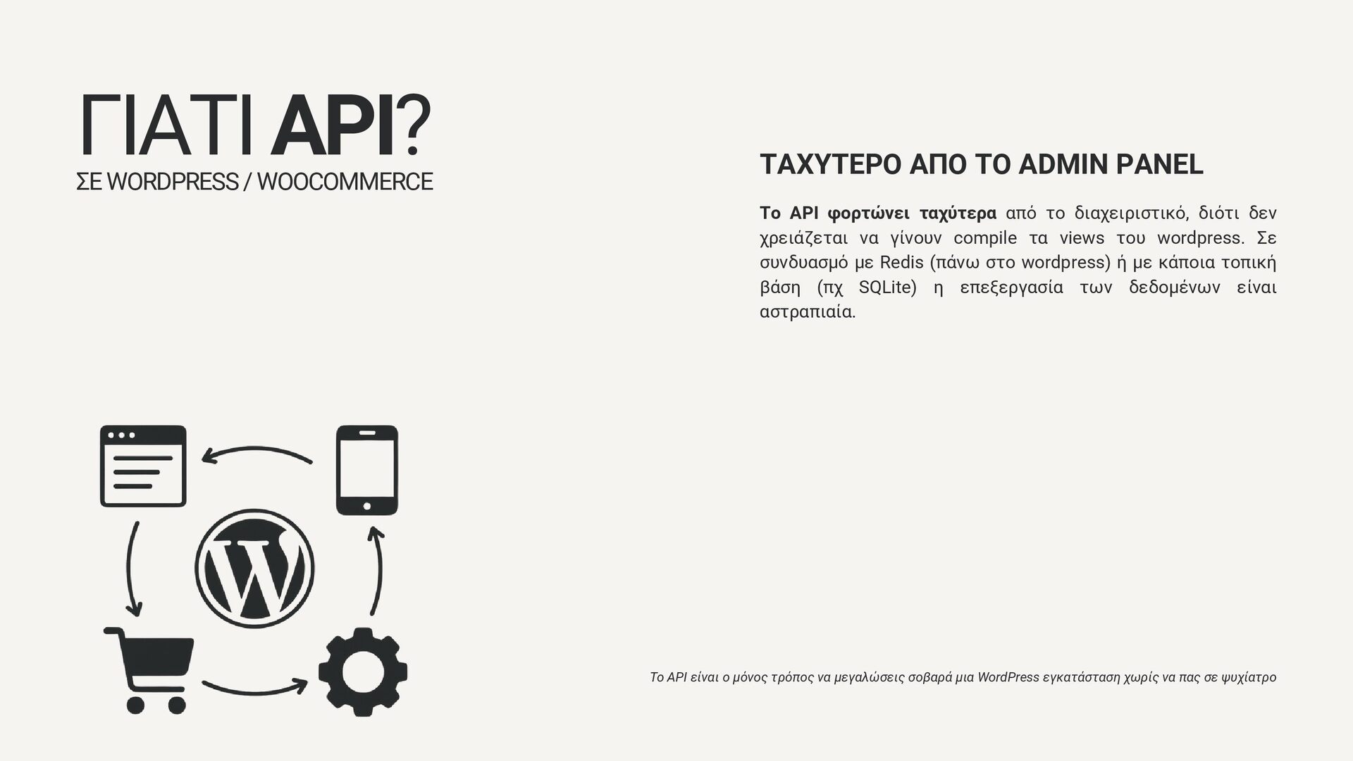 WOOCOMMERCE Το API φορτώνει ταχύτερα από το διαχειριστικό, διότι δεν χρειάζεται να γίνουν compile τα views του wordpress. Σε συνδυασμό με Redis (πάνω στο wordpress) ή με κάποια τοπική βάση (πχ SQLite) η επεξεργασία των δεδομένων είναι αστραπιαία. Το API είναι ο μόνος τρόπος να μεγαλώσεις σοβαρά μια WordPress εγκατάσταση χωρίς να πας σε ψυχίατρο