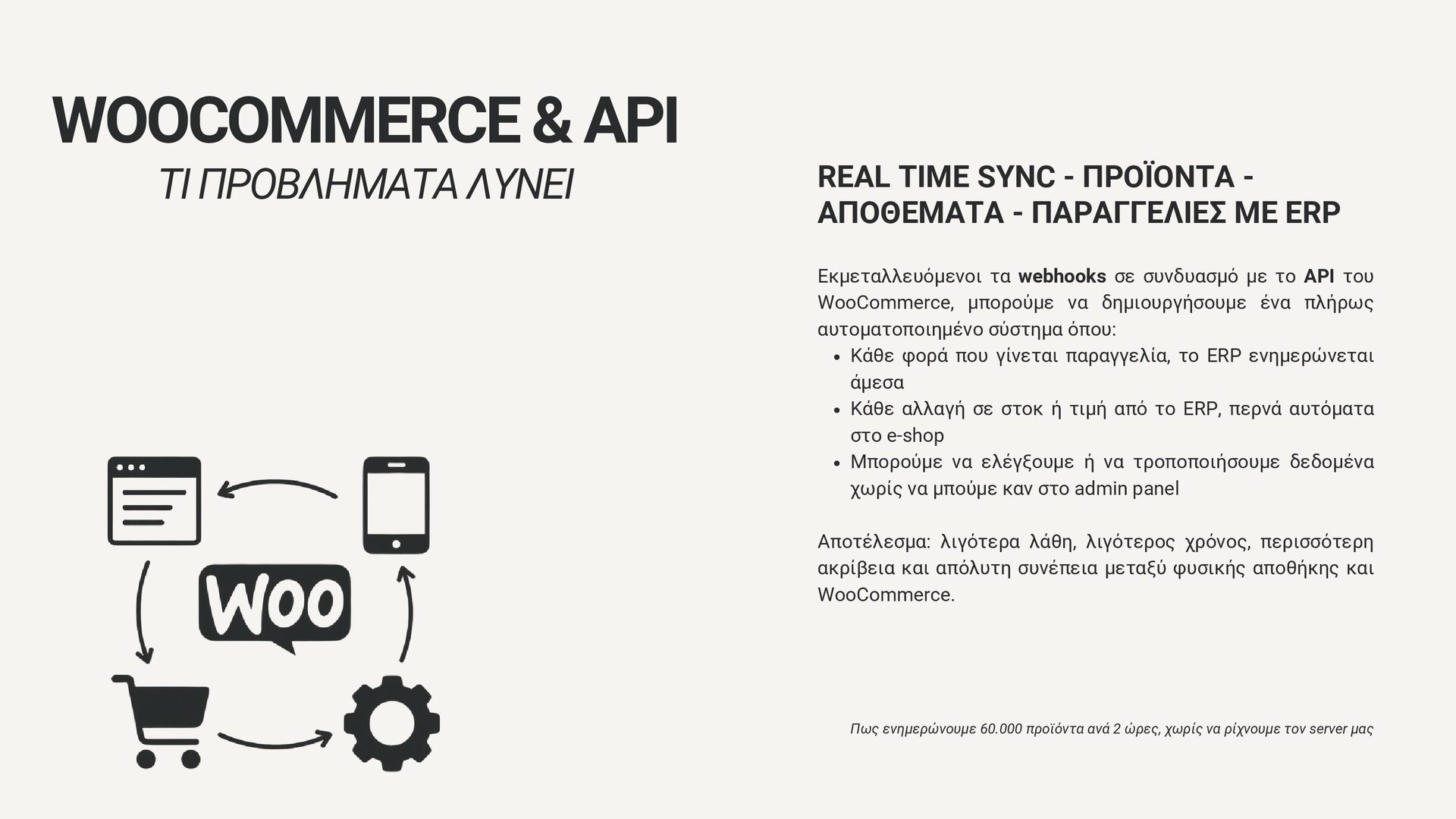 - ΠΑΡΑΓΓΕΛΙΕΣ ME ERP ΤΙ ΠΡΟΒΛΗΜΑΤΑ ΛΥΝΕΙ Εκμεταλλευόμενοι τα webhooks σε συνδυασμό με το API του WooCommerce, μπορούμε να δημιουργήσουμε ένα πλήρως αυτοματοποιημένο σύστημα όπου: Κάθε φορά που γίνεται παραγγελία, το ERP ενημερώνεται άμεσα Κάθε αλλαγή σε στοκ ή τιμή από το ERP, περνά αυτόματα στο e-shop Μπορούμε να ελέγξουμε ή να τροποποιήσουμε δεδομένα χωρίς να μπούμε καν στο admin panel Αποτέλεσμα: λιγότερα λάθη, λιγότερος χρόνος, περισσότερη ακρίβεια και απόλυτη συνέπεια μεταξύ φυσικής αποθήκης και WooCommerce. Πως ενημερώνουμε 60.000 προϊόντα ανά 2 ώρες, χωρίς να ρίχνουμε τον server μας