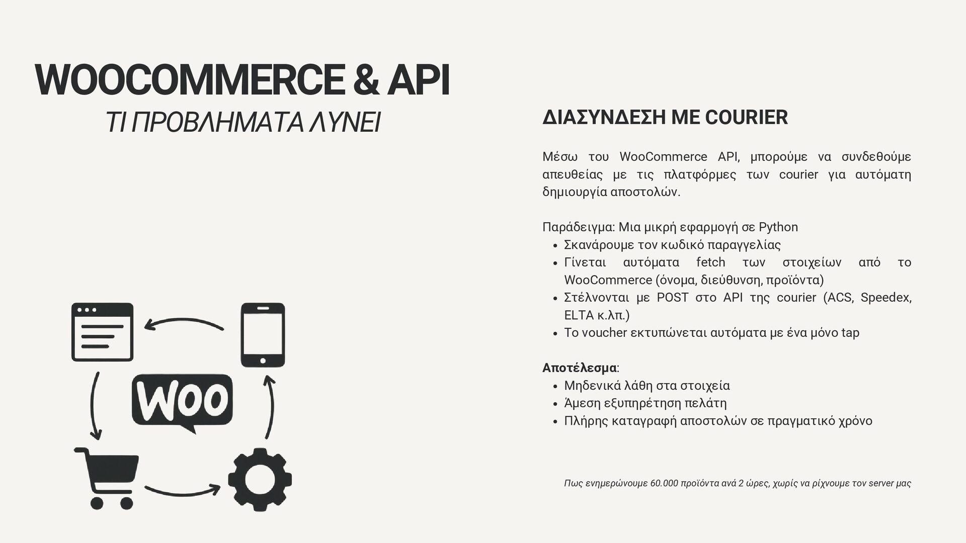 μπορούμε να συνδεθούμε απευθείας με τις πλατφόρμες των courier για αυτόματη δημιουργία αποστολών. Παράδειγμα: Μια μικρή εφαρμογή σε Python Σκανάρουμε τον κωδικό παραγγελίας Γίνεται αυτόματα fetch των στοιχείων από το WooCommerce (όνομα, διεύθυνση, προϊόντα) Στέλνονται με POST στο API της courier (ACS, Speedex, ELTA κ.λπ.) Το voucher εκτυπώνεται αυτόματα με ένα μόνο tap Αποτέλεσμα: Μηδενικά λάθη στα στοιχεία Άμεση εξυπηρέτηση πελάτη Πλήρης καταγραφή αποστολών σε πραγματικό χρόνο Πως ενημερώνουμε 60.000 προϊόντα ανά 2 ώρες, χωρίς να ρίχνουμε τον server μας WOOCOMMERCE & API