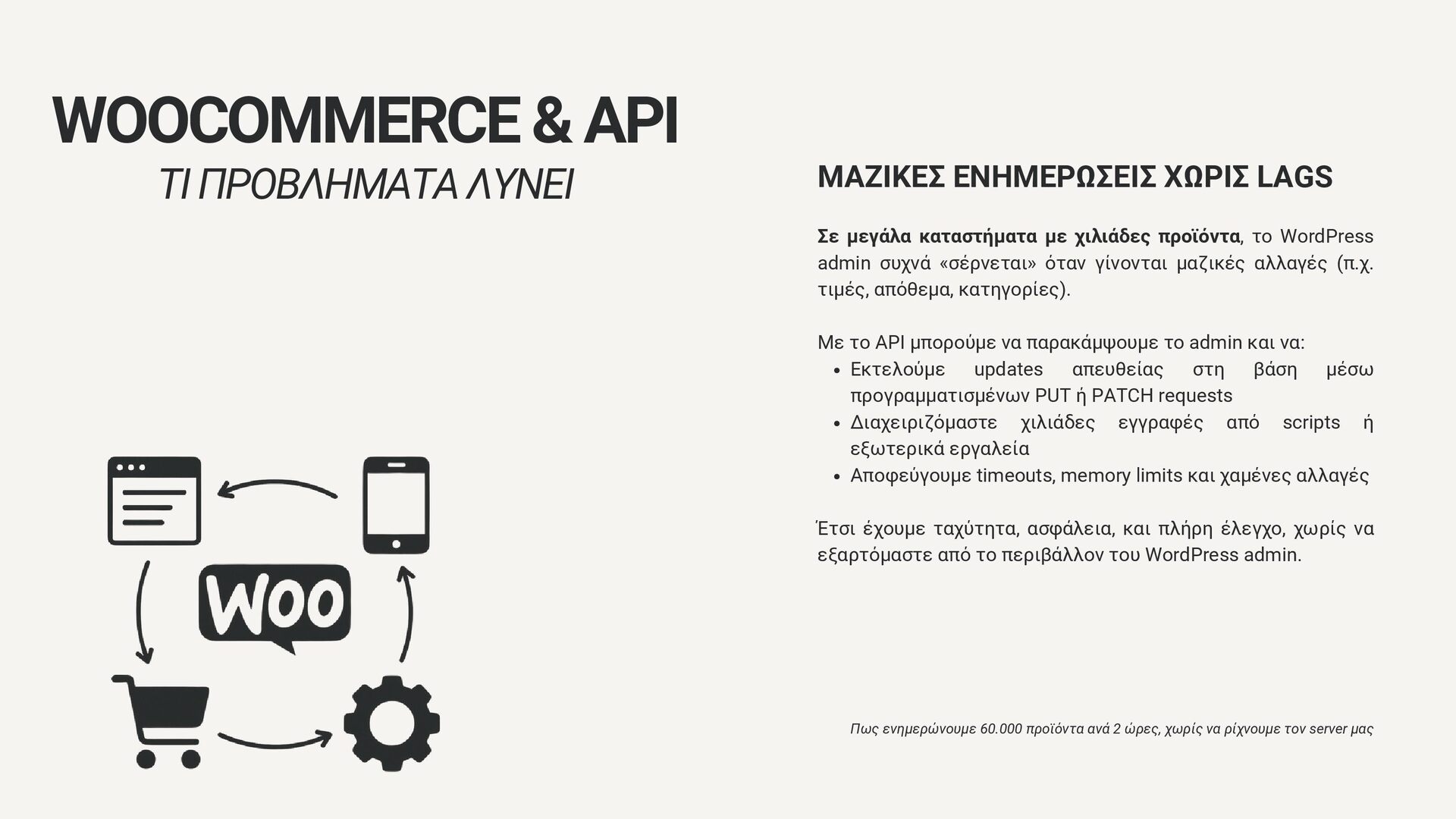με χιλιάδες προϊόντα, το WordPress admin συχνά «σέρνεται» όταν γίνονται μαζικές αλλαγές (π.χ. τιμές, απόθεμα, κατηγορίες). Με το API μπορούμε να παρακάμψουμε το admin και να: Εκτελούμε updates απευθείας στη βάση μέσω προγραμματισμένων PUT ή PATCH requests Διαχειριζόμαστε χιλιάδες εγγραφές από scripts ή εξωτερικά εργαλεία Αποφεύγουμε timeouts, memory limits και χαμένες αλλαγές Έτσι έχουμε ταχύτητα, ασφάλεια, και πλήρη έλεγχο, χωρίς να εξαρτόμαστε από το περιβάλλον του WordPress admin. Πως ενημερώνουμε 60.000 προϊόντα ανά 2 ώρες, χωρίς να ρίχνουμε τον server μας WOOCOMMERCE & API