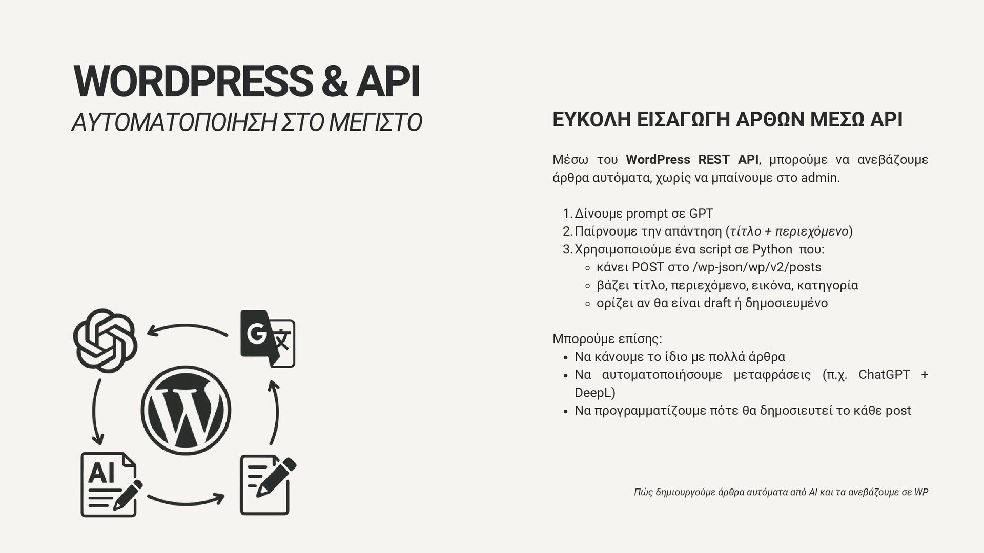 WordPress REST API, μπορούμε να ανεβάζουμε άρθρα αυτόματα, χωρίς να μπαίνουμε στο admin. 1.Δίνουμε prompt σε GPT 2.Παίρνουμε την απάντηση (τίτλο + περιεχόμενο) 3.Χρησιμοποιούμε ένα script σε Python που: κάνει POST στο /wp-json/wp/v2/posts βάζει τίτλο, περιεχόμενο, εικόνα, κατηγορία ορίζει αν θα είναι draft ή δημοσιευμένο Μπορούμε επίσης: Να κάνουμε το ίδιο με πολλά άρθρα Να αυτοματοποιήσουμε μεταφράσεις (π.χ. ChatGPT + DeepL) Να προγραμματίζουμε πότε θα δημοσιευτεί το κάθε post Πώς δημιουργούμε άρθρα αυτόματα από AI και τα ανεβάζουμε σε WP WORDPRESS & API