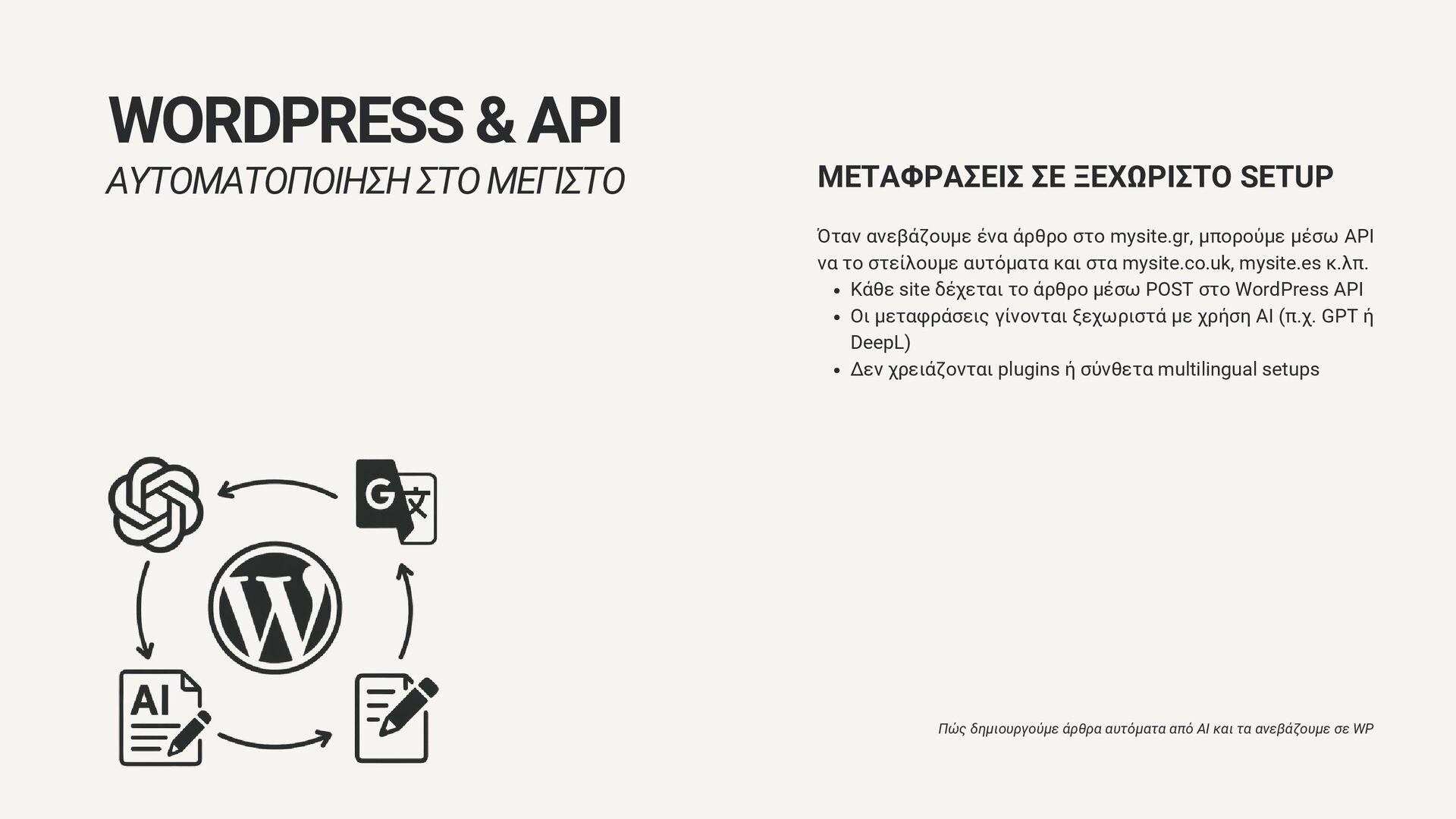 άρθρο στο mysite.gr, μπορούμε μέσω API να το στείλουμε αυτόματα και στα mysite.co.uk, mysite.es κ.λπ. Κάθε site δέχεται το άρθρο μέσω POST στο WordPress API Οι μεταφράσεις γίνονται ξεχωριστά με χρήση AI (π.χ. GPT ή DeepL) Δεν χρειάζονται plugins ή σύνθετα multilingual setups Πώς δημιουργούμε άρθρα αυτόματα από AI και τα ανεβάζουμε σε WP WORDPRESS & API