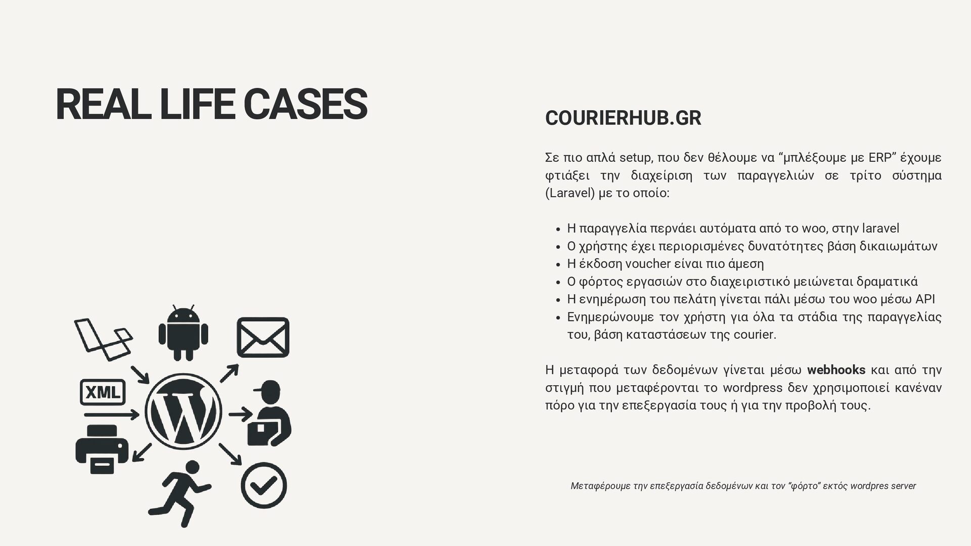 με ERP” έχουμε φτιάξει την διαχείριση των παραγγελιών σε τρίτο σύστημα (Laravel) με το οποίο: Η παραγγελία περνάει αυτόματα από το woo, στην laravel Ο χρήστης έχει περιορισμένες δυνατότητες βάση δικαιωμάτων Η έκδοση voucher είναι πιο άμεση Ο φόρτος εργασιών στο διαχειριστικό μειώνεται δραματικά Η ενημέρωση του πελάτη γίνεται πάλι μέσω του woo μέσω API Ενημερώνουμε τον χρήστη για όλα τα στάδια της παραγγελίας του, βάση καταστάσεων της courier. Η μεταφορά των δεδομένων γίνεται μέσω webhooks και από την στιγμή που μεταφέρονται το wordpress δεν χρησιμοποιεί κανέναν πόρο για την επεξεργασία τους ή για την προβολή τους. Μεταφέρουμε την επεξεργασία δεδομένων και τον “φόρτο” εκτός wordpres server REAL LIFE CASES