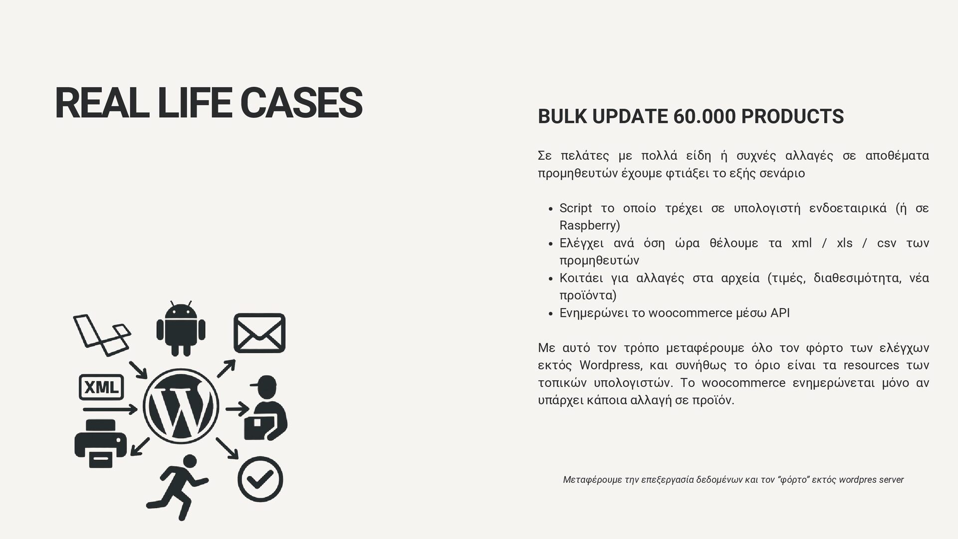συχνές αλλαγές σε αποθέματα προμηθευτών έχουμε φτιάξει το εξής σενάριο Script το οποίο τρέχει σε υπολογιστή ενδοεταιρικά (ή σε Raspberry) Ελέγχει ανά όση ώρα θέλουμε τα xml / xls / csv των προμηθευτών Κοιτάει για αλλαγές στα αρχεία (τιμές, διαθεσιμότητα, νέα προϊόντα) Ενημερώνει το woocommerce μέσω API Με αυτό τον τρόπο μεταφέρουμε όλο τον φόρτο των ελέγχων εκτός Wordpress, και συνήθως το όριο είναι τα resources των τοπικών υπολογιστών. Το woocommerce ενημερώνεται μόνο αν υπάρχει κάποια αλλαγή σε προϊόν. Μεταφέρουμε την επεξεργασία δεδομένων και τον “φόρτο” εκτός wordpres server REAL LIFE CASES