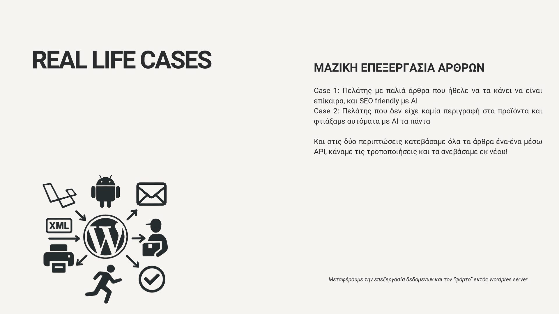 ήθελε να τα κάνει να είναι επίκαιρα, και SEO friendly με AI Case 2: Πελάτης που δεν είχε καμία περιγραφή στα προϊόντα και φτιάξαμε αυτόματα με AI τα πάντα Και στις δύο περιπτώσεις κατεβάσαμε όλα τα άρθρα ένα-ένα μέσω API, κάναμε τις τροποποιήσεις και τα ανεβάσαμε εκ νέου! Μεταφέρουμε την επεξεργασία δεδομένων και τον “φόρτο” εκτός wordpres server REAL LIFE CASES
