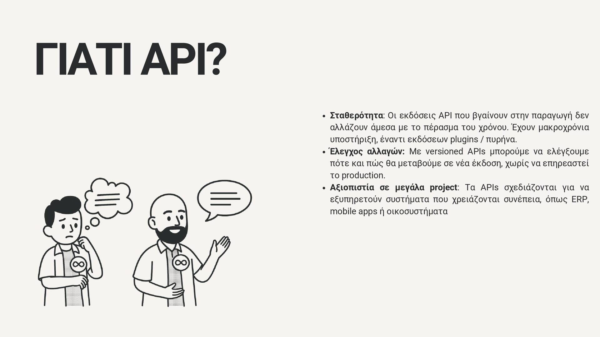 δεν αλλάζουν άμεσα με το πέρασμα του χρόνου. Έχουν μακροχρόνια υποστήριξη, έναντι εκδόσεων plugins / πυρήνα. Έλεγχος αλλαγών: Με versioned APIs μπορούμε να ελέγξουμε πότε και πώς θα μεταβούμε σε νέα έκδοση, χωρίς να επηρεαστεί το production. Αξιοπιστία σε μεγάλα project: Τα APIs σχεδιάζονται για να εξυπηρετούν συστήματα που χρειάζονται συνέπεια, όπως ERP, mobile apps ή οικοσυστήματα