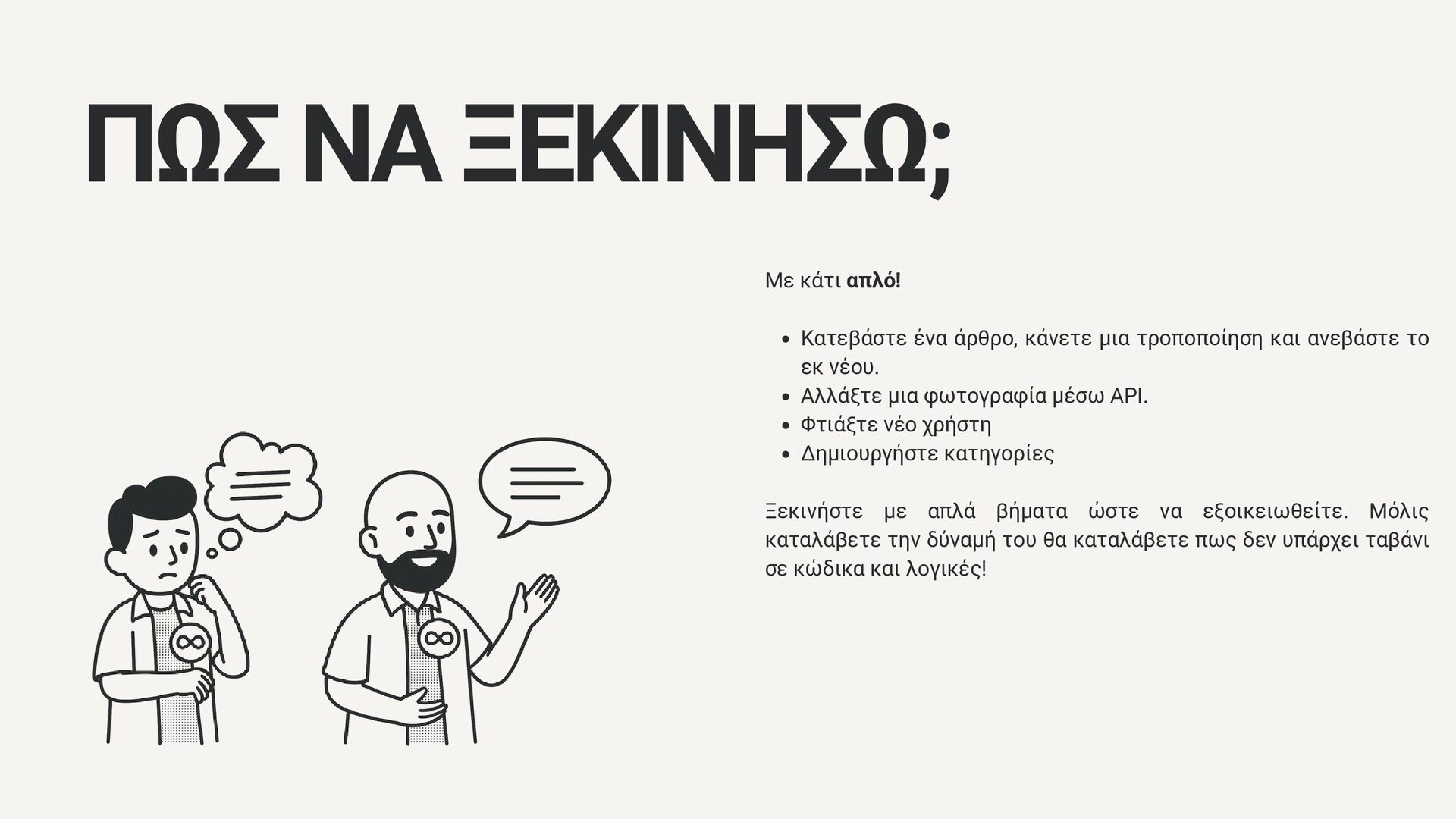 μια τροποποίηση και ανεβάστε το εκ νέου. Αλλάξτε μια φωτογραφία μέσω API. Φτιάξτε νέο χρήστη Δημιουργήστε κατηγορίες Ξεκινήστε με απλά βήματα ώστε να εξοικειωθείτε. Μόλις καταλάβετε την δύναμή του θα καταλάβετε πως δεν υπάρχει ταβάνι σε κώδικα και λογικές!