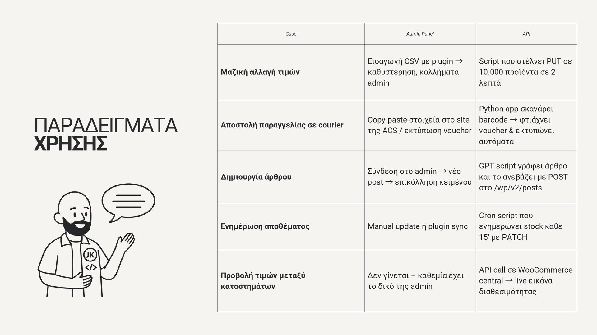 plugin → καθυστέρηση, κολλήματα admin Script που στέλνει PUT σε 10.000 προϊόντα σε 2 λεπτά Αποστολή παραγγελίας σε courier Copy-paste στοιχεία στο site της ACS / εκτύπωση voucher Python app σκανάρει barcode → φτιάχνει voucher & εκτυπώνει αυτόματα Δημιουργία άρθρου Σύνδεση στο admin → νέο post → επικόλληση κειμένου GPT script γράφει άρθρο και το ανεβάζει με POST στο /wp/v2/posts Ενημέρωση αποθέματος Manual update ή plugin sync Cron script που ενημερώνει stock κάθε 15' με PATCH Προβολή τιμών μεταξύ καταστημάτων Δεν γίνεται – καθεμία έχει το δικό της admin API call σε WooCommerce central → live εικόνα διαθεσιμότητας ΠΑΡΑΔΕΙΓΜΑΤΑ ΧΡΗΣΗΣ