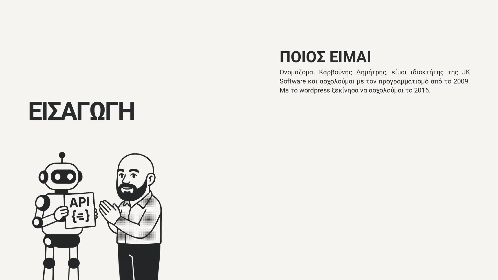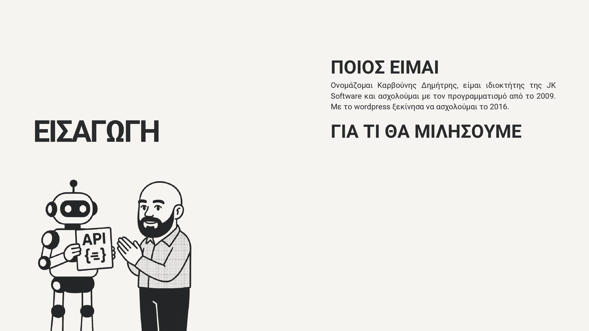 Software και ασχολούμαι με τον προγραμματισμό από το 2009. Με το wordpress ξεκίνησα να ασχολούμαι το 2016. ΓΙΑ ΤΙ ΘΑ ΜΙΛΗΣΟΥΜΕ Γιατί θέλουμε API στο wordpress μας Πως μας βοηθάει στην καθημερινότητα Πραγματικές εφαρμογές της JK Software