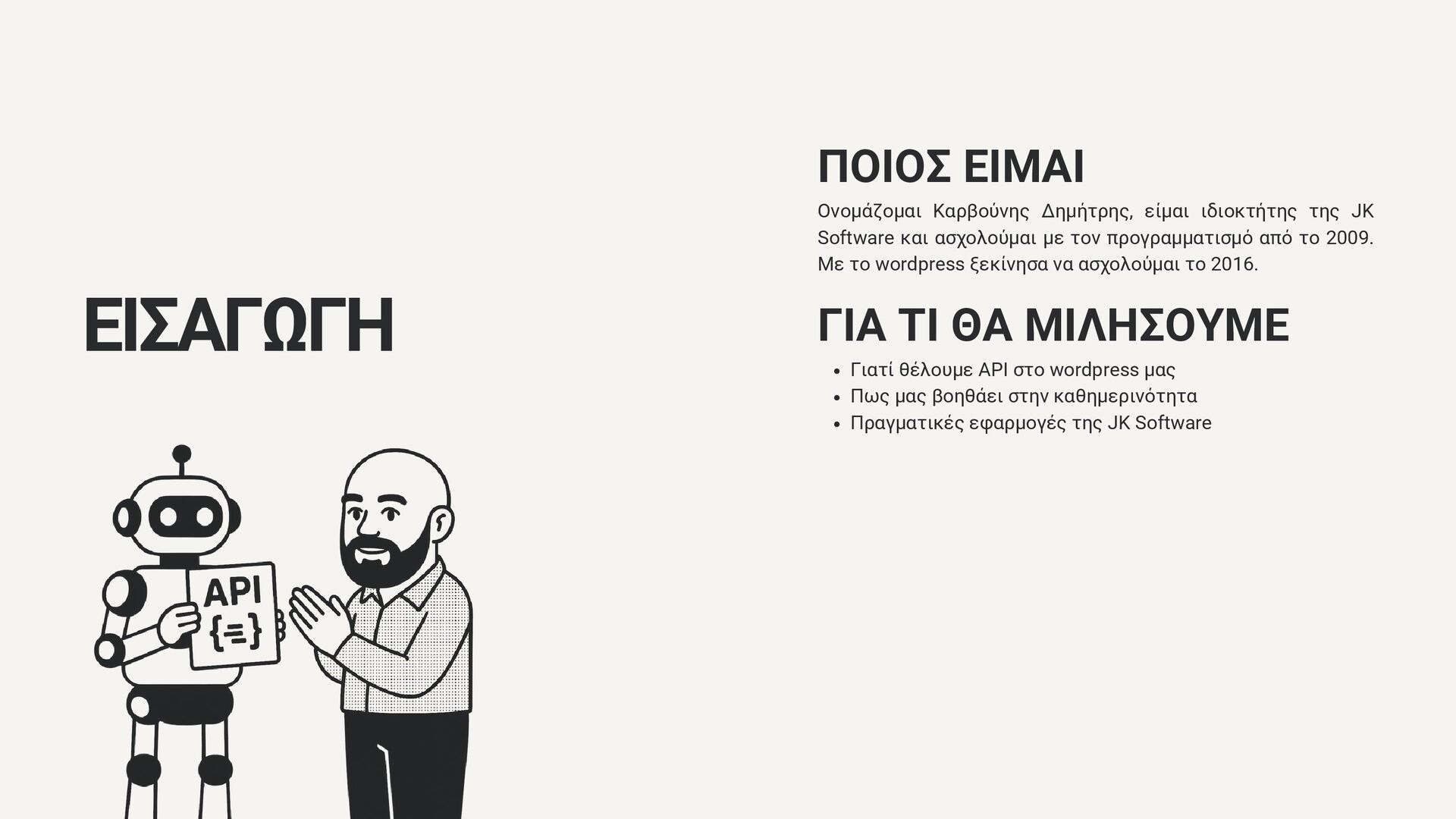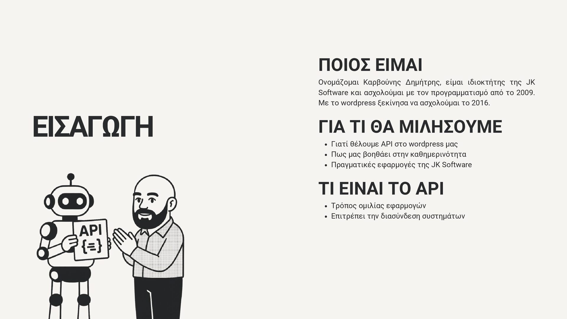 Software και ασχολούμαι με τον προγραμματισμό από το 2009. Με το wordpress ξεκίνησα να ασχολούμαι το 2016. ΓΙΑ ΤΙ ΘΑ ΜΙΛΗΣΟΥΜΕ Γιατί θέλουμε API στο wordpress μας Πως μας βοηθάει στην καθημερινότητα Πραγματικές εφαρμογές της JK Software ΤΙ ΕΙΝΑΙ ΤΟ API Τρόπος ομιλίας εφαρμογών Επιτρέπει την διασύνδεση συστημάτων
