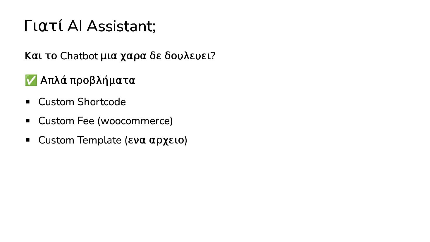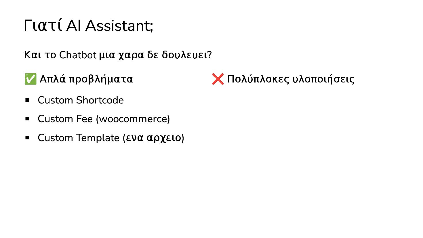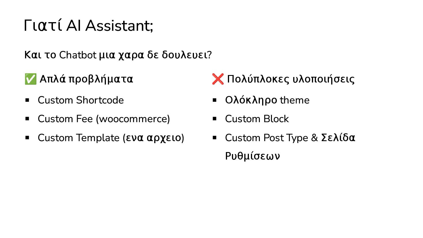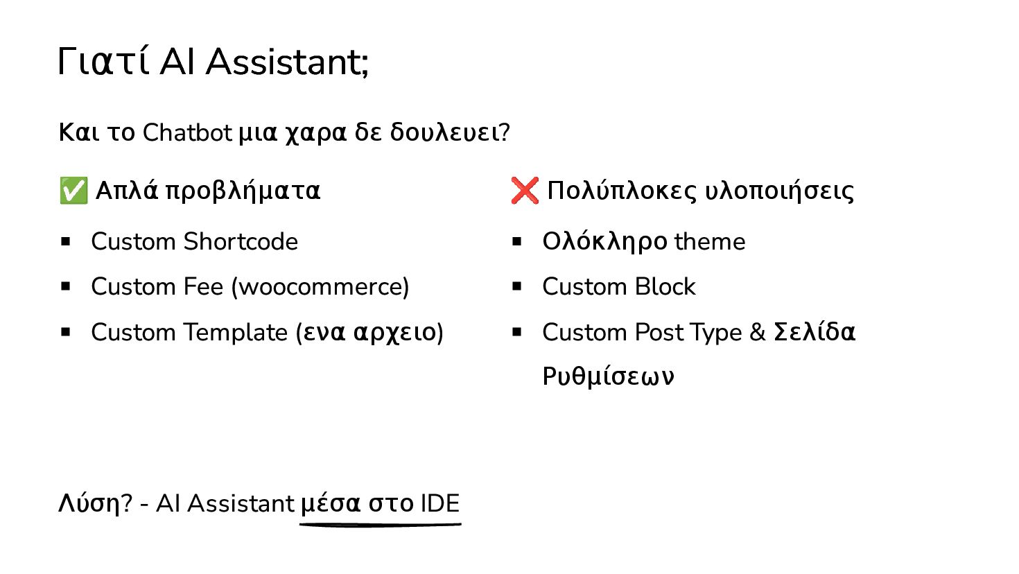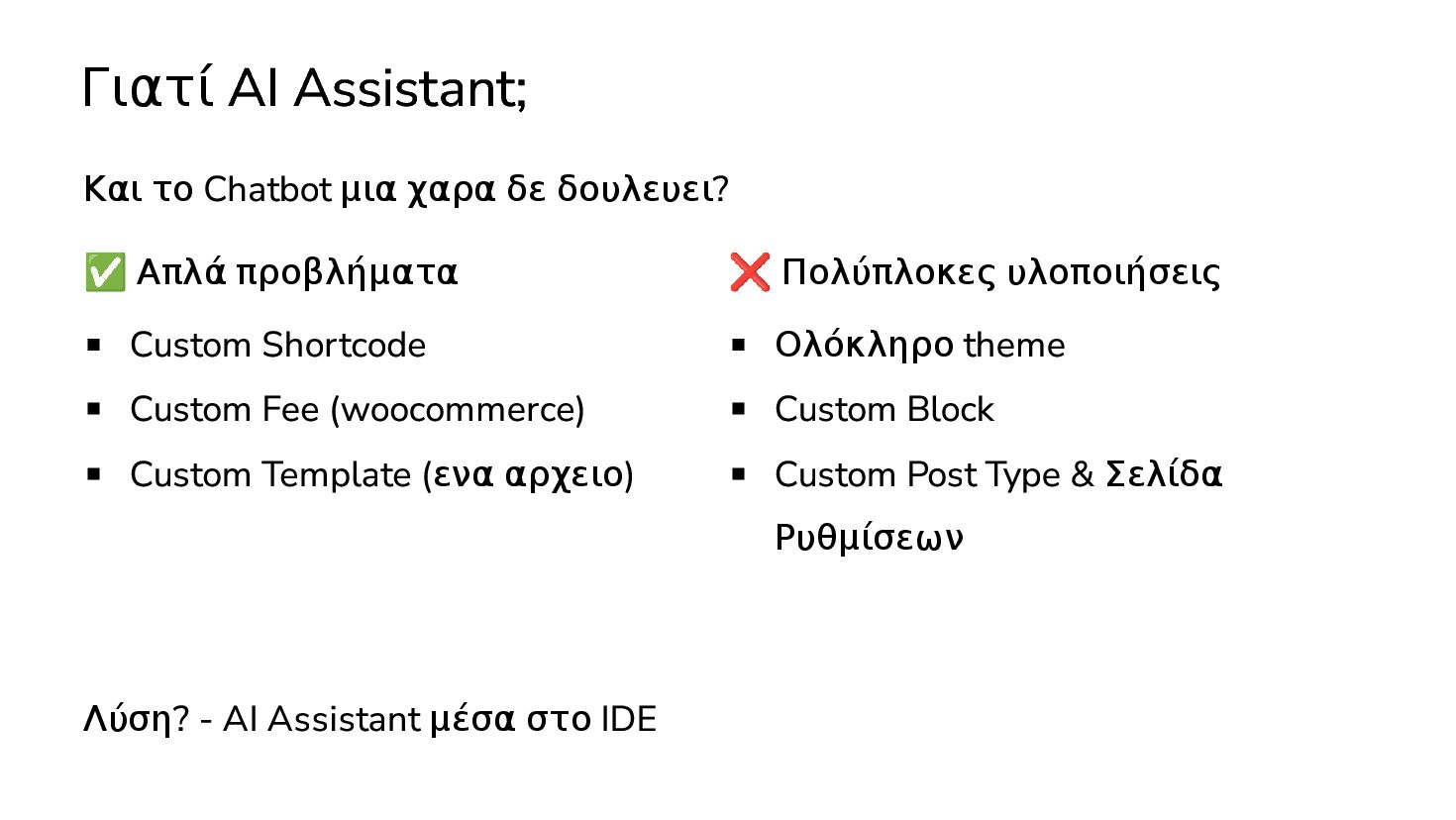 ✅ Απλά προβλήματα Custom Shortcode Custom Fee (woocommerce) Custom Template (ενα αρχειο) ❌ Πολύπλοκες υλοποιήσεις Ολόκληρο theme Custom Block Custom Post Type & Σελίδα Ρυθμίσεων Λύση? - AI Assistant μέσα στο IDE