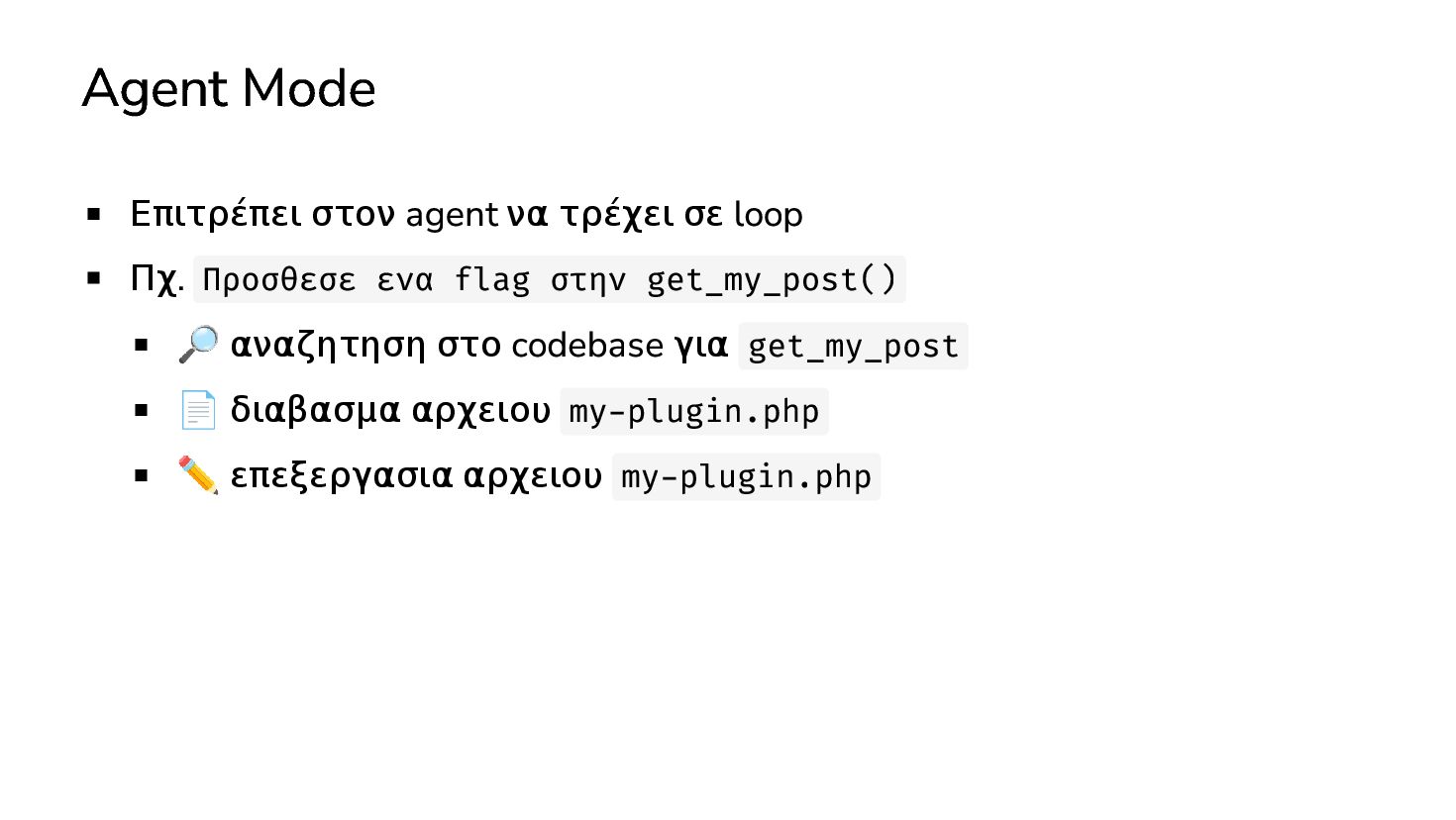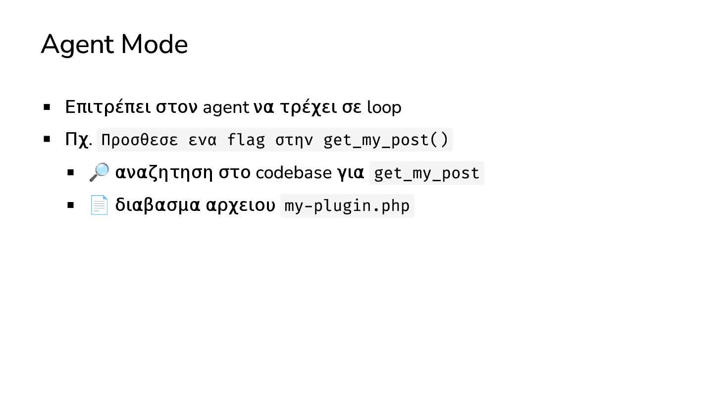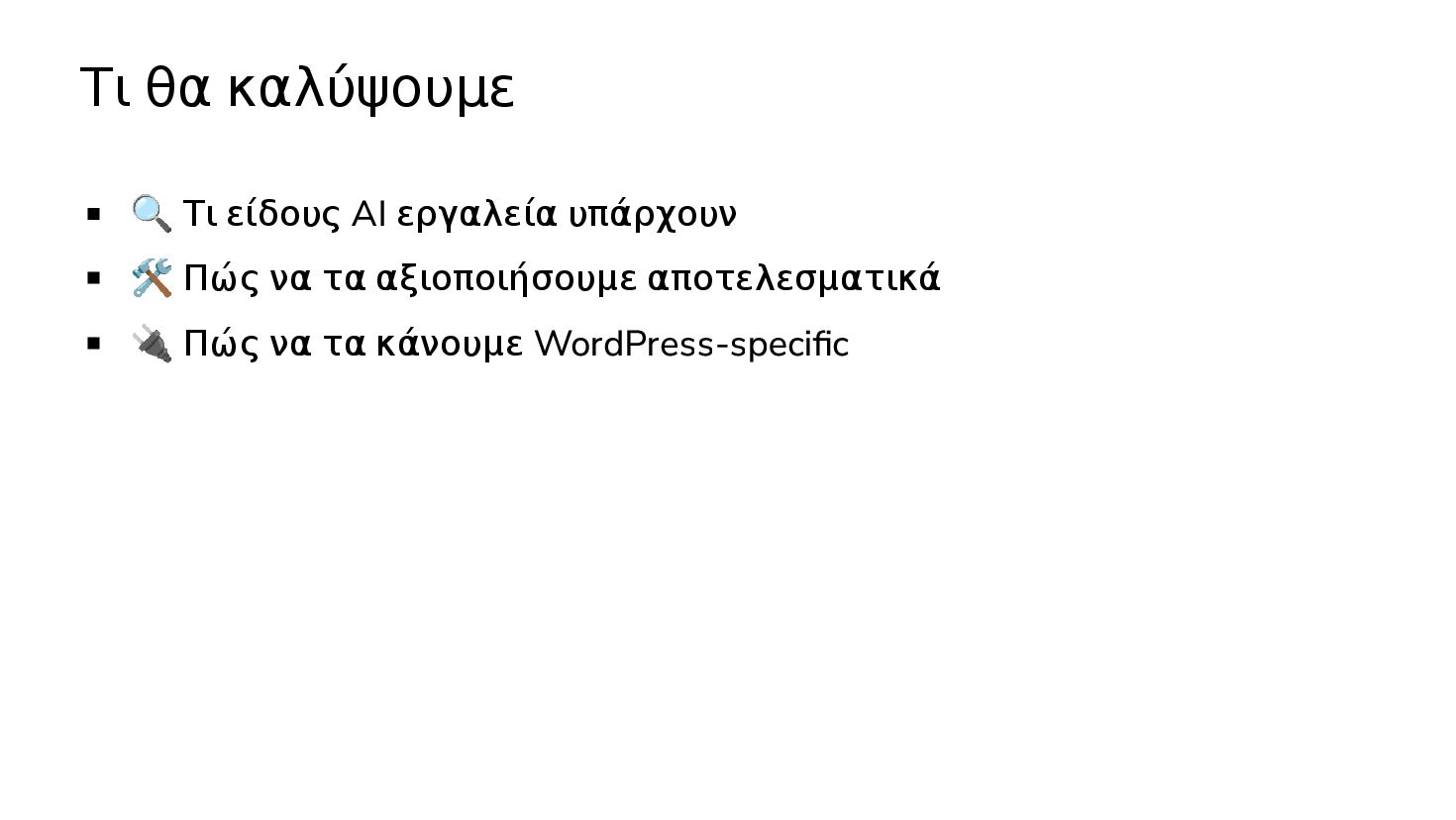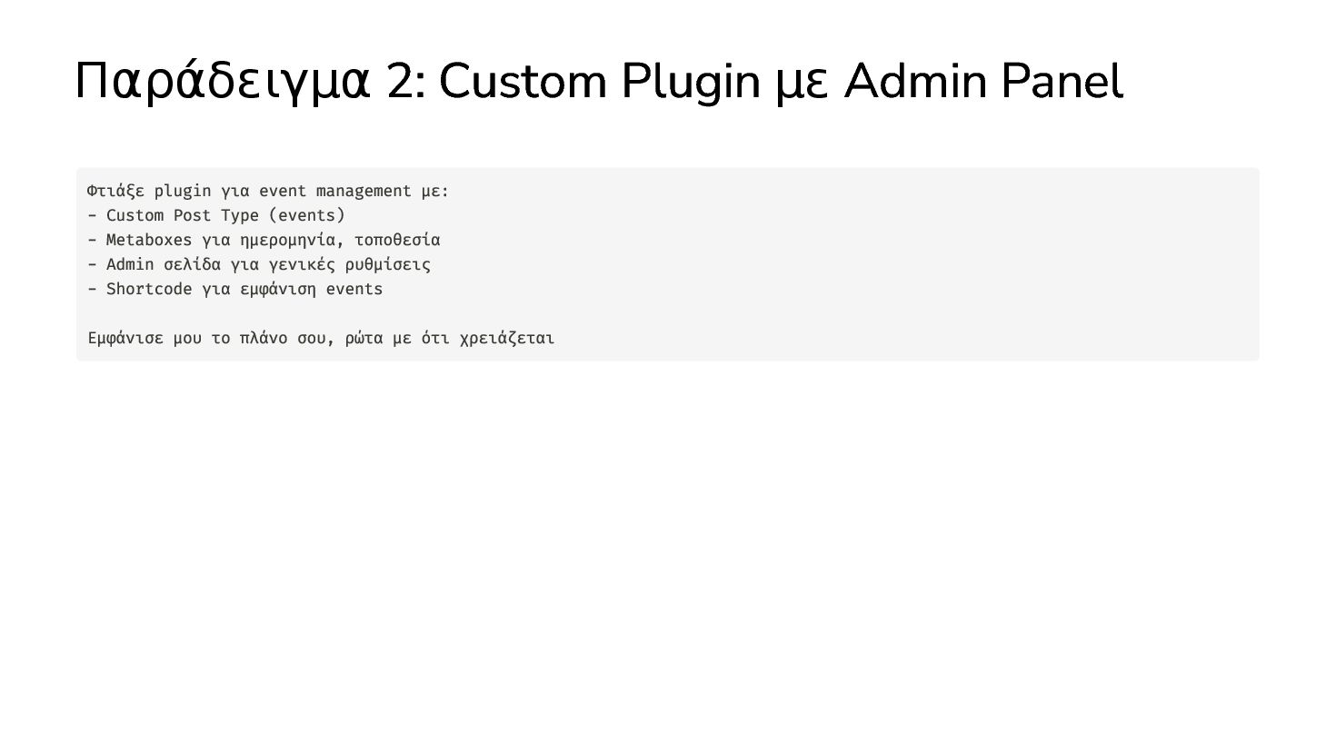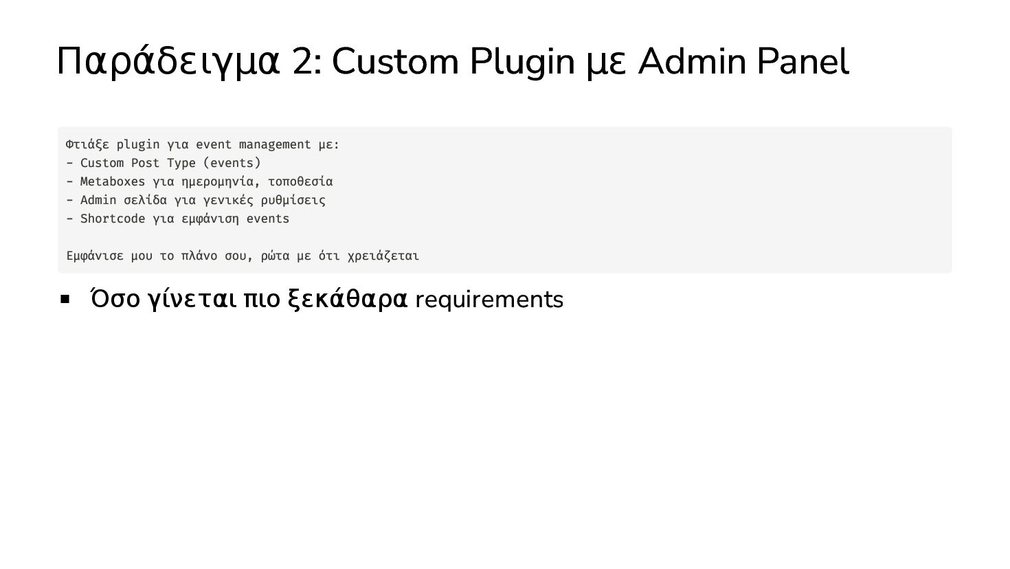 ✅ Απλά προβλήματα Custom Shortcode Custom Fee (woocommerce) Custom Template (ενα αρχειο) ❌ Πολύπλοκες υλοποιήσεις Ολόκληρο theme Custom Block Custom Post Type & Σελίδα Ρυθμίσεων Λύση? - AI Assistant μέσα στο IDE