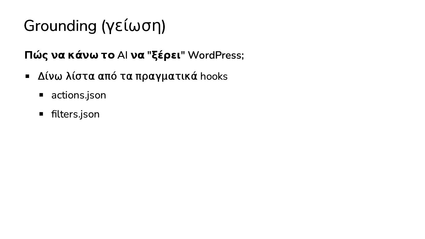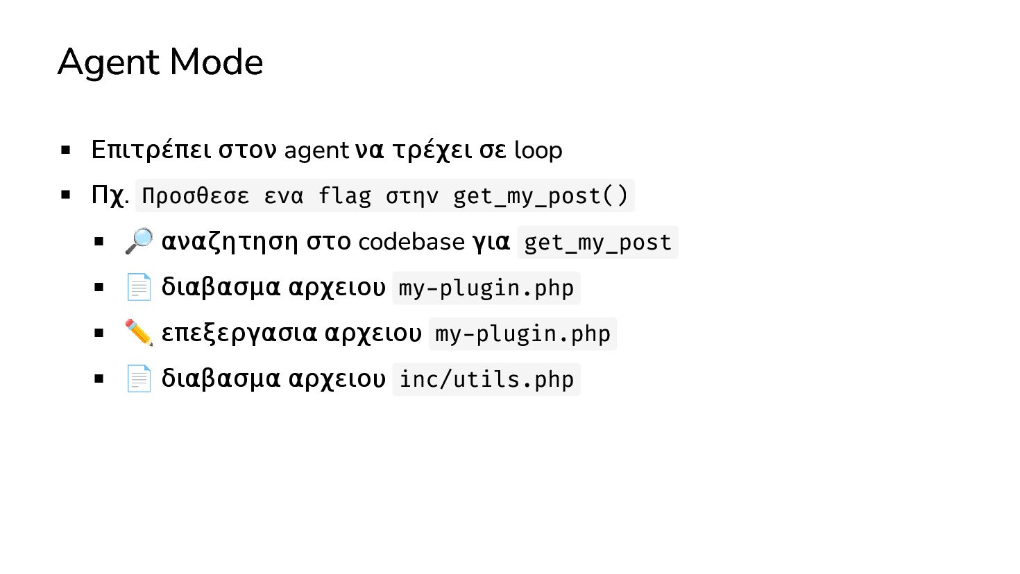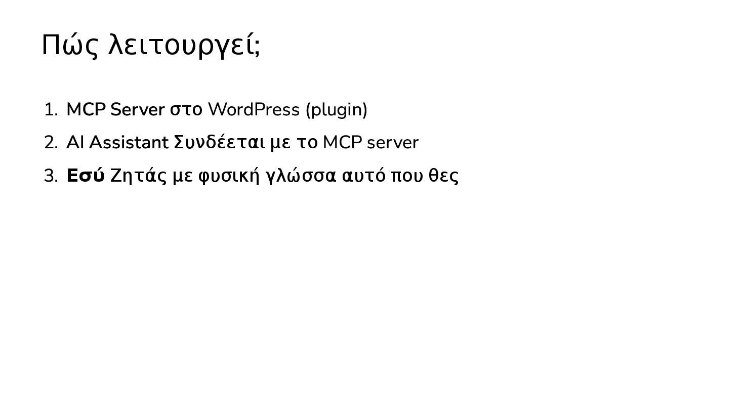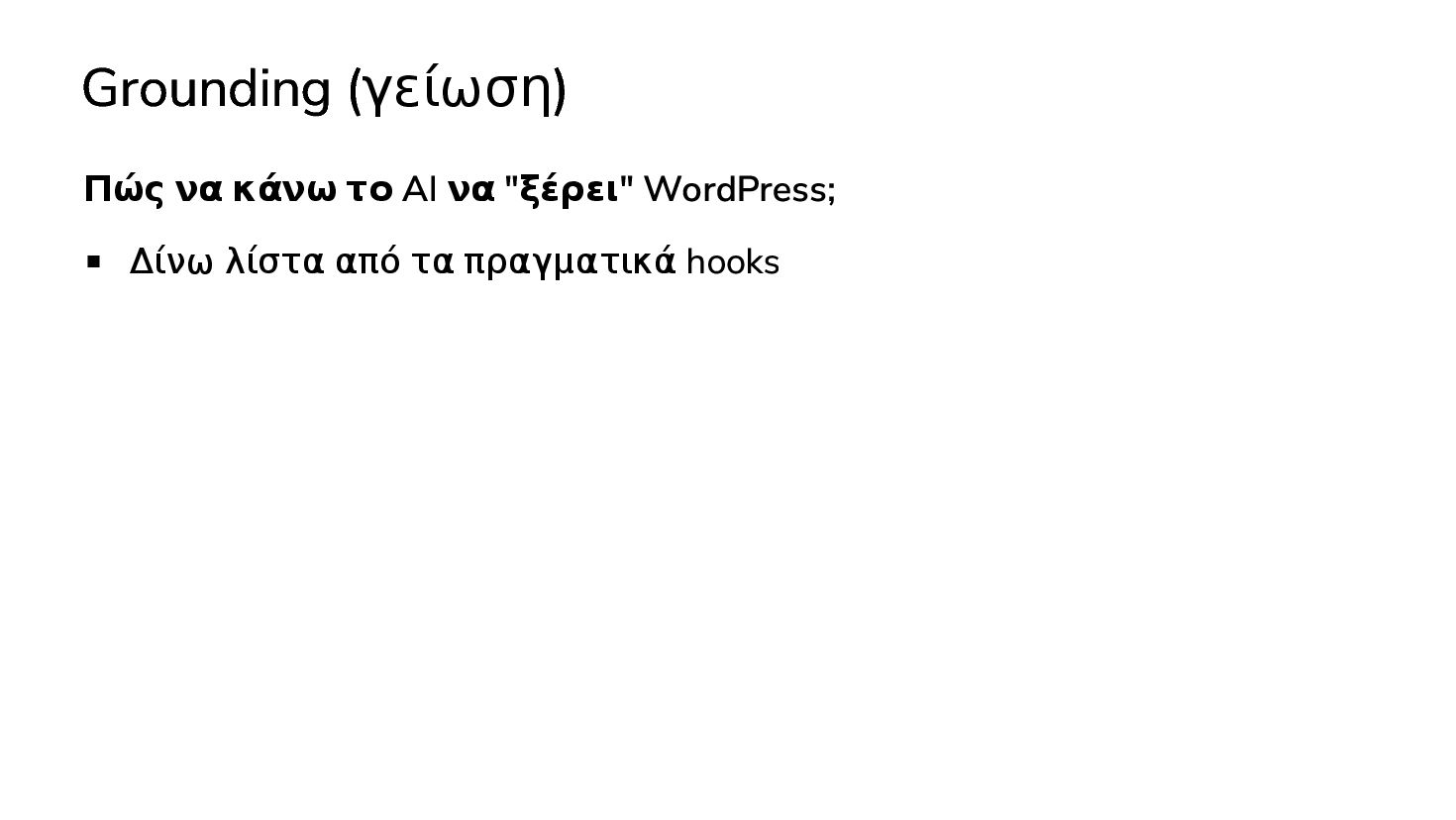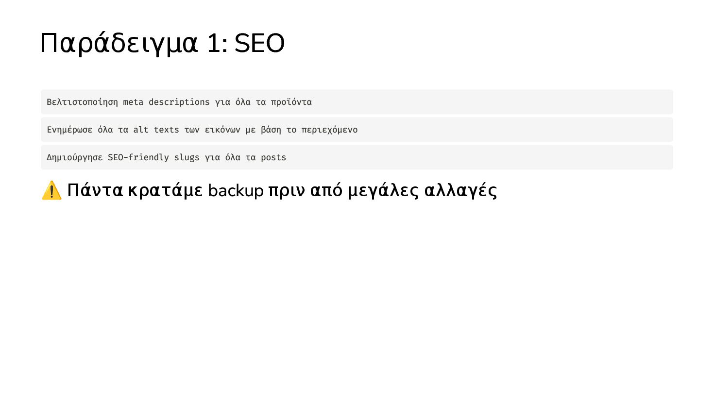 ✅ Απλά προβλήματα Custom Shortcode Custom Fee (woocommerce) Custom Template (ενα αρχειο) ❌ Πολύπλοκες υλοποιήσεις Ολόκληρο theme Custom Block Custom Post Type & Σελίδα Ρυθμίσεων Λύση? - AI Assistant μέσα στο IDE