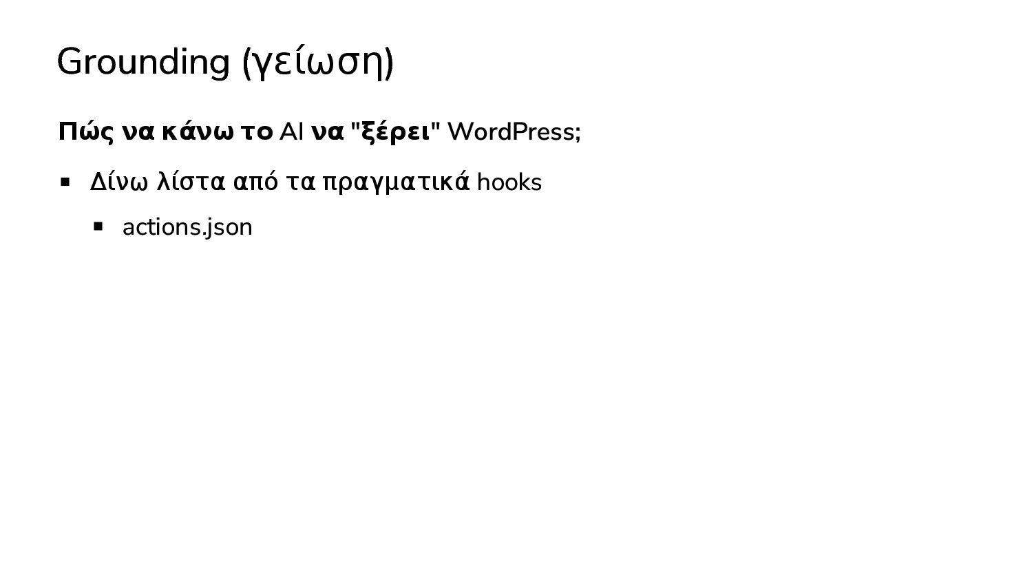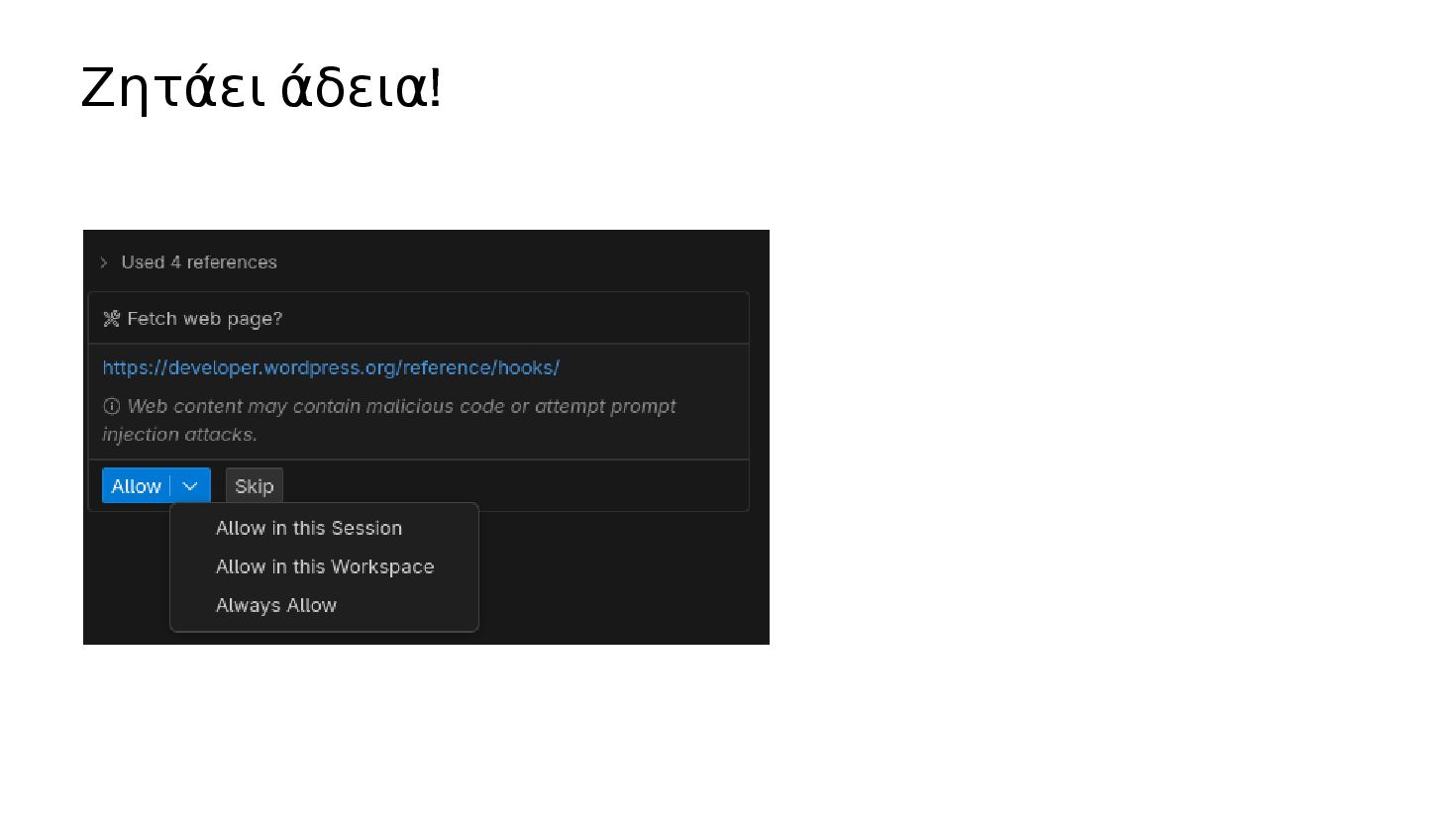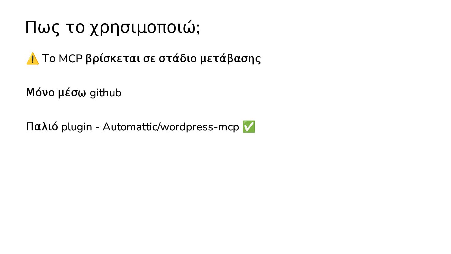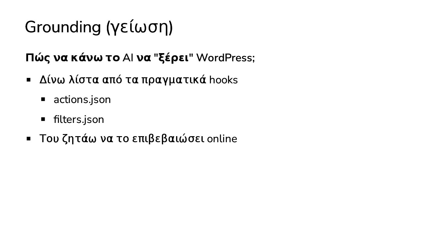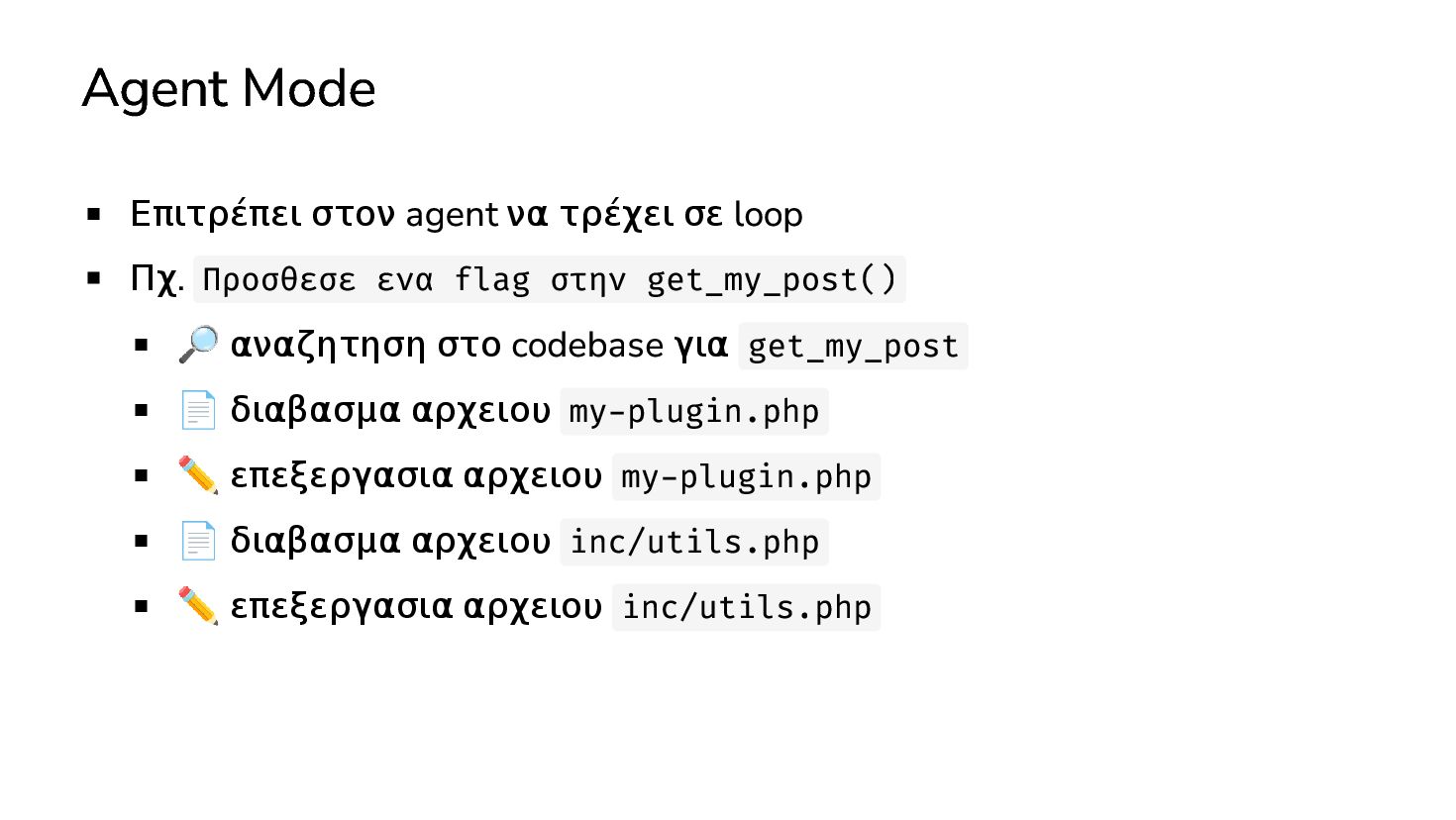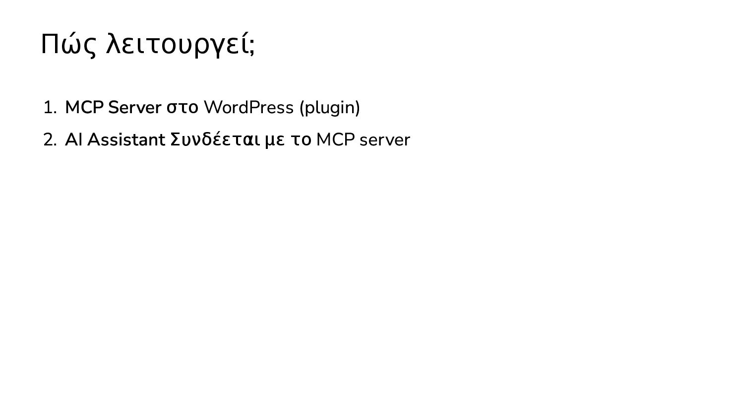 ✅ Απλά προβλήματα Custom Shortcode Custom Fee (woocommerce) Custom Template (ενα αρχειο) ❌ Πολύπλοκες υλοποιήσεις Ολόκληρο theme Custom Block Custom Post Type & Σελίδα Ρυθμίσεων Λύση? - AI Assistant μέσα στο IDE