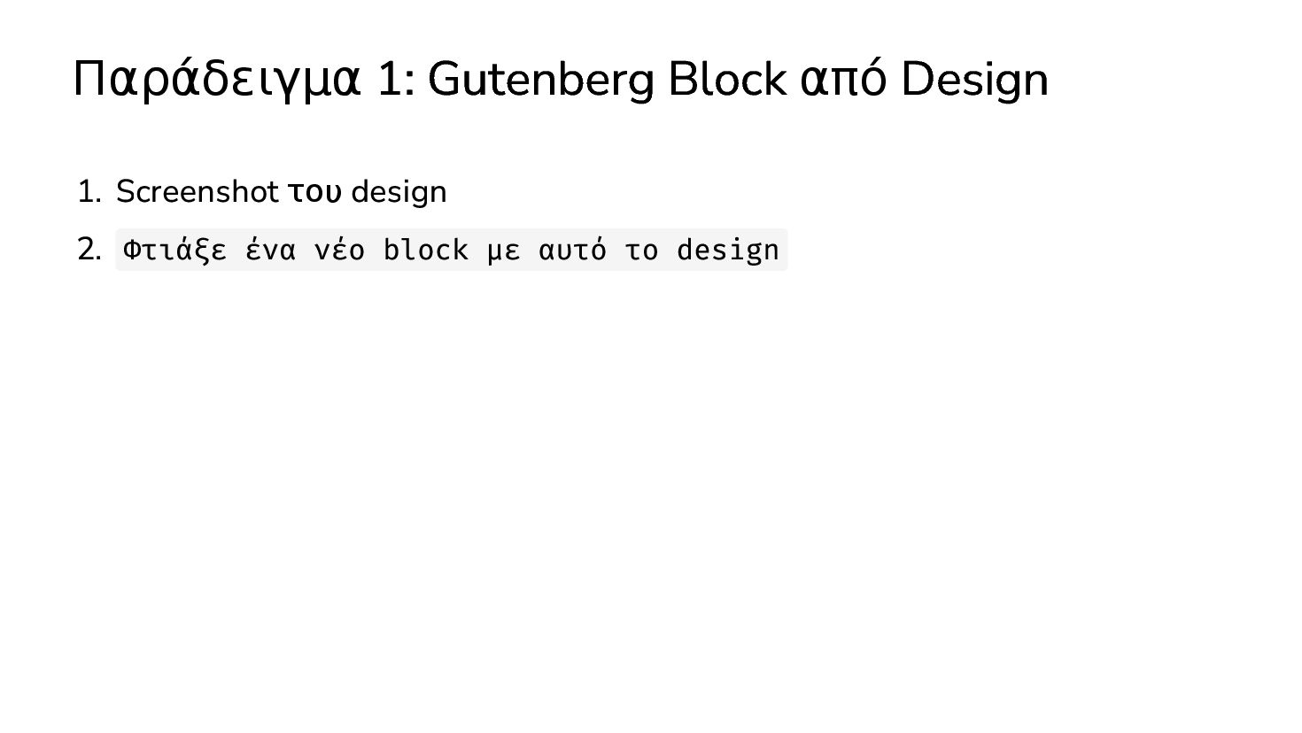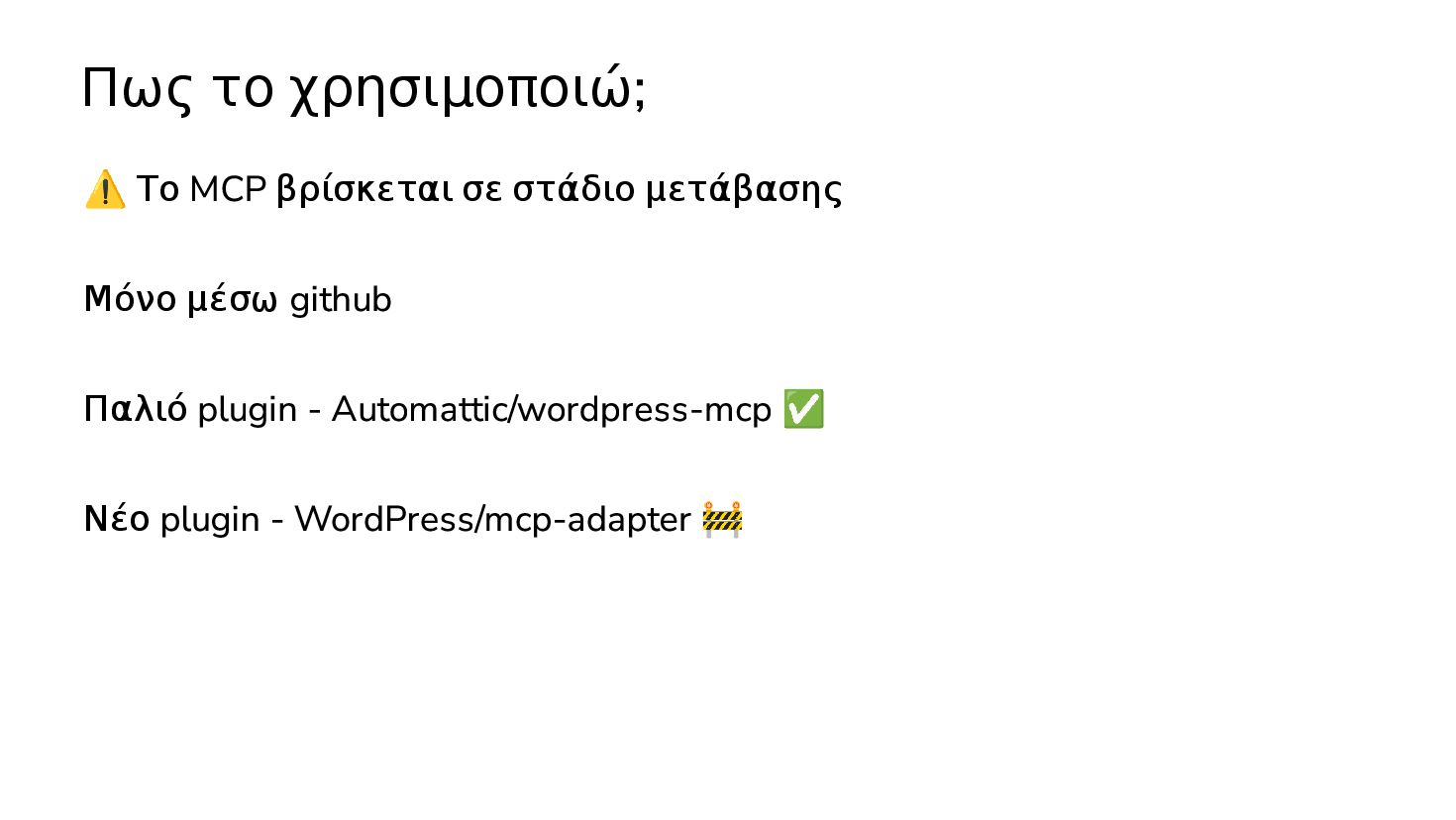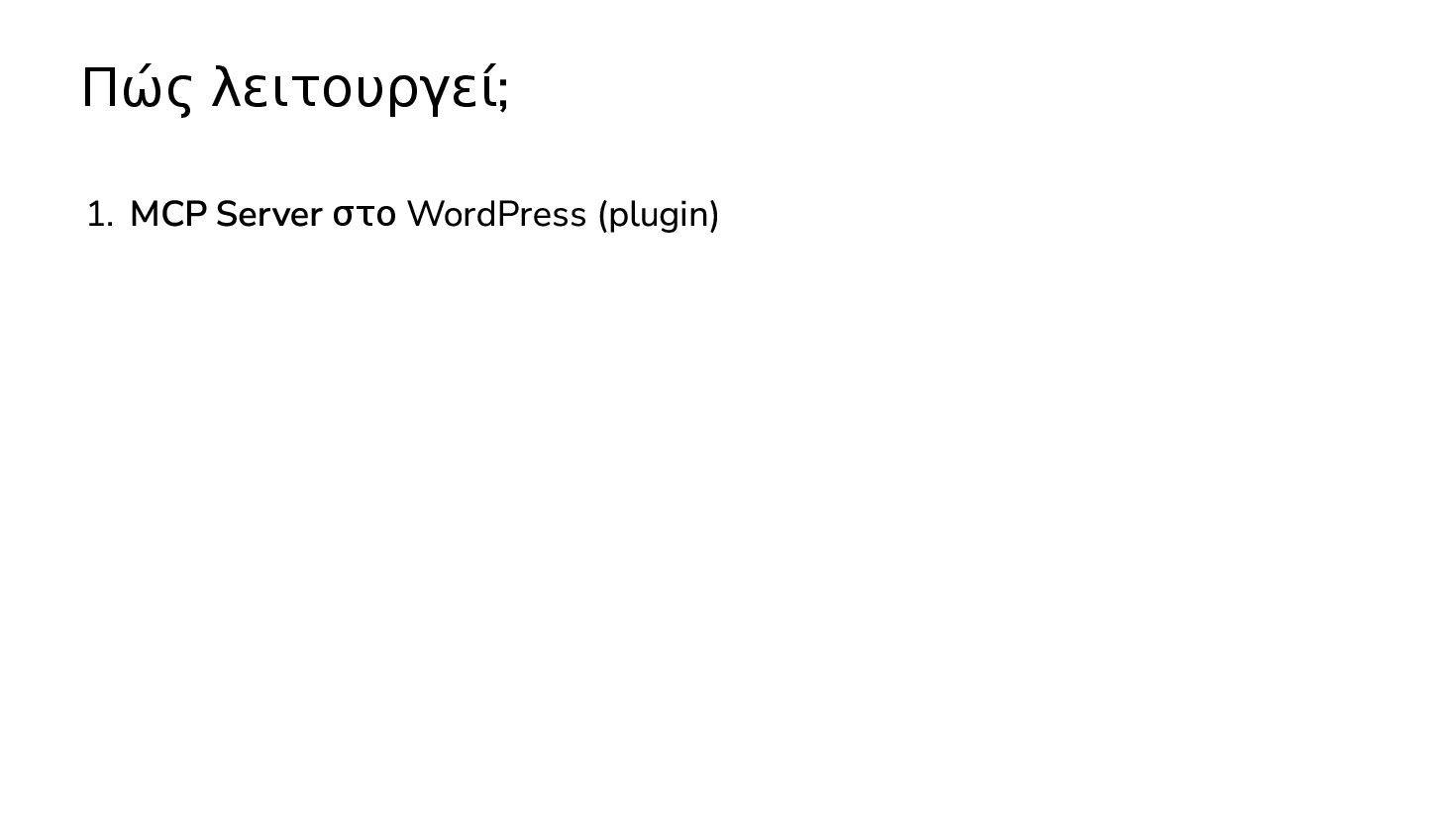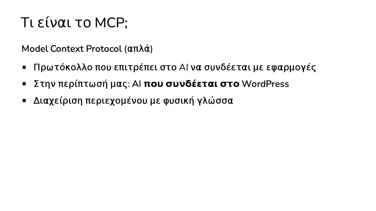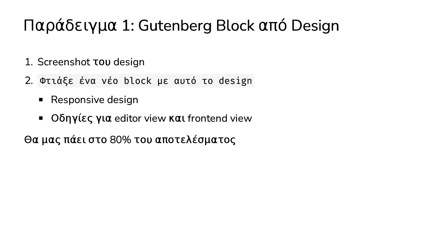 ✅ Απλά προβλήματα Custom Shortcode Custom Fee (woocommerce) Custom Template (ενα αρχειο) ❌ Πολύπλοκες υλοποιήσεις Ολόκληρο theme Custom Block Custom Post Type & Σελίδα Ρυθμίσεων Λύση? - AI Assistant μέσα στο IDE