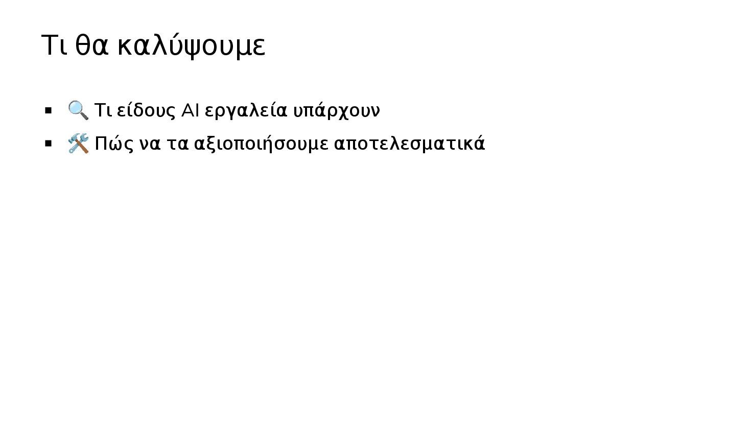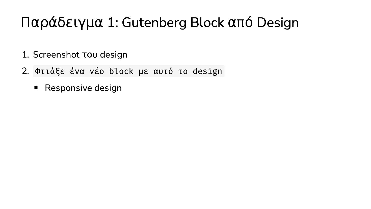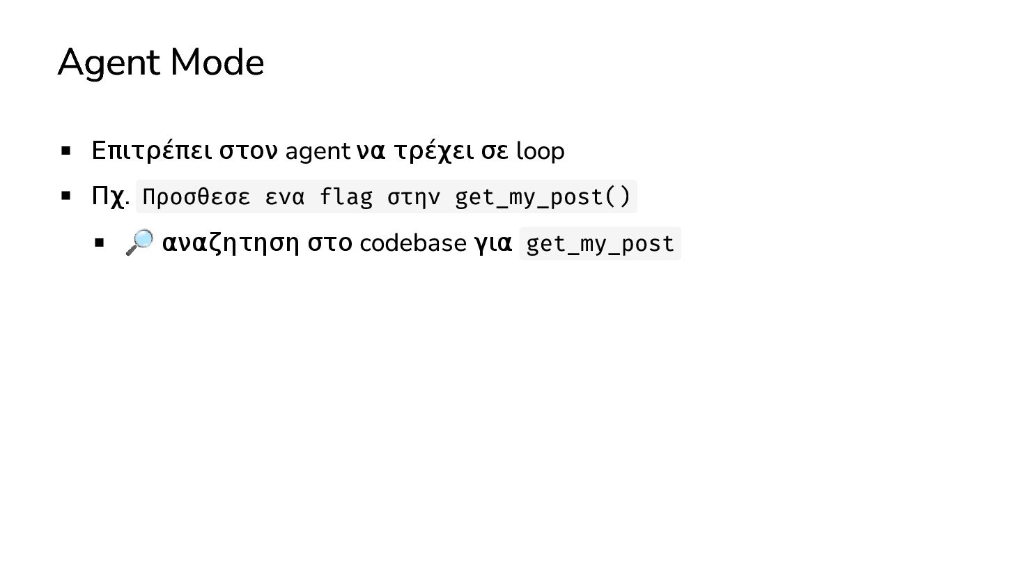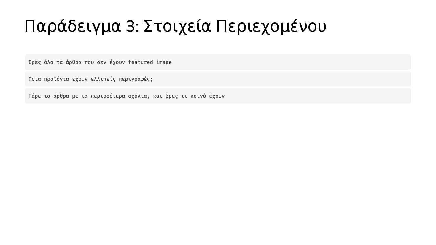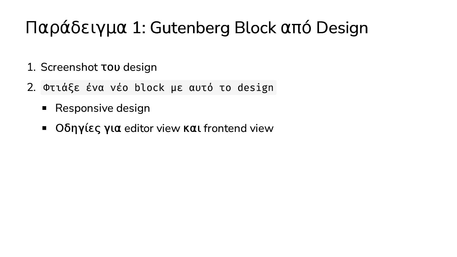 ✅ Απλά προβλήματα Custom Shortcode Custom Fee (woocommerce) Custom Template (ενα αρχειο) ❌ Πολύπλοκες υλοποιήσεις Ολόκληρο theme Custom Block Custom Post Type & Σελίδα Ρυθμίσεων Λύση? - AI Assistant μέσα στο IDE
