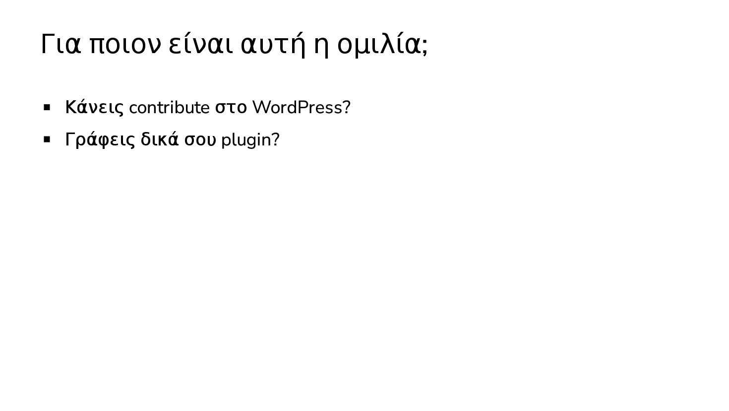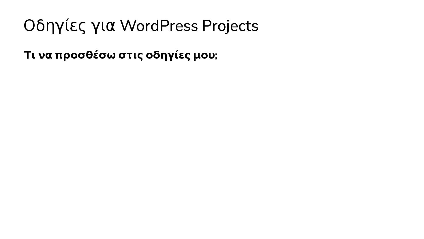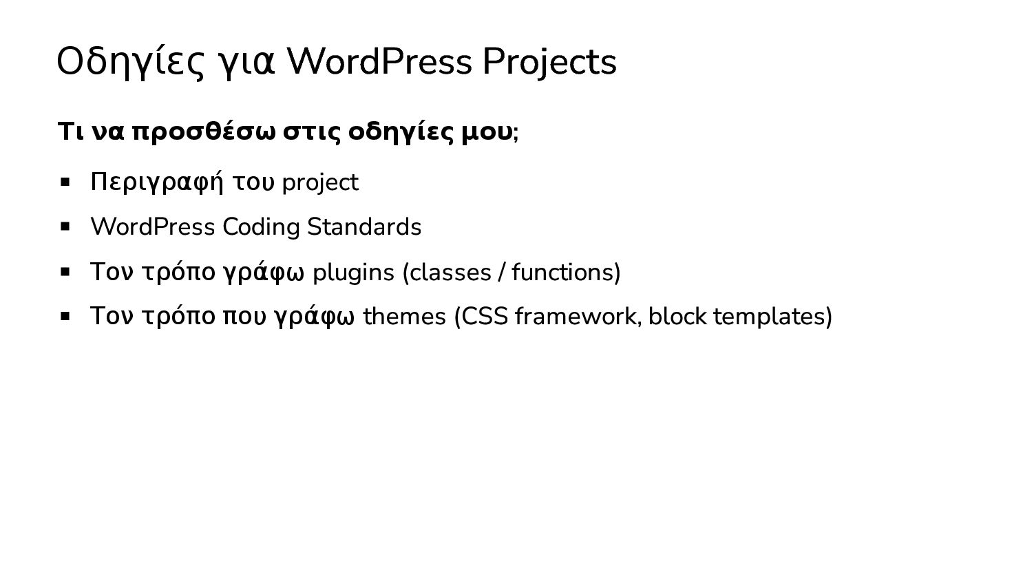 Περιγραφή του project WordPress Coding Standards Τον τρόπο γράφω plugins (classes / functions) Τον τρόπο που γράφω themes (CSS framework, block templates)