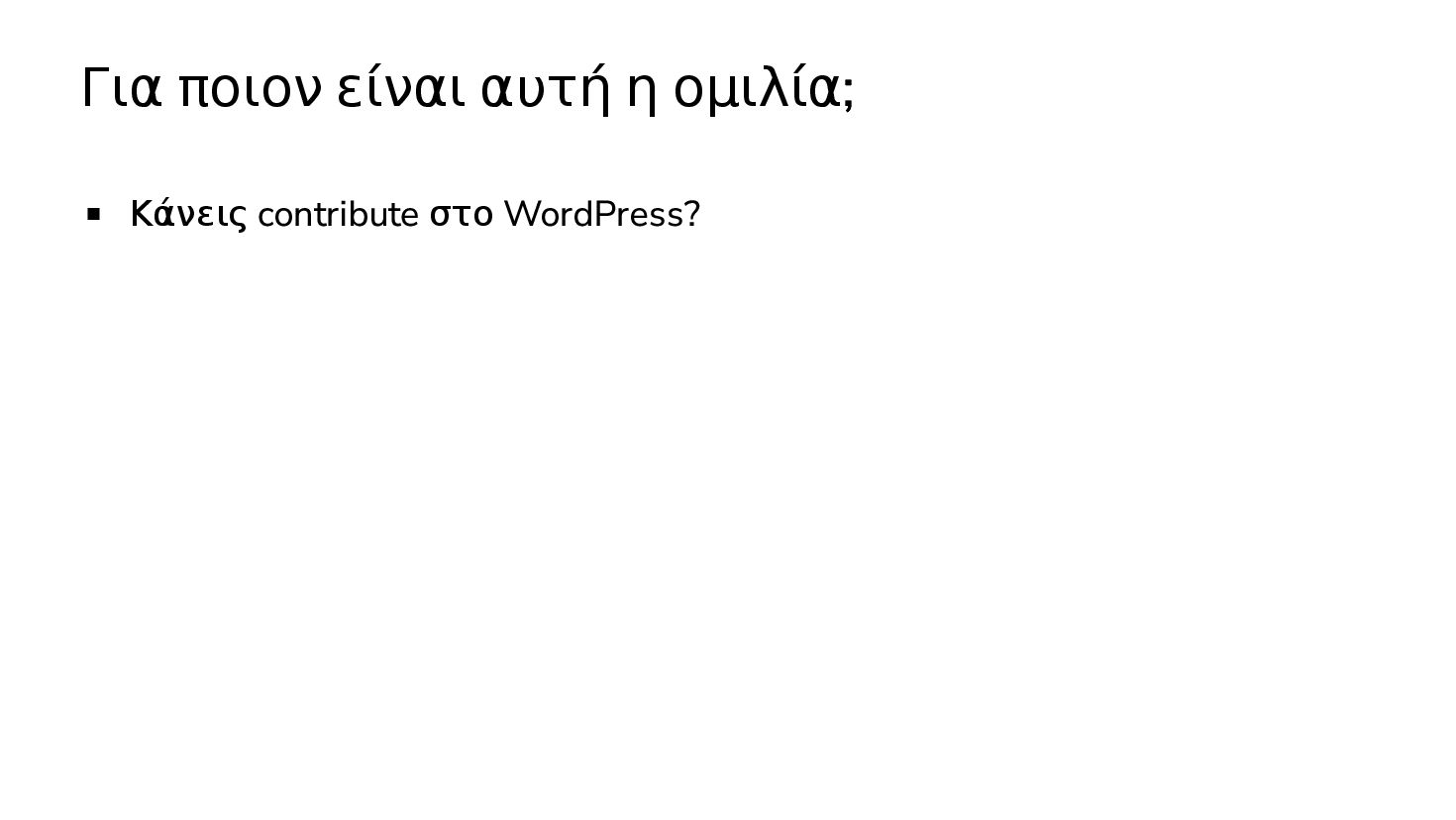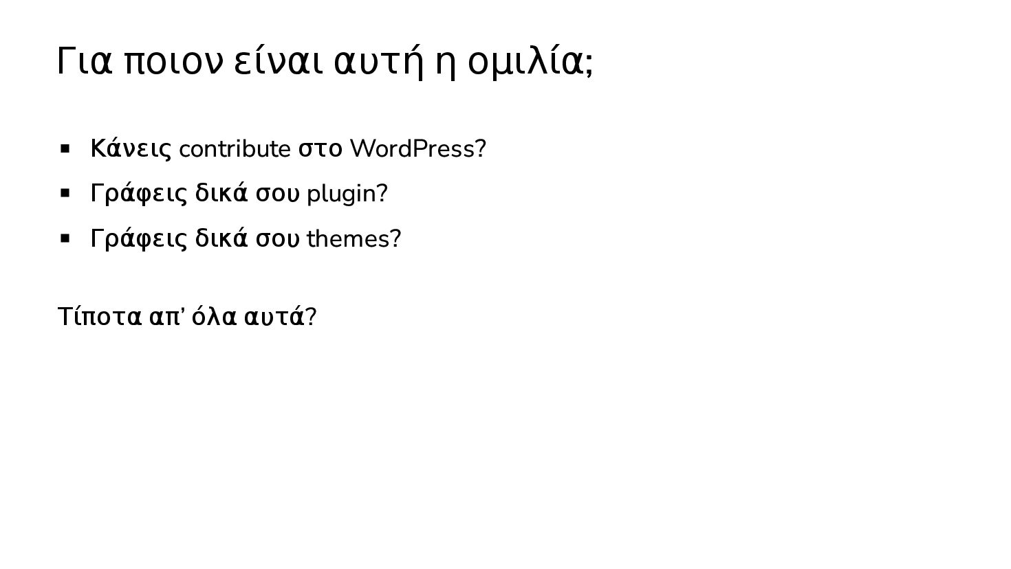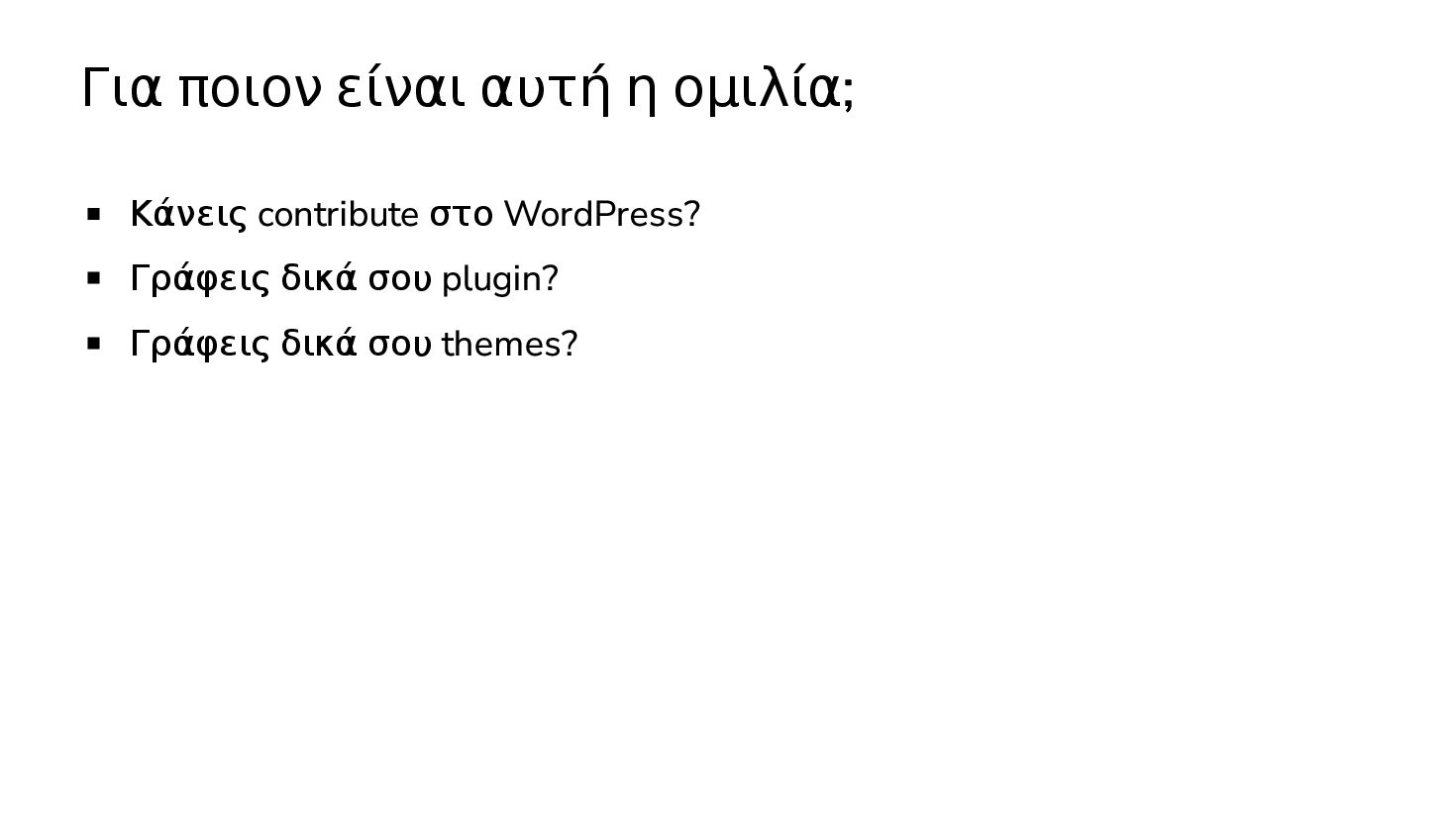 Περιγραφή του project WordPress Coding Standards Τον τρόπο γράφω plugins (classes / functions) Τον τρόπο που γράφω themes (CSS framework, block templates)