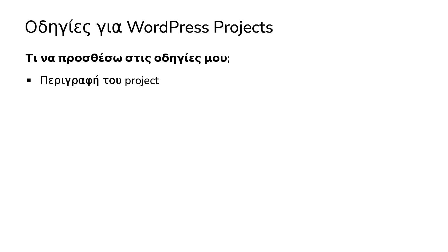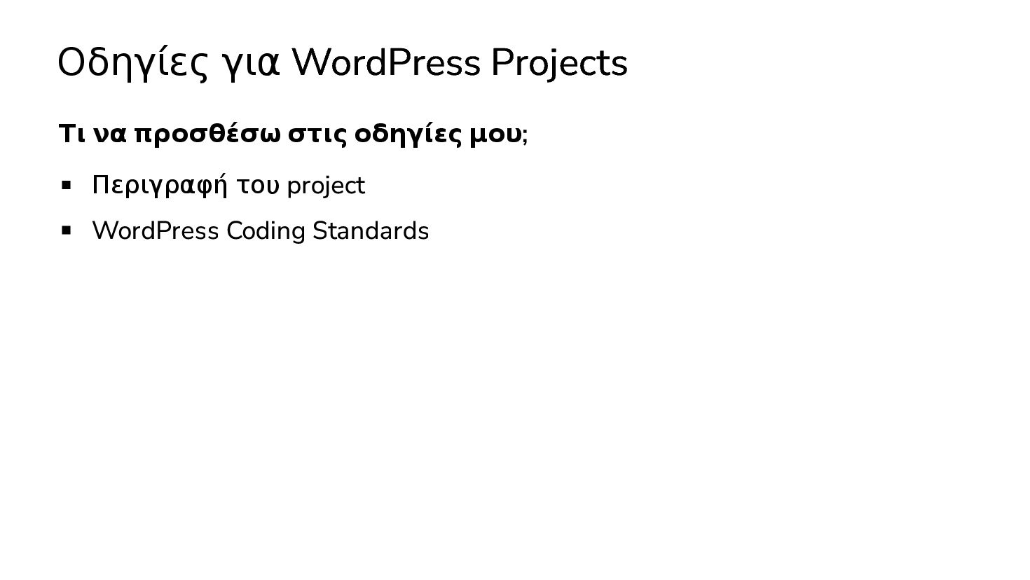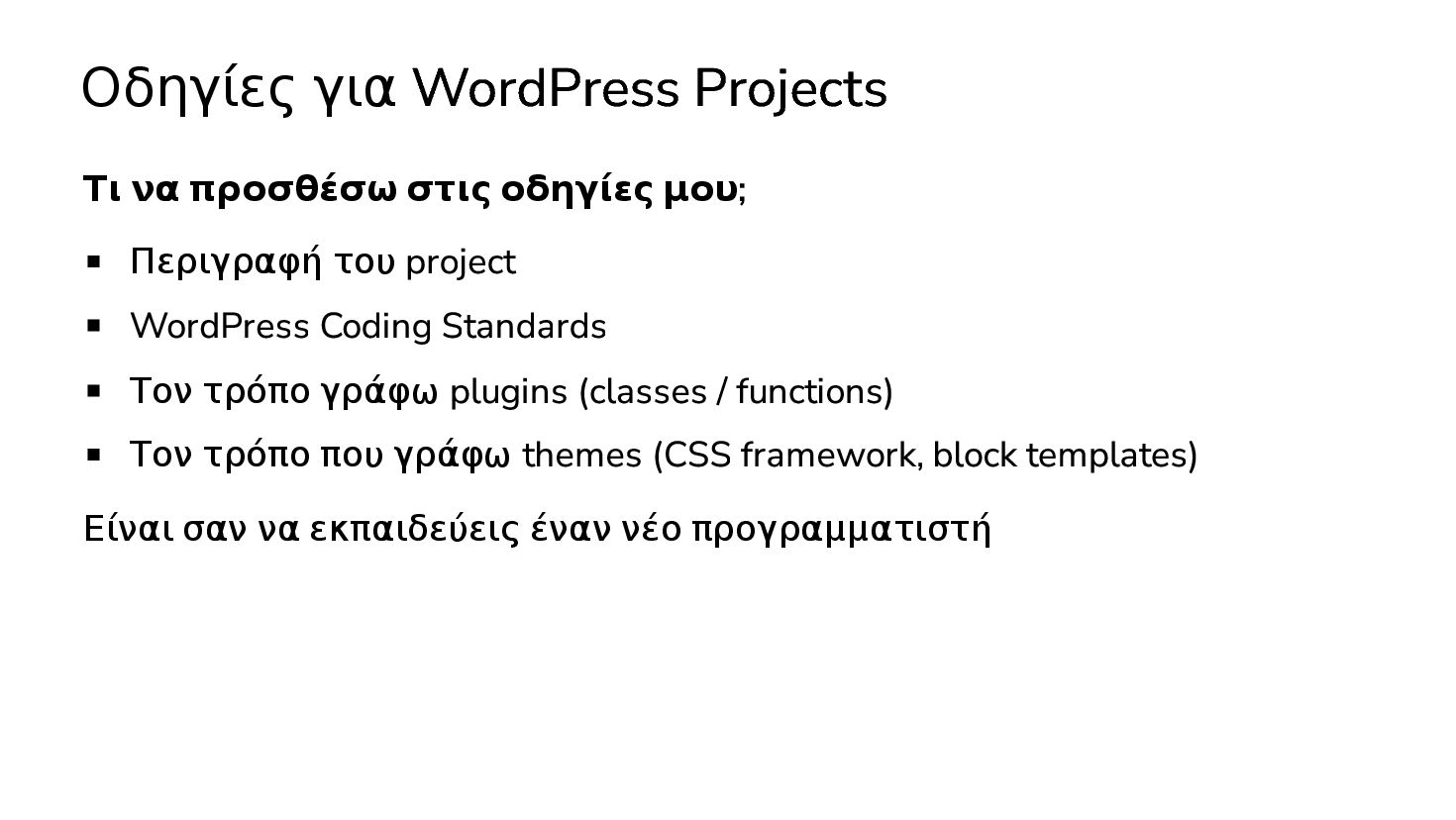 Περιγραφή του project WordPress Coding Standards Τον τρόπο γράφω plugins (classes / functions) Τον τρόπο που γράφω themes (CSS framework, block templates) Είναι σαν να εκπαιδεύεις έναν νέο προγραμματιστή