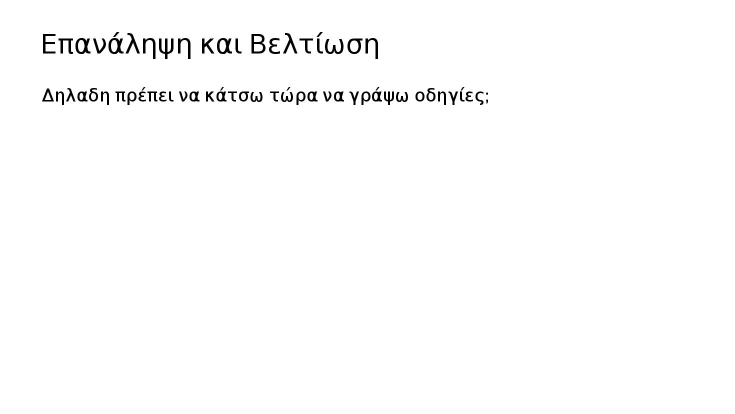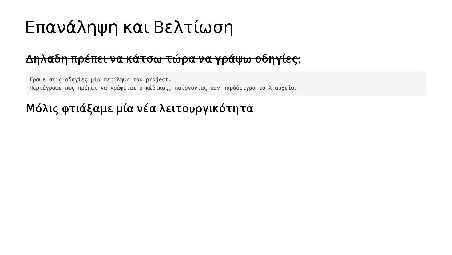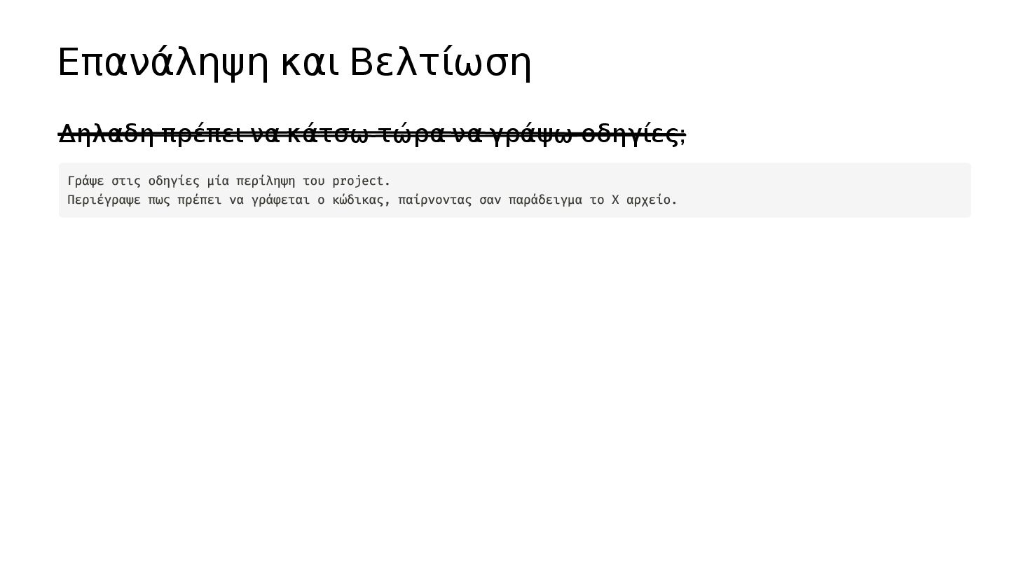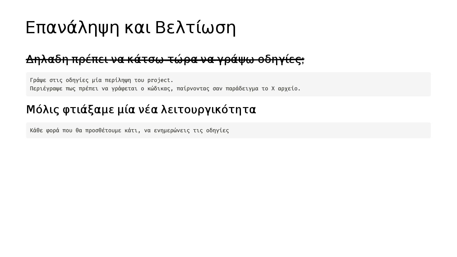 οδηγίες; Μόλις φτιάξαμε μία νέα λειτουργικότητα Γράψε στις οδηγίες μία περίληψη του project. Περιέγραψε πως πρέπει να γράφεται ο κώδικας, παίρνοντας σαν παράδειγμα το Χ αρχείο. Κάθε φορά που θα προσθέτουμε κάτι, να ενημερώνεις τις οδηγίες
