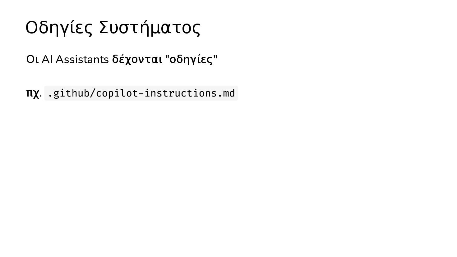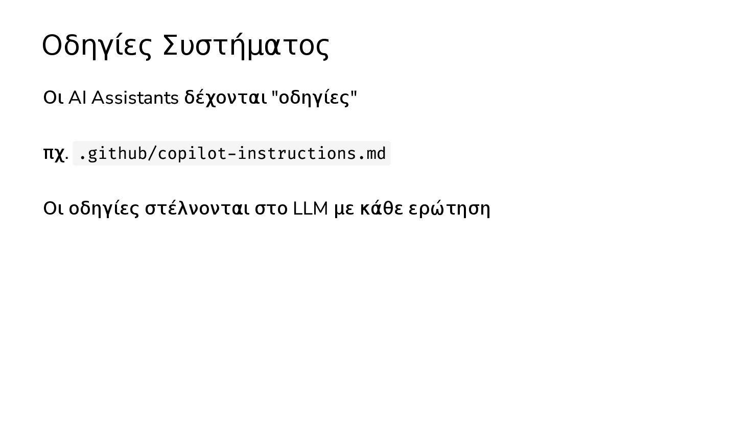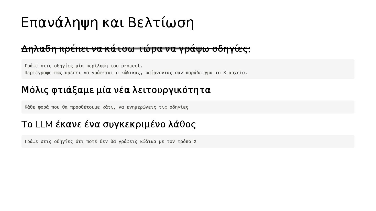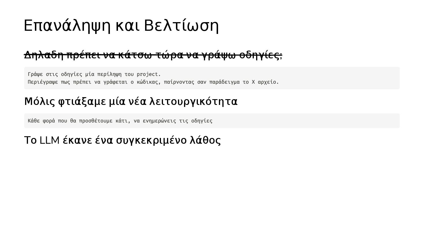 οδηγίες; Μόλις φτιάξαμε μία νέα λειτουργικότητα Το LLM έκανε ένα συγκεκριμένο λάθος Γράψε στις οδηγίες μία περίληψη του project. Περιέγραψε πως πρέπει να γράφεται ο κώδικας, παίρνοντας σαν παράδειγμα το Χ αρχείο. Κάθε φορά που θα προσθέτουμε κάτι, να ενημερώνεις τις οδηγίες Γράψε στις οδηγίες ότι ποτέ δεν θα γράφεις κώδικα με τον τρόπο Χ