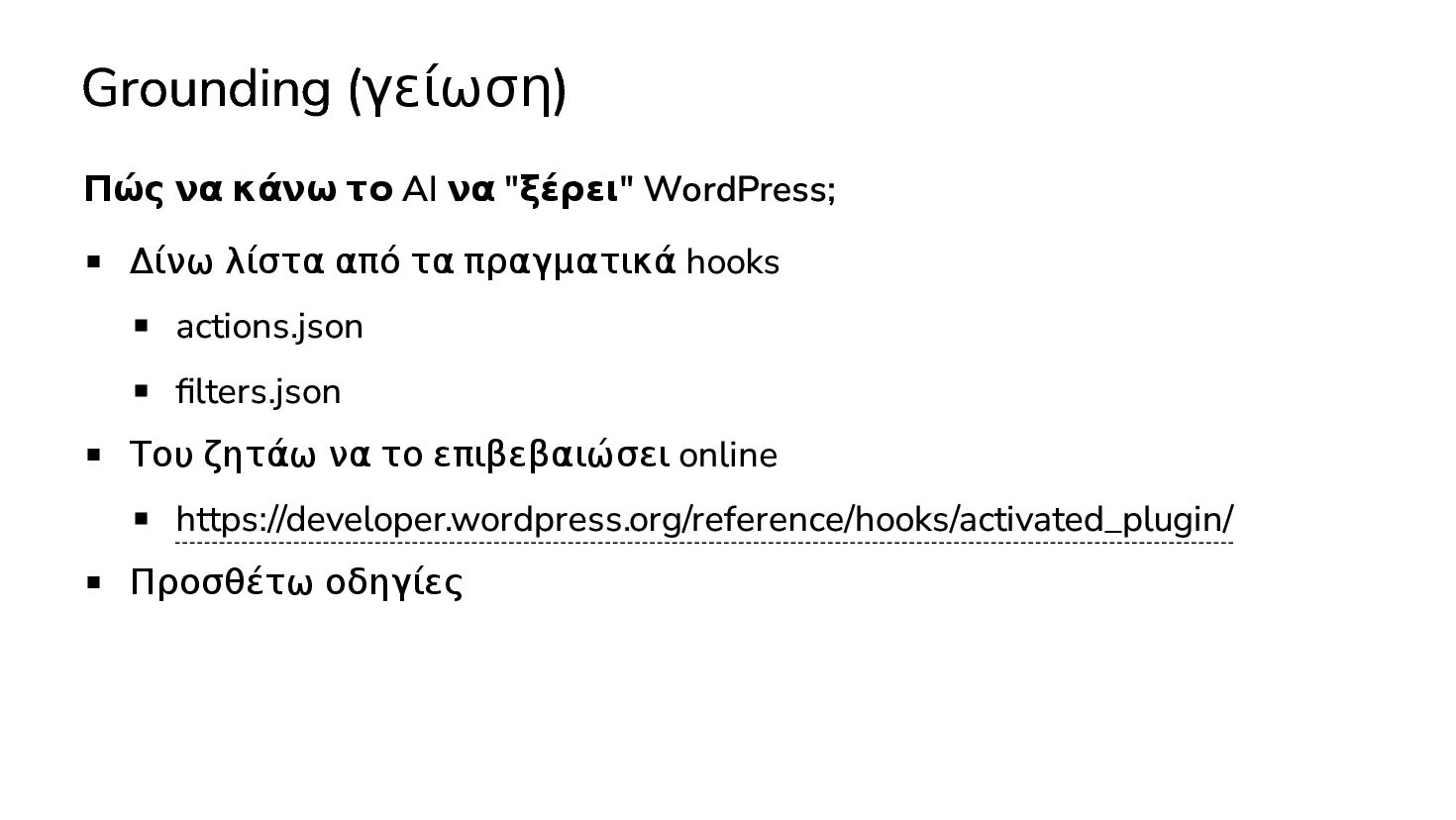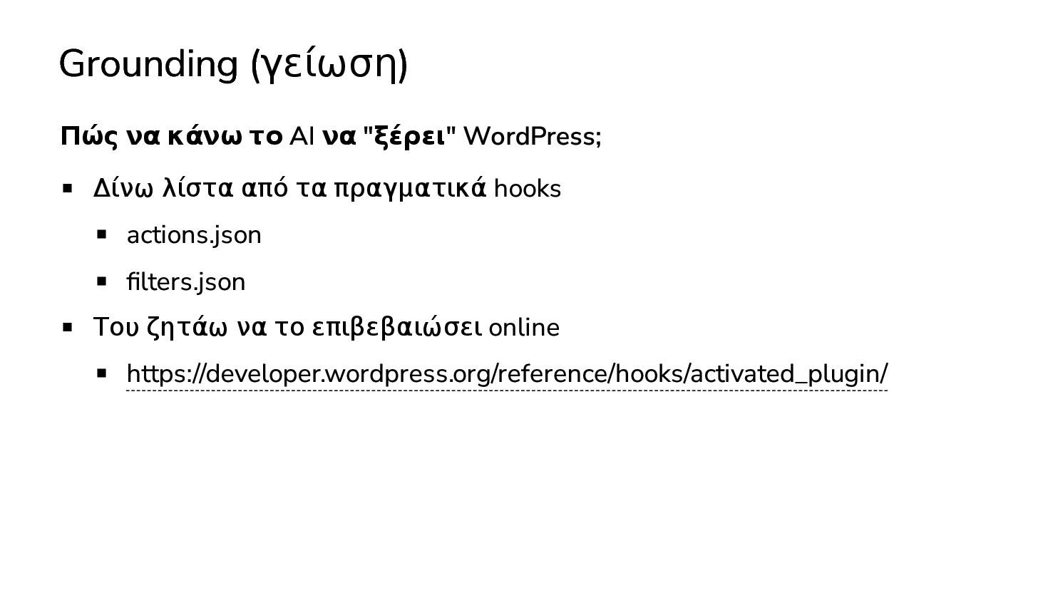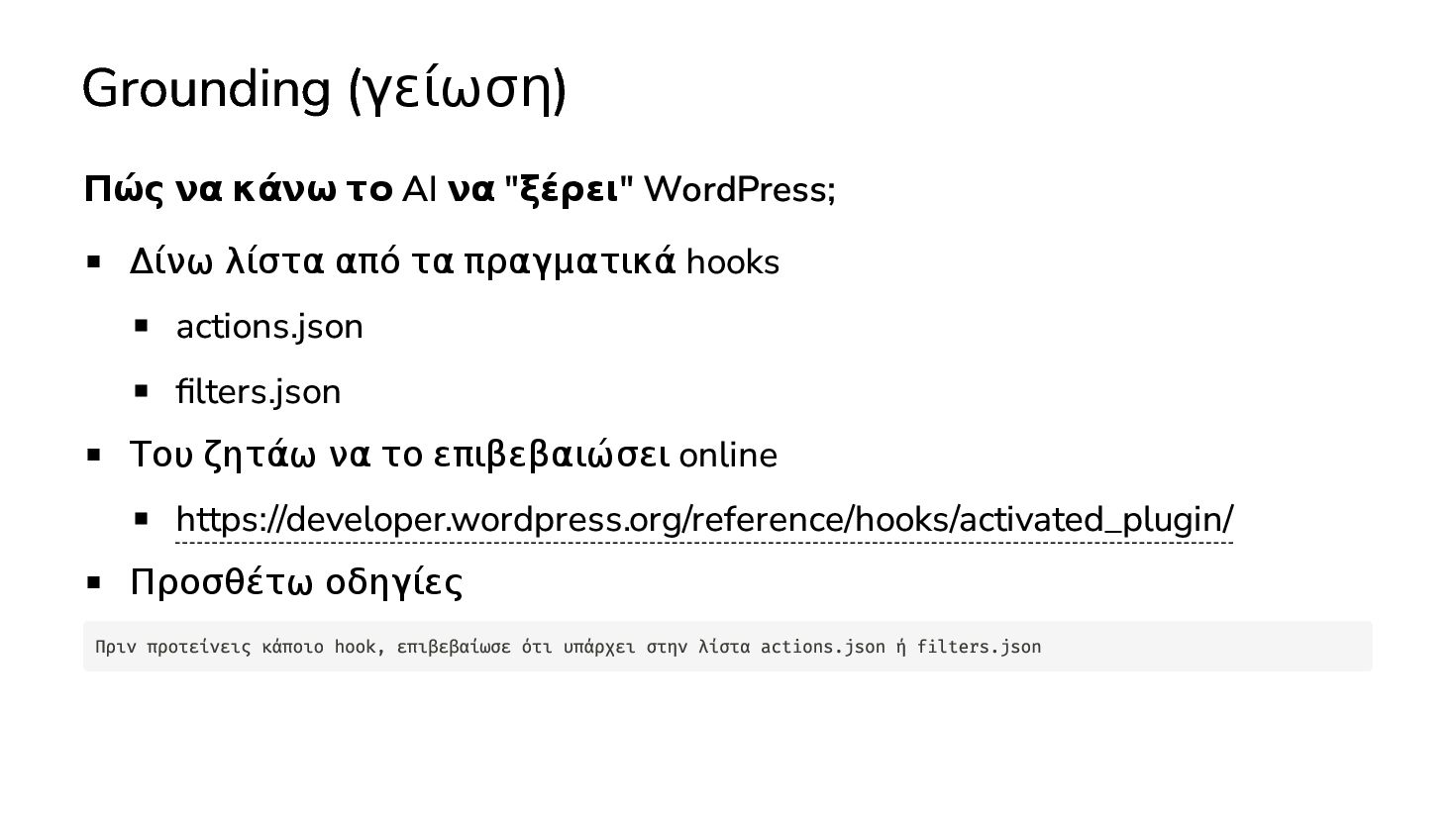 Δίνω λίστα από τα πραγματικά hooks actions.json filters.json Του ζητάω να το επιβεβαιώσει online https://developer.wordpress.org/reference/hooks/activated_plugin/ Προσθέτω οδηγίες