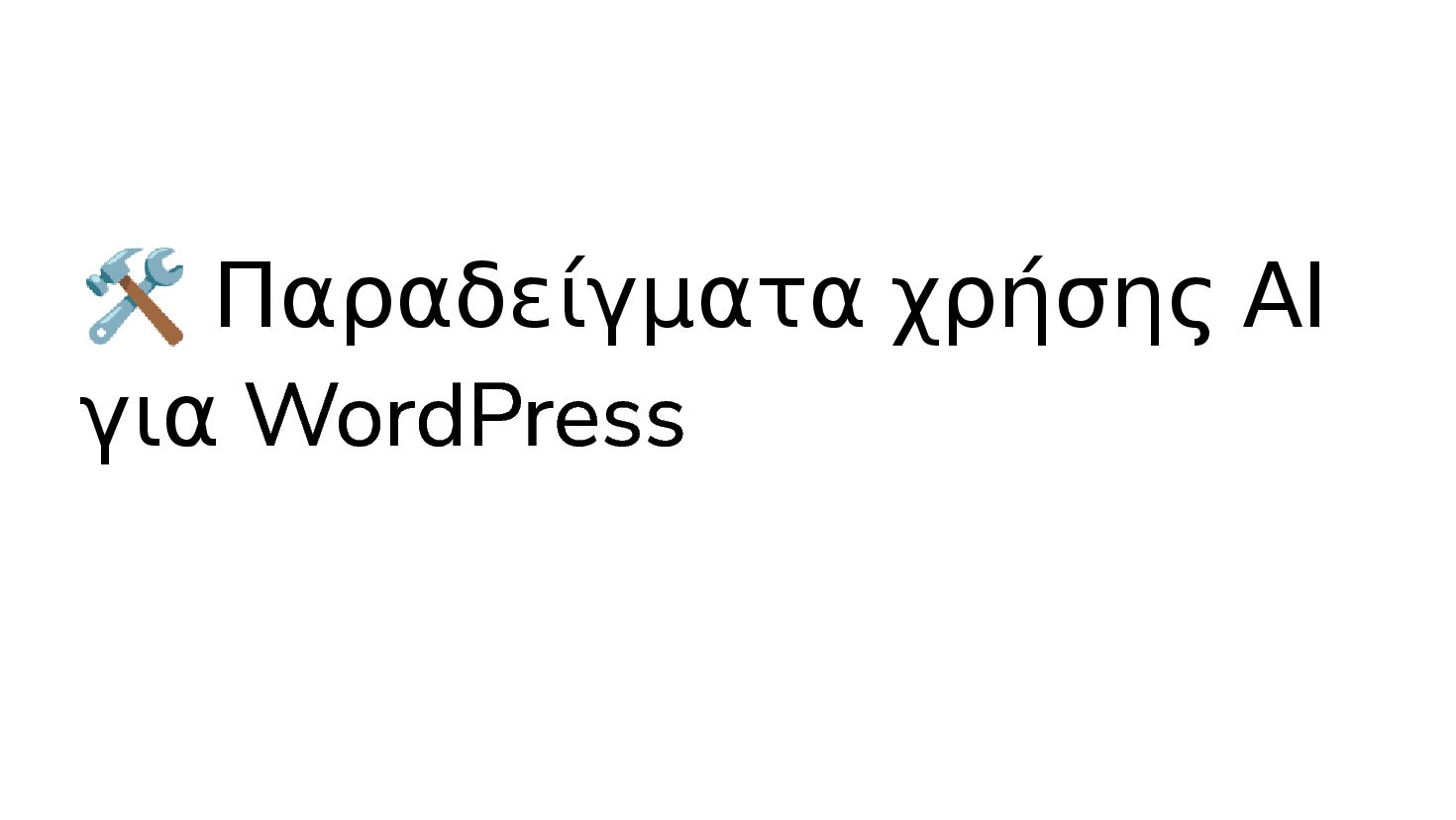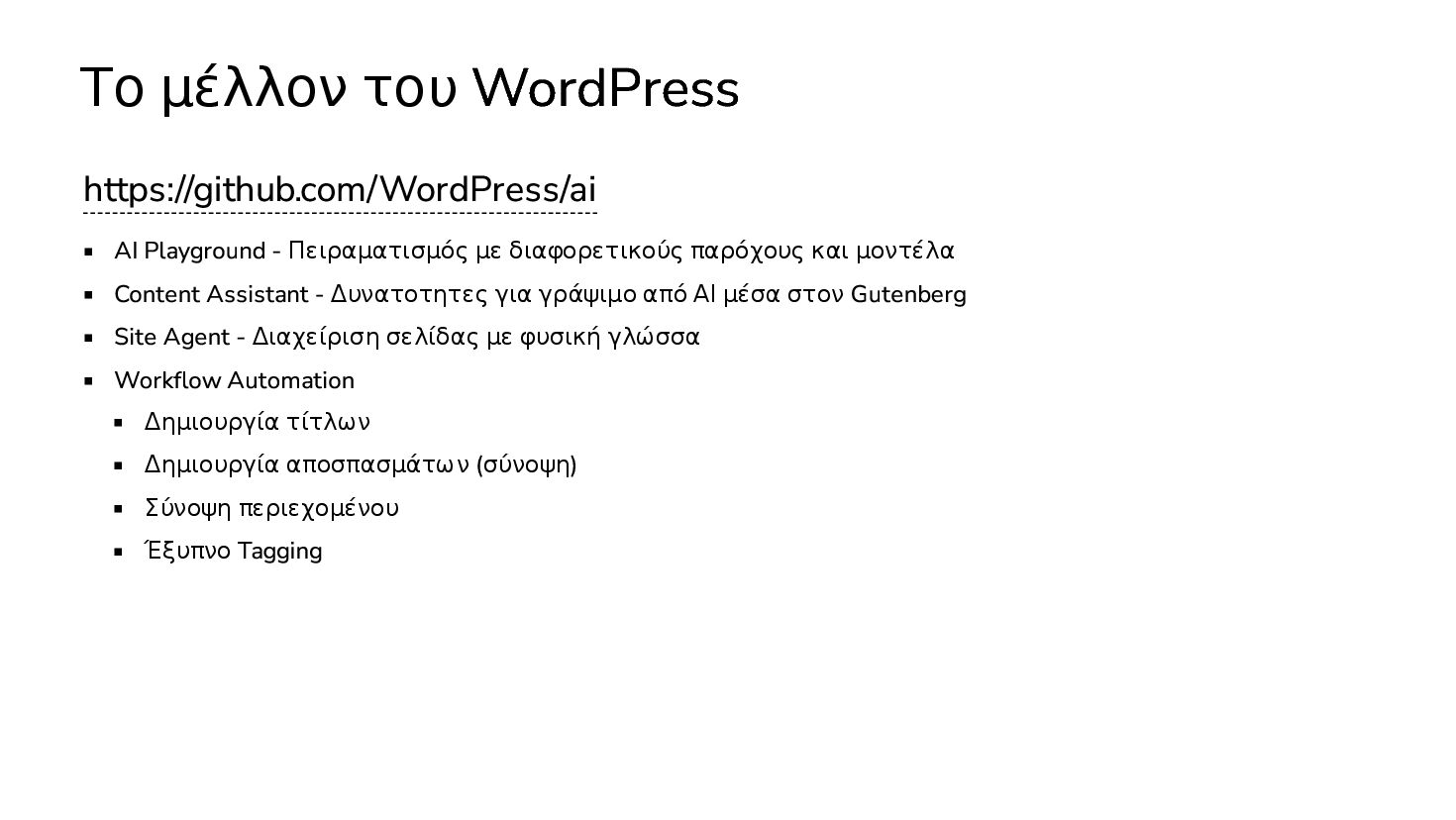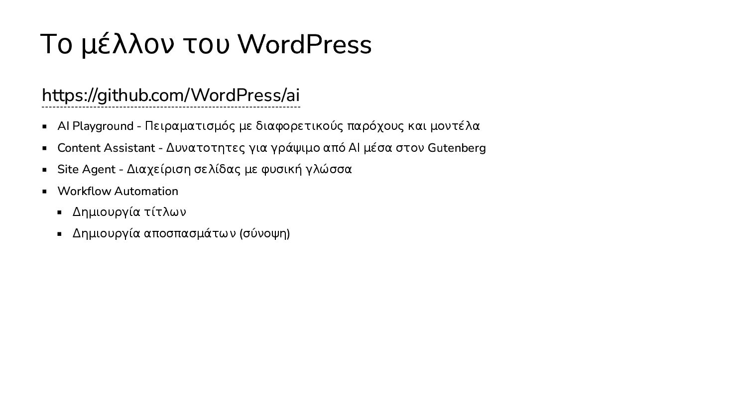 διαφορετικούς παρόχους και μοντέλα Content Assistant - Δυνατοτητες για γράψιμο από ΑΙ μέσα στον Gutenberg Site Agent - Διαχείριση σελίδας με φυσική γλώσσα Workflow Automation Δημιουργία τίτλων Δημιουργία αποσπασμάτων (σύνοψη)