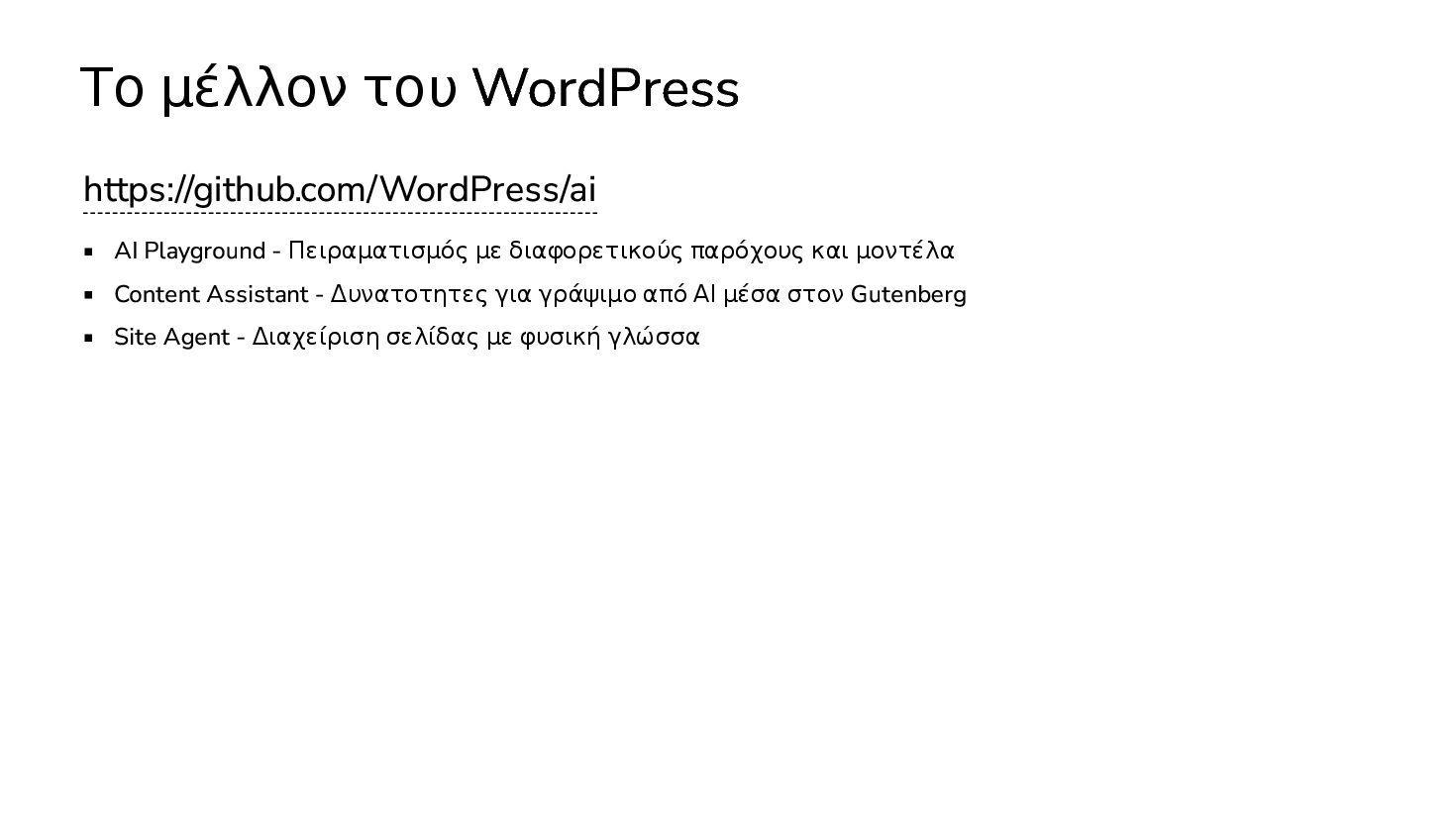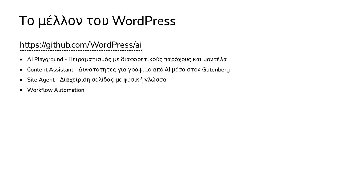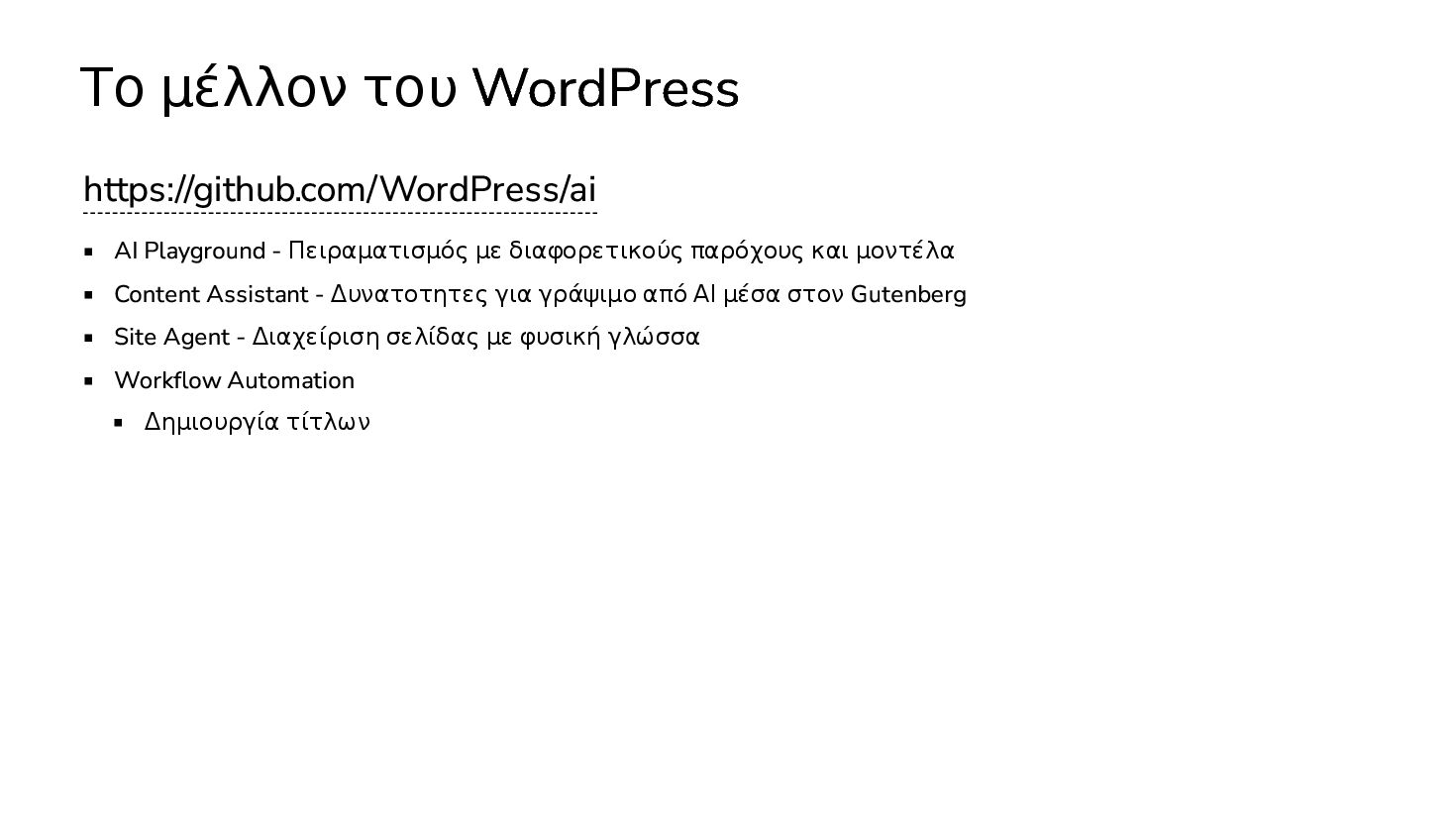 διαφορετικούς παρόχους και μοντέλα Content Assistant - Δυνατοτητες για γράψιμο από ΑΙ μέσα στον Gutenberg Site Agent - Διαχείριση σελίδας με φυσική γλώσσα Workflow Automation Δημιουργία τίτλων Δημιουργία αποσπασμάτων (σύνοψη)