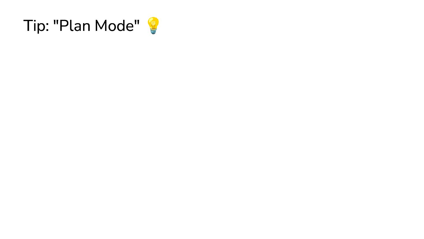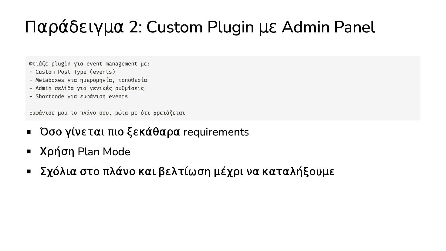 ξεκάθαρα requirements Χρήση Plan Mode Σχόλια στο πλάνο και βελτίωση μέχρι να καταλήξουμε Φτιάξε plugin για event management με: - Custom Post Type (events) - Metaboxes για ημερομηνία, τοποθεσία - Admin σελίδα για γενικές ρυθμίσεις - Shortcode για εμφάνιση events Εμφάνισε μου το πλάνο σου, ρώτα με ότι χρειάζεται