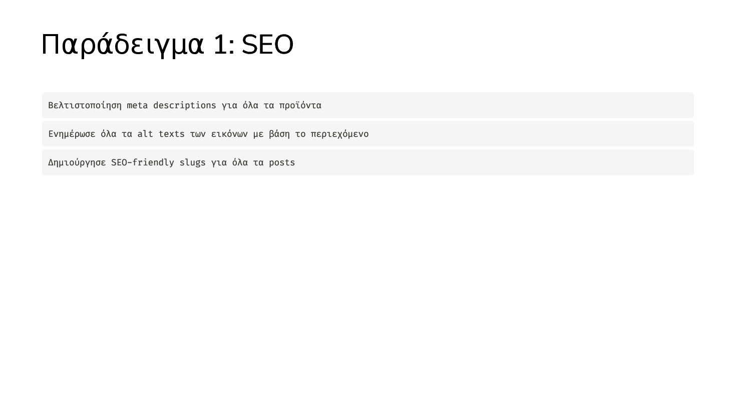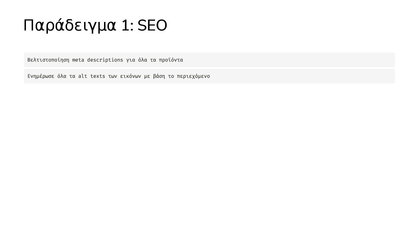 αλλαγές Βελτιστοποίηση meta descriptions για όλα τα προϊόντα Ενημέρωσε όλα τα alt texts των εικόνων με βάση το περιεχόμενο Δημιούργησε SEO-friendly slugs για όλα τα posts