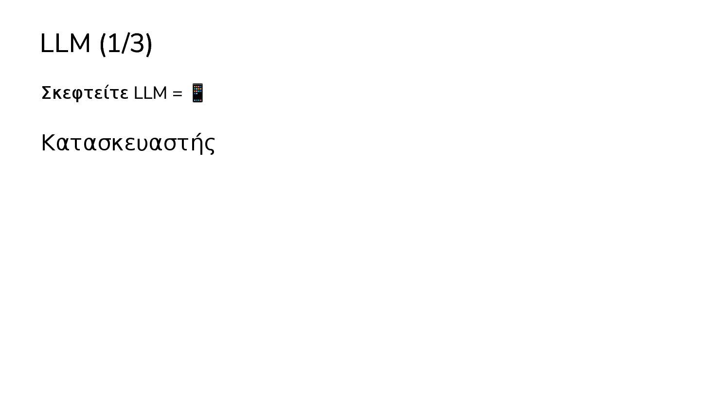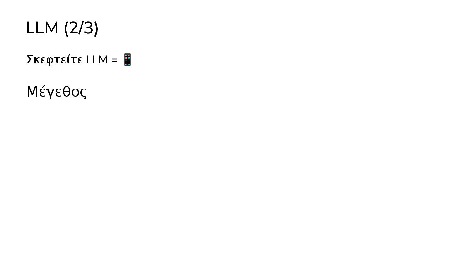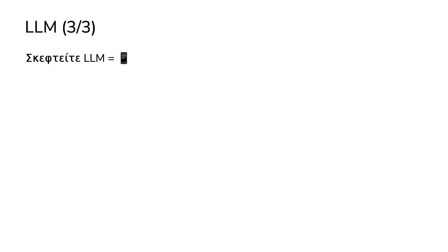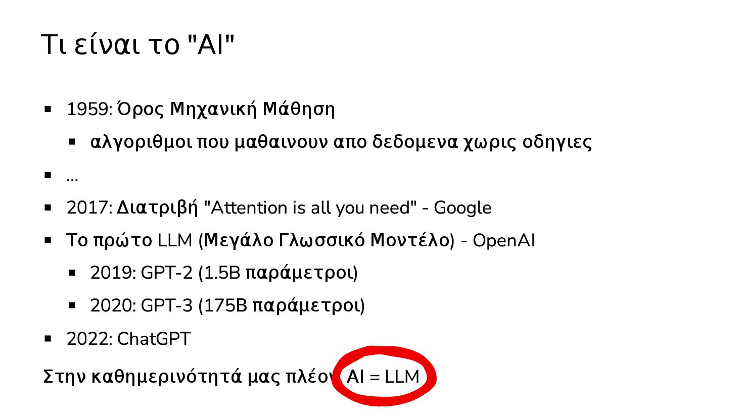 μαθαινουν απο δεδομενα χωρις οδηγιες … 2017: Διατριβή "Attention is all you need" - Google Το πρώτο LLM (Μεγάλο Γλωσσικό Μοντέλο) - OpenAI 2019: GPT-2 (1.5B παράμετροι) 2020: GPT-3 (175Β παράμετροι) 2022: ChatGPT Στην καθημερινότητά μας πλέον, ΑΙ = LLM