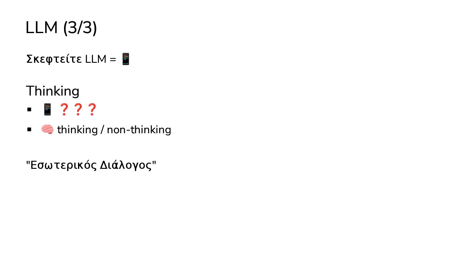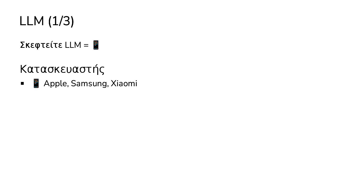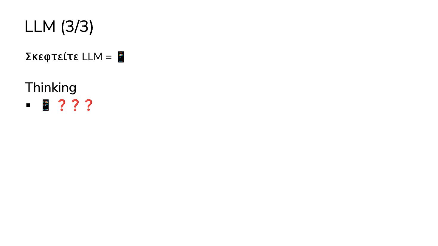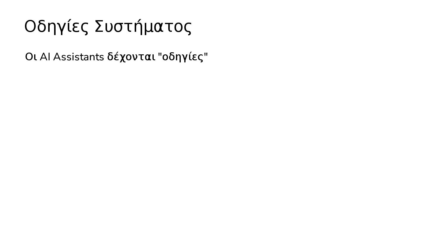 μαθαινουν απο δεδομενα χωρις οδηγιες … 2017: Διατριβή "Attention is all you need" - Google Το πρώτο LLM (Μεγάλο Γλωσσικό Μοντέλο) - OpenAI 2019: GPT-2 (1.5B παράμετροι) 2020: GPT-3 (175Β παράμετροι) 2022: ChatGPT Στην καθημερινότητά μας πλέον, ΑΙ = LLM