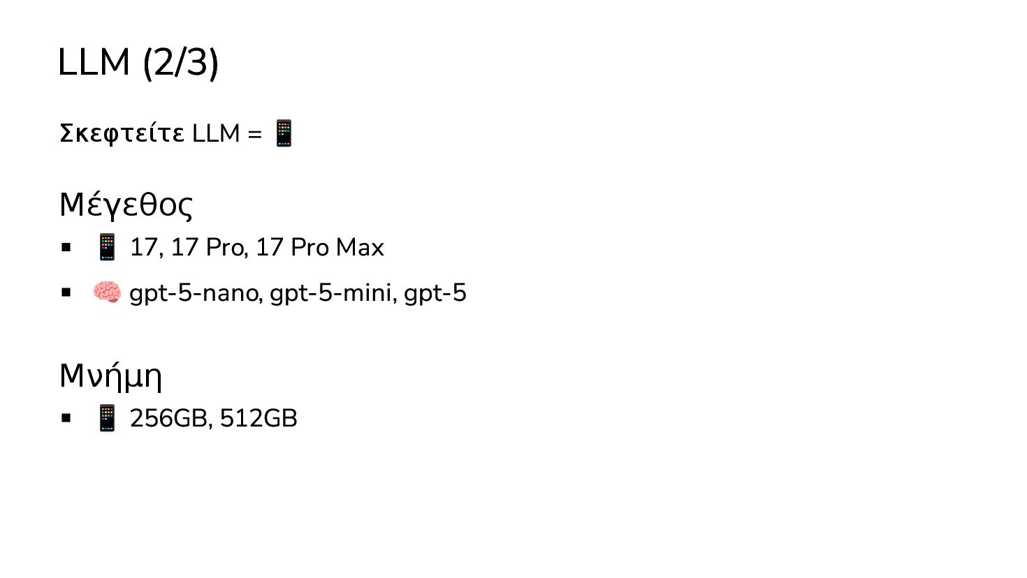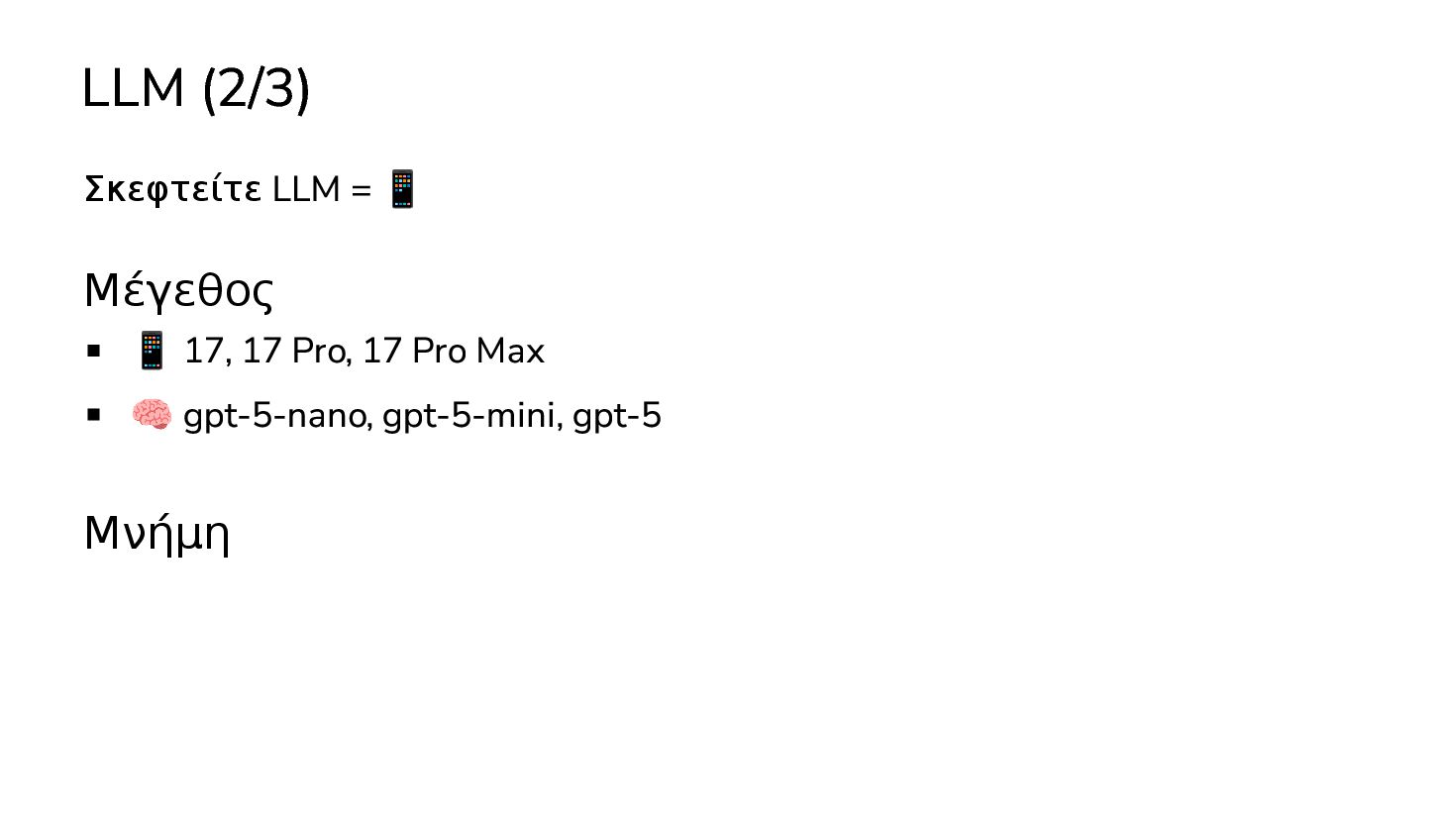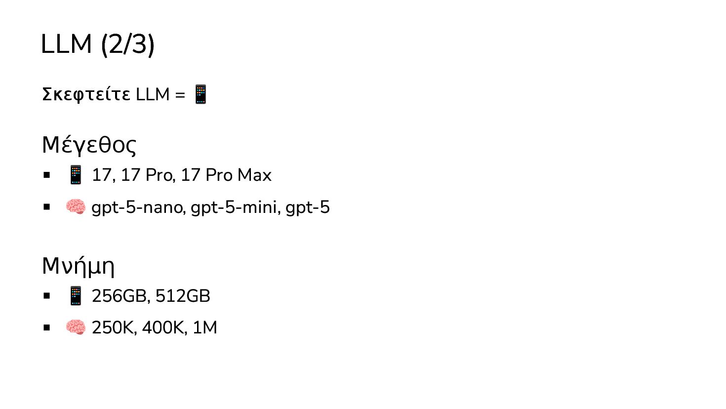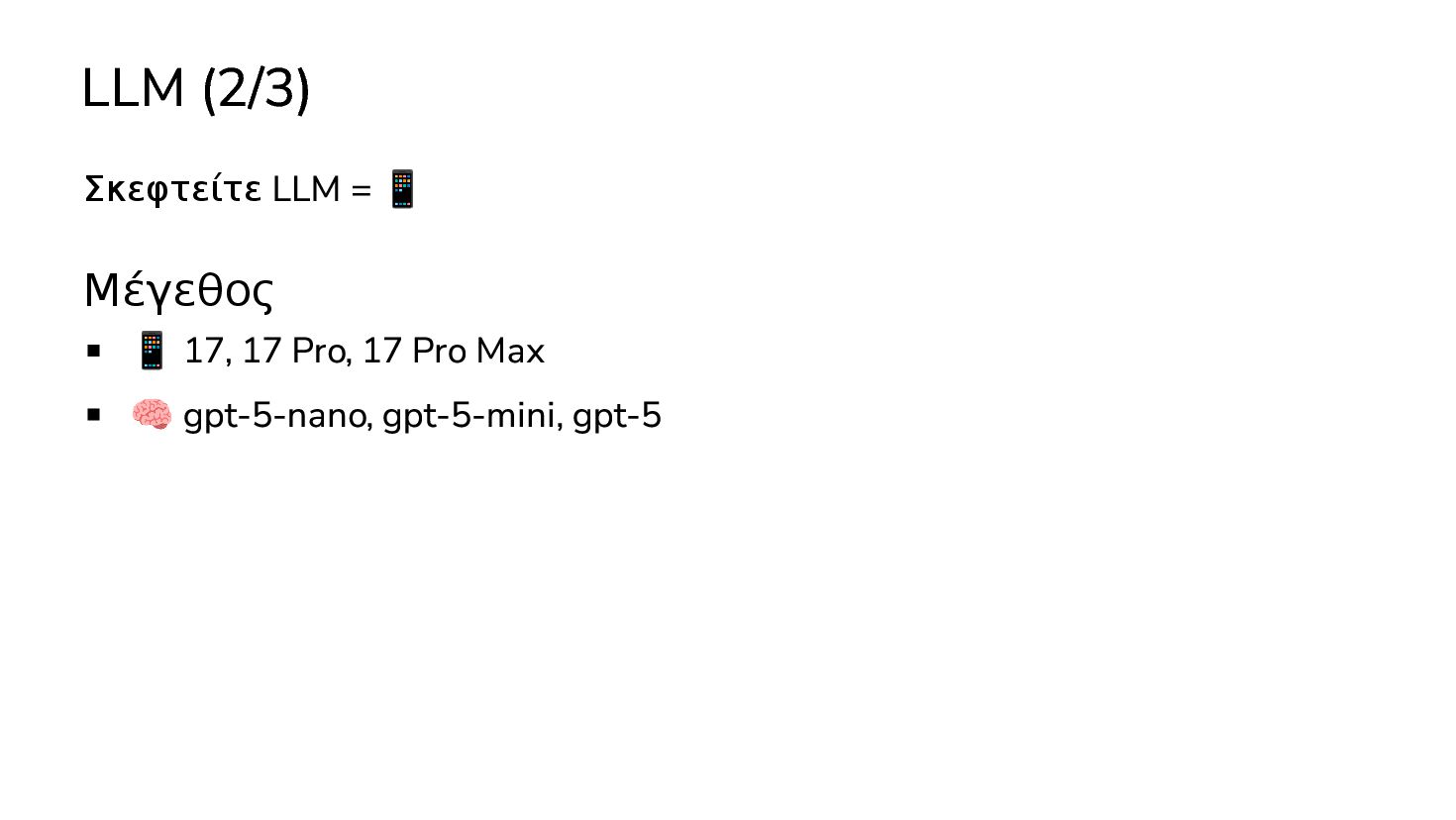μαθαινουν απο δεδομενα χωρις οδηγιες … 2017: Διατριβή "Attention is all you need" - Google Το πρώτο LLM (Μεγάλο Γλωσσικό Μοντέλο) - OpenAI 2019: GPT-2 (1.5B παράμετροι) 2020: GPT-3 (175Β παράμετροι) 2022: ChatGPT Στην καθημερινότητά μας πλέον, ΑΙ = LLM
