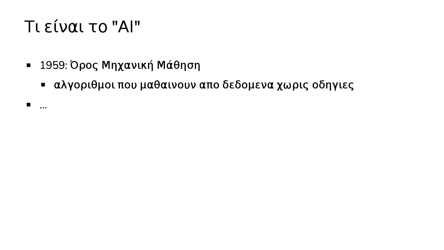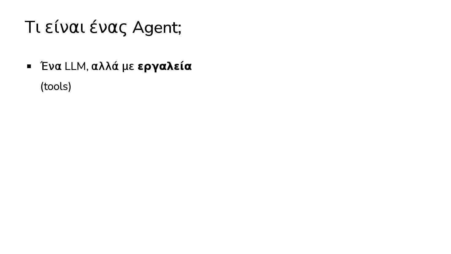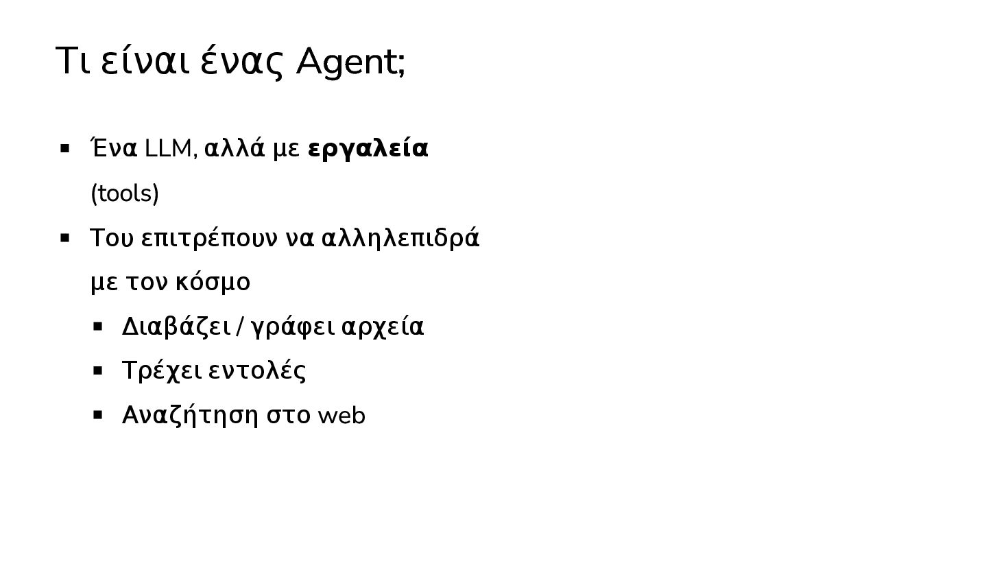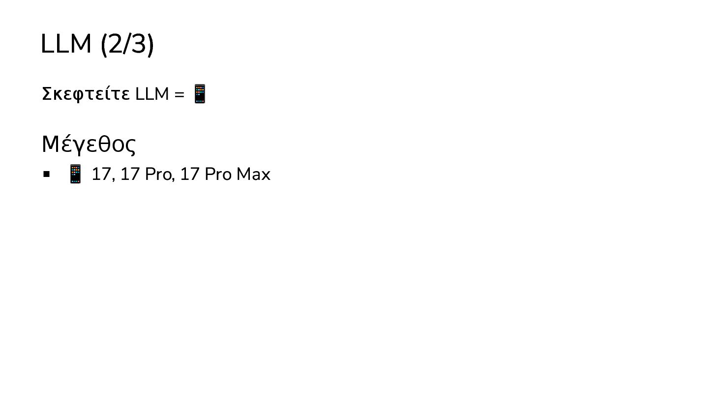 μαθαινουν απο δεδομενα χωρις οδηγιες … 2017: Διατριβή "Attention is all you need" - Google Το πρώτο LLM (Μεγάλο Γλωσσικό Μοντέλο) - OpenAI 2019: GPT-2 (1.5B παράμετροι) 2020: GPT-3 (175Β παράμετροι) 2022: ChatGPT Στην καθημερινότητά μας πλέον, ΑΙ = LLM