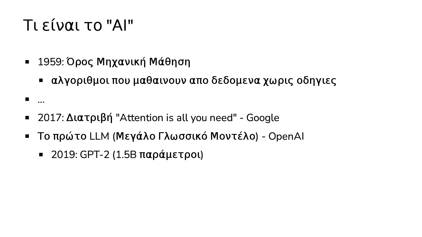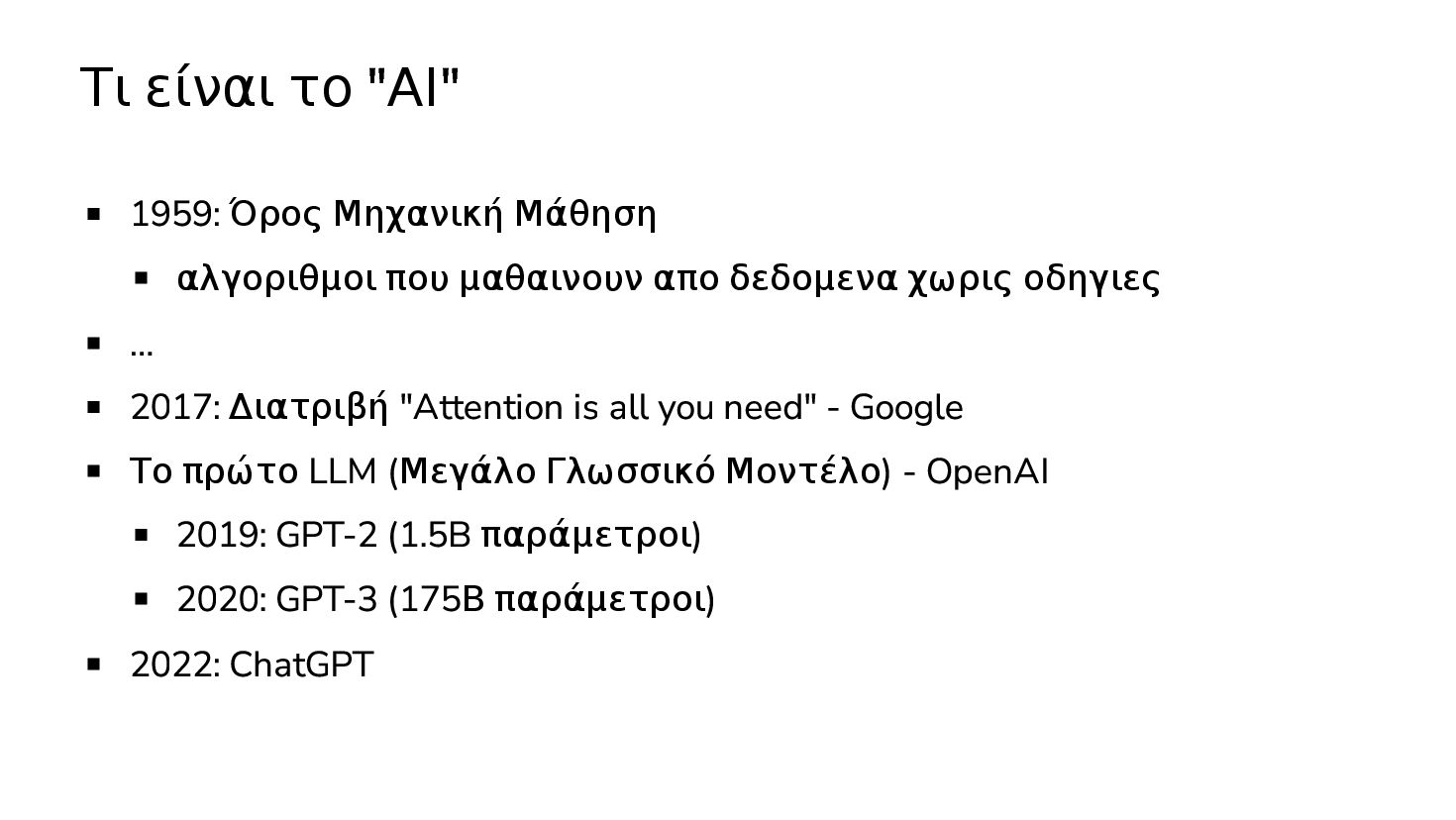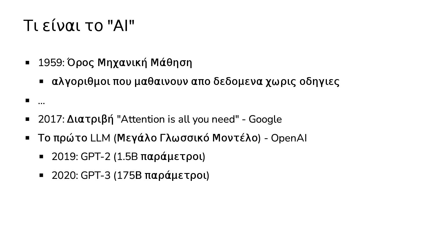 μαθαινουν απο δεδομενα χωρις οδηγιες … 2017: Διατριβή "Attention is all you need" - Google Το πρώτο LLM (Μεγάλο Γλωσσικό Μοντέλο) - OpenAI 2019: GPT-2 (1.5B παράμετροι) 2020: GPT-3 (175Β παράμετροι)