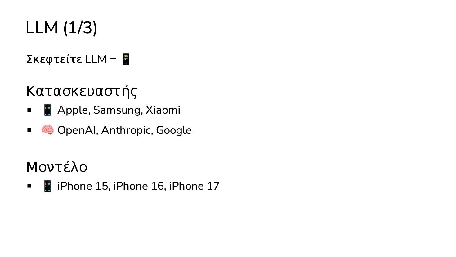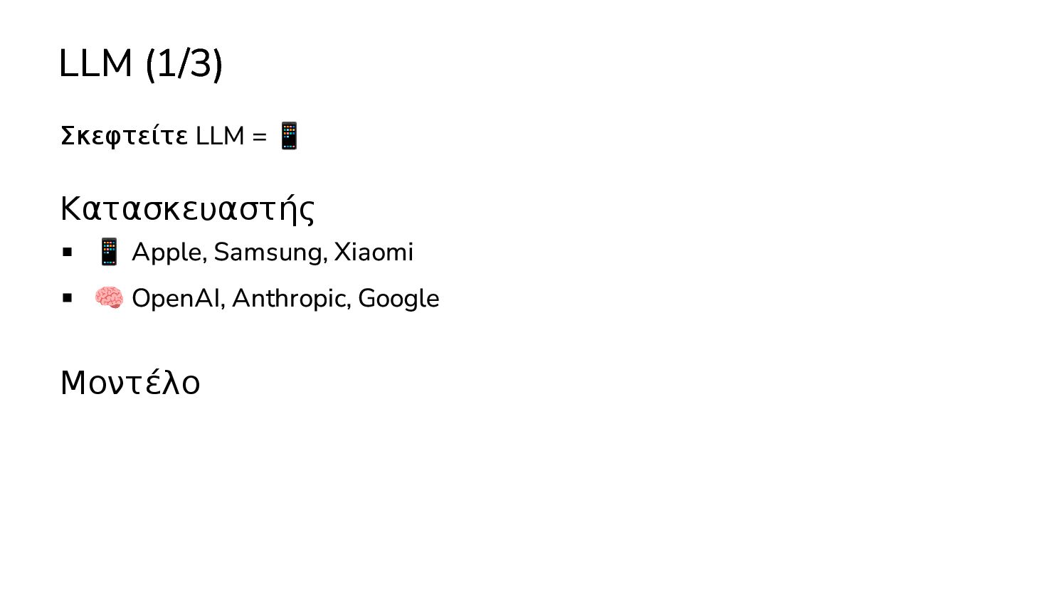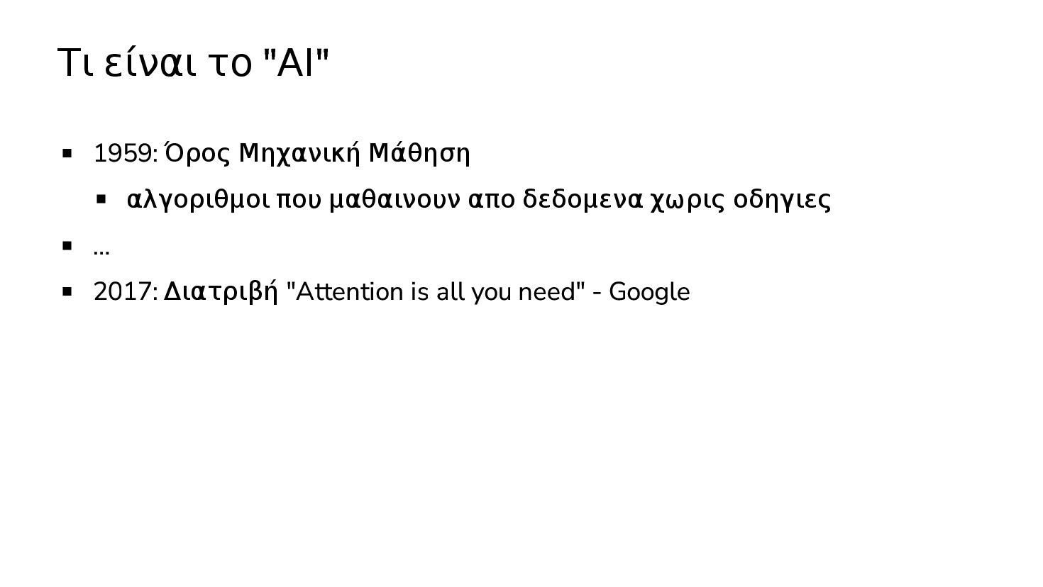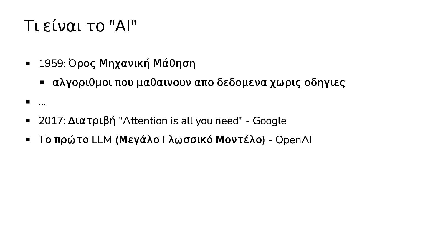 μαθαινουν απο δεδομενα χωρις οδηγιες … 2017: Διατριβή "Attention is all you need" - Google Το πρώτο LLM (Μεγάλο Γλωσσικό Μοντέλο) - OpenAI 2019: GPT-2 (1.5B παράμετροι) 2020: GPT-3 (175Β παράμετροι)