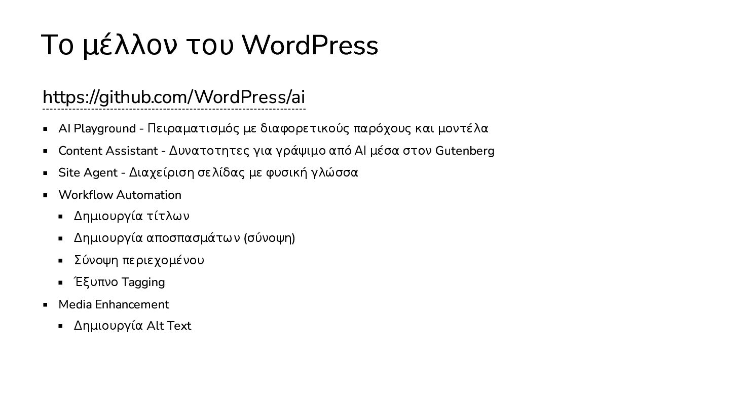 διαφορετικούς παρόχους και μοντέλα Content Assistant - Δυνατοτητες για γράψιμο από ΑΙ μέσα στον Gutenberg Site Agent - Διαχείριση σελίδας με φυσική γλώσσα Workflow Automation Δημιουργία τίτλων Δημιουργία αποσπασμάτων (σύνοψη) Σύνοψη περιεχομένου Έξυπνο Tagging Media Enhancement Δημιουργία Alt Text