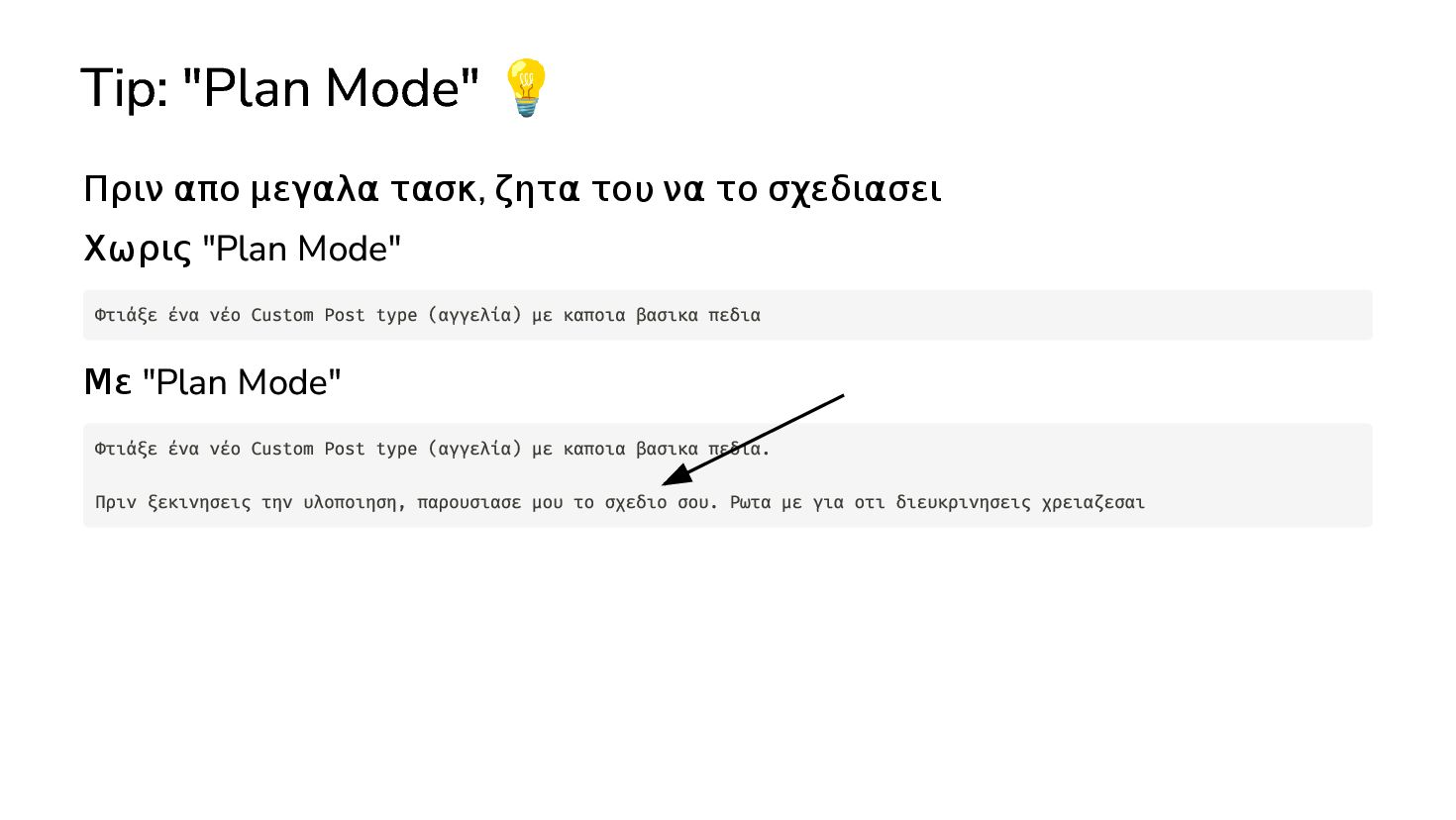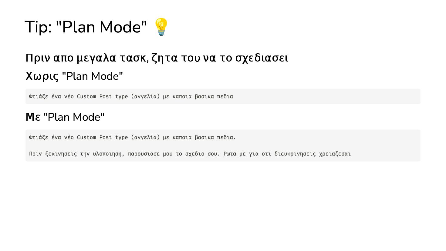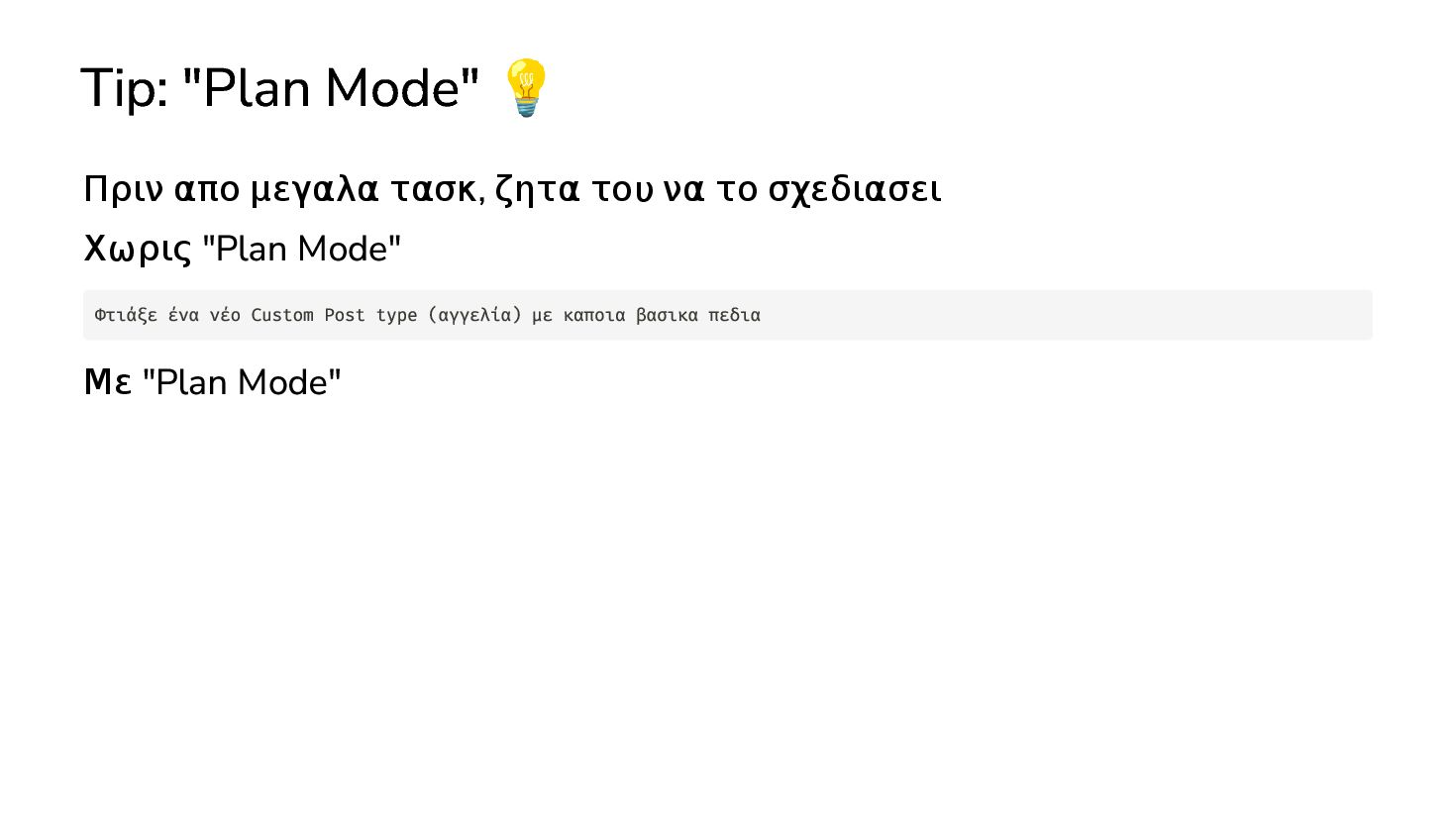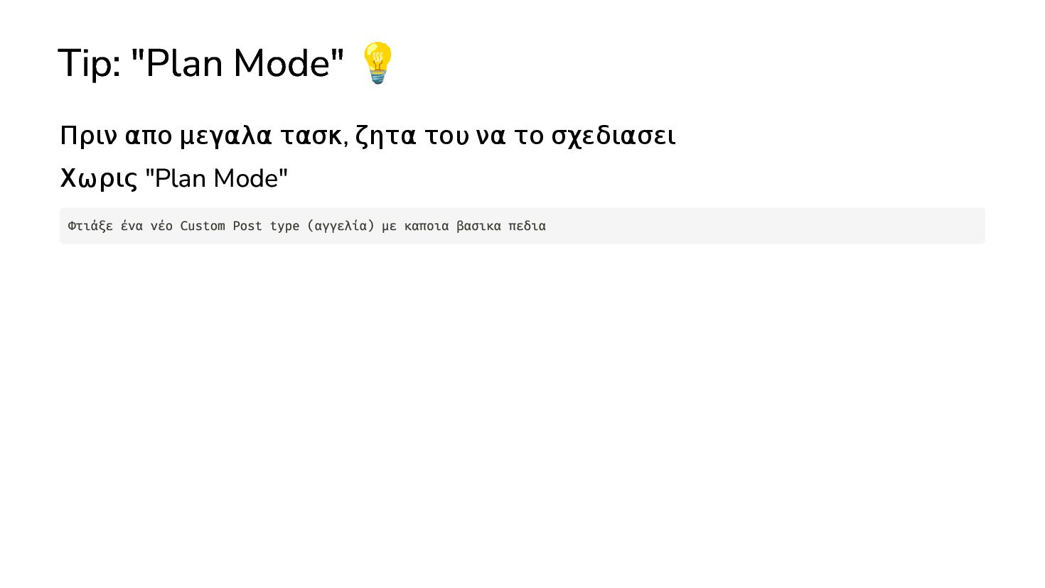 να το σχεδιασει Χωρις "Plan Mode" Με "Plan Mode" Φτιάξε ένα νέο Custom Post type (αγγελία) με καποια βασικα πεδια Φτιάξε ένα νέο Custom Post type (αγγελία) με καποια βασικα πεδια. Πριν ξεκινησεις την υλοποιηση, παρουσιασε μου το σχεδιο σου. Ρωτα με για οτι διευκρινησεις χρειαζεσαι