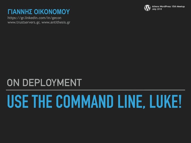 VCS (hg, svn) ▸ command line/scripting/automation ▸ ταυτόχρονα πολλοί developers στα ίδια αρχεία ▸ ποιός άλλαξε τί και πότε; ▸ history & rollback ▸ θέλουμε τον δικό μας κώδικα versioned: ▸ όχι όλο το WordPress core! ▸ όχι plugins τρίτων! ▸ όχι configuration!