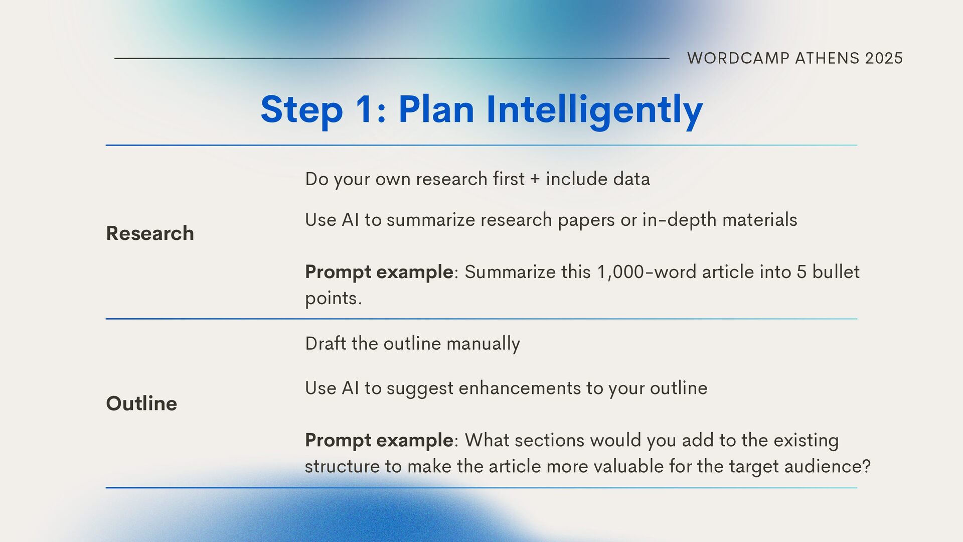 own research first + include data Outline Use AI to summarize research papers or in-depth materials Prompt example: Summarize this 1,000-word article into 5 bullet points. Draft the outline manually Use AI to suggest enhancements to your outline Prompt example: What sections would you add to the existing structure to make the article more valuable for the target audience?